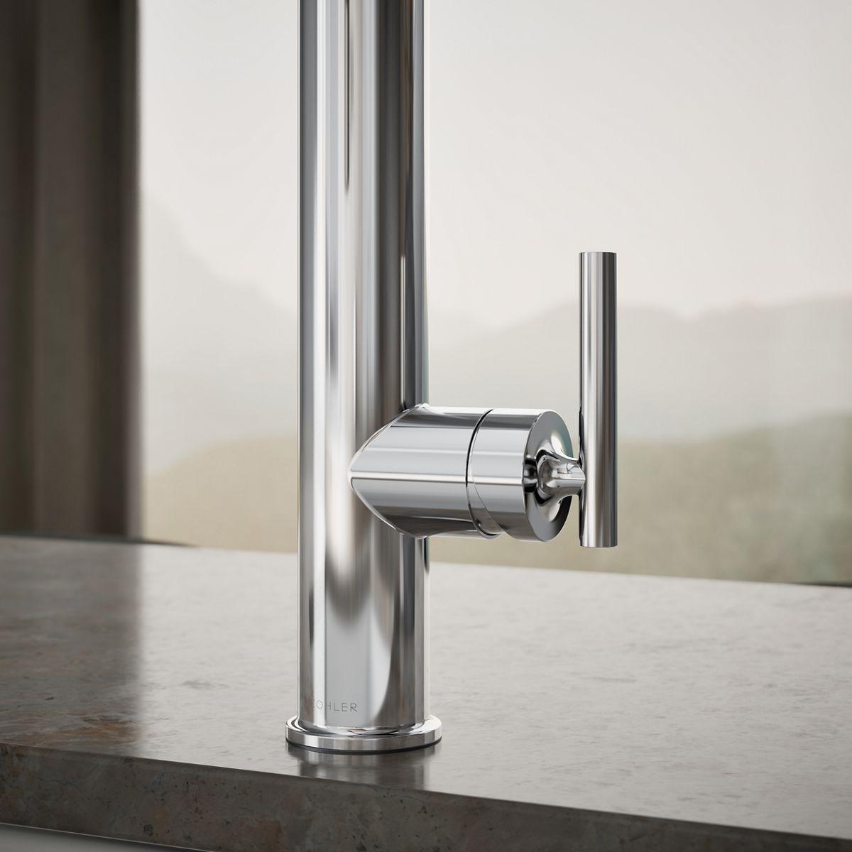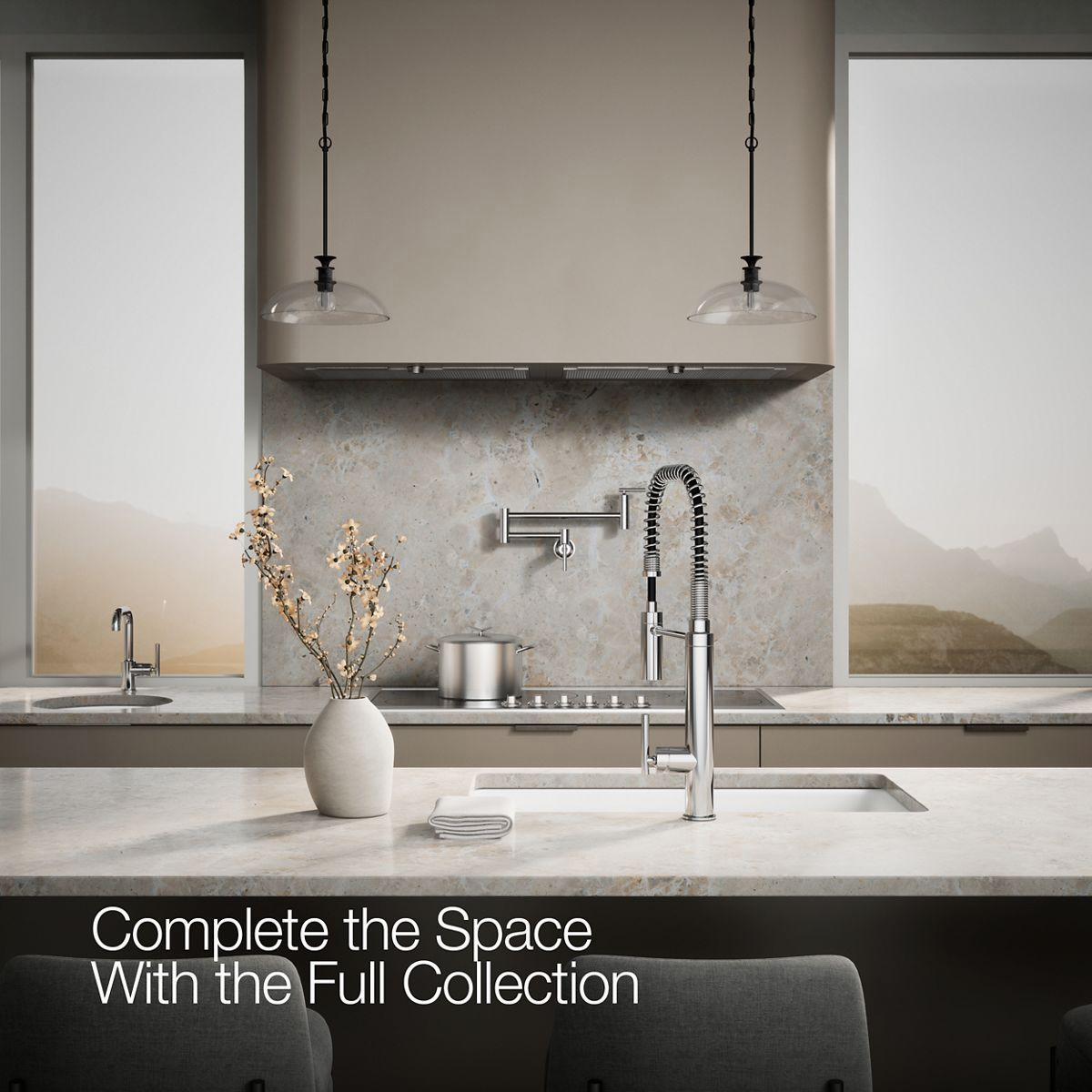 Complete kitchen tasks with more ease and efficiency. This Purist kitchen faucet combines a strong architectural form with features adapted from the busiest professional kitchens. The three-function sprayhead lets you cycle through a range of tasks at the touch of a button: an aerated stream for rinsing, Sweep® spray for cleaning, and Boost function for fast filling of pots and pitchers.