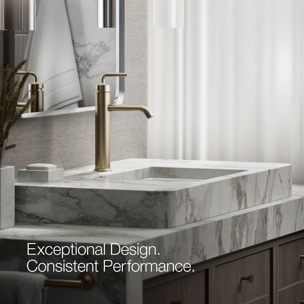 Purist faucets and accessories combine simple, architectural forms with sensual design lines and careful detailing. Capturing the style of minimalist design, this tall bathroom sink faucet features a high spout, ideal for vessel sinks or sinks without faucet holes. The straight, ergonomic lever handle offers easy operation.