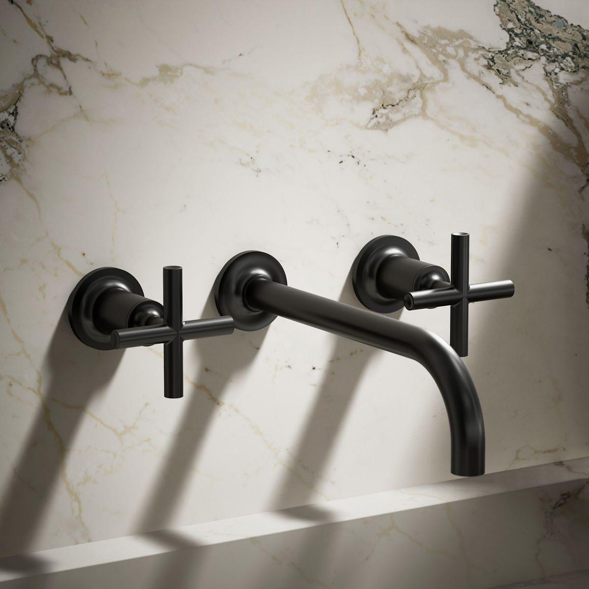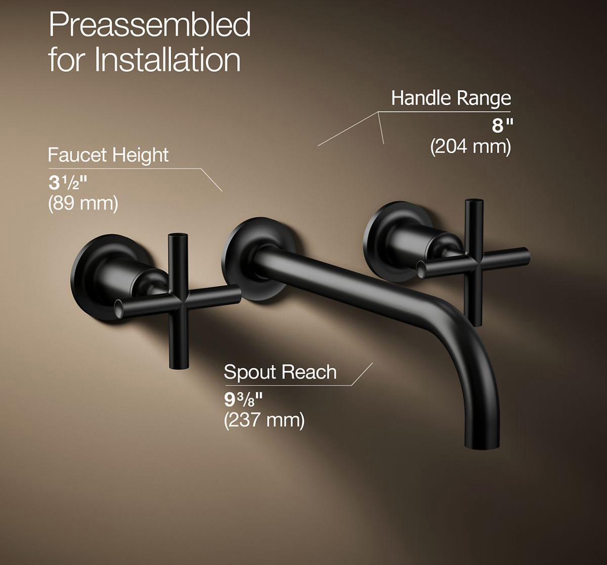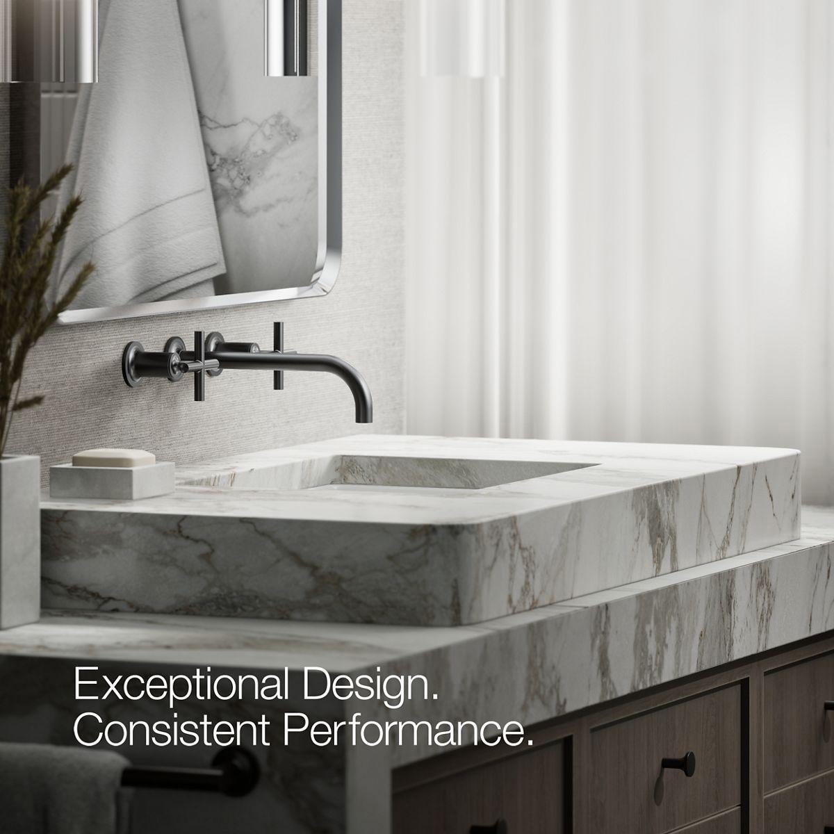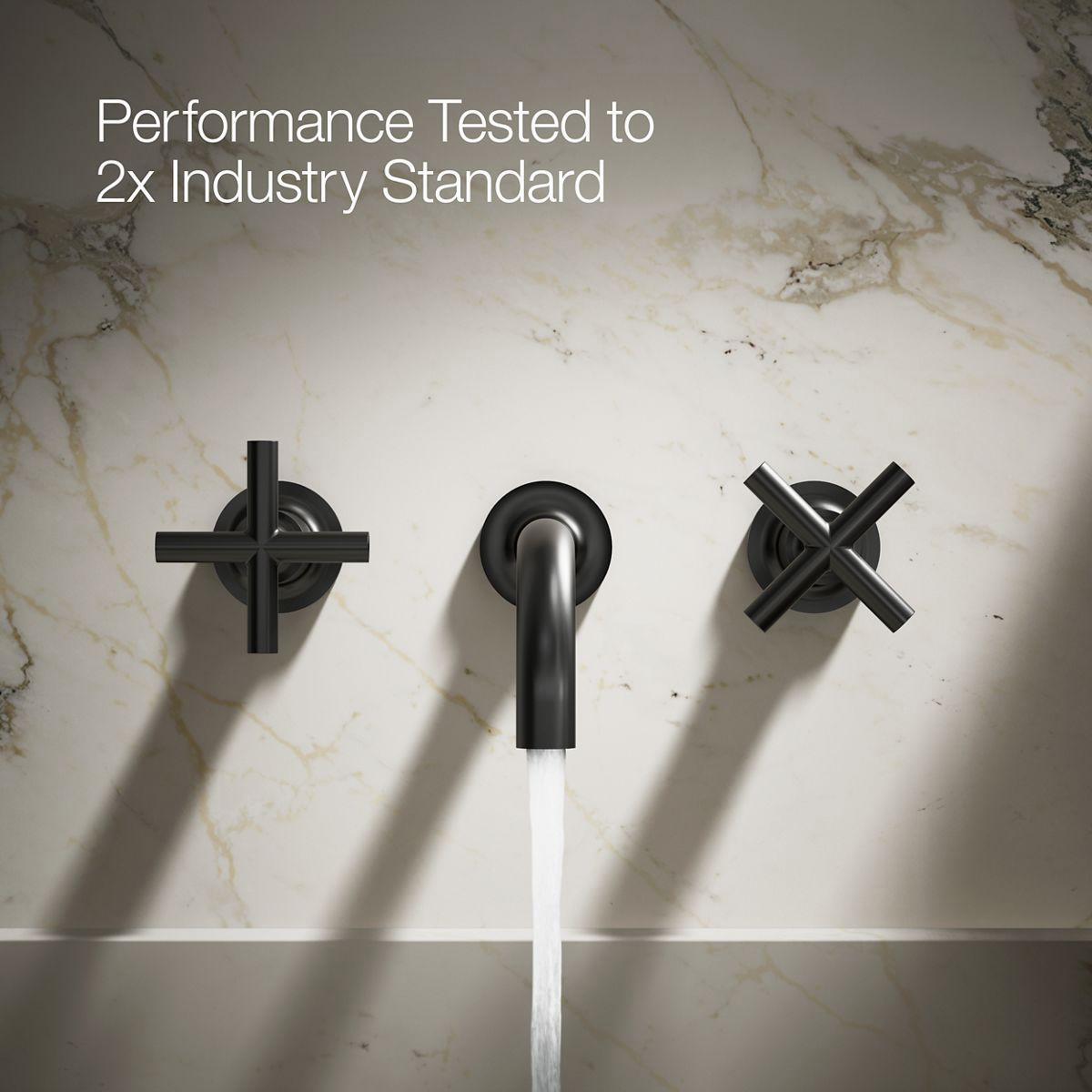 Capturing the style of minimalist design, Purist faucets deliver streamlined water control. This sink faucet trim features a 90-degree angled spout and cross handles for easy operation. The convenient wall-mount design provides a clutter-free countertop in your bath or powder room. When paired with two-handle ceramic disc valves, this trim offers optimal performance.