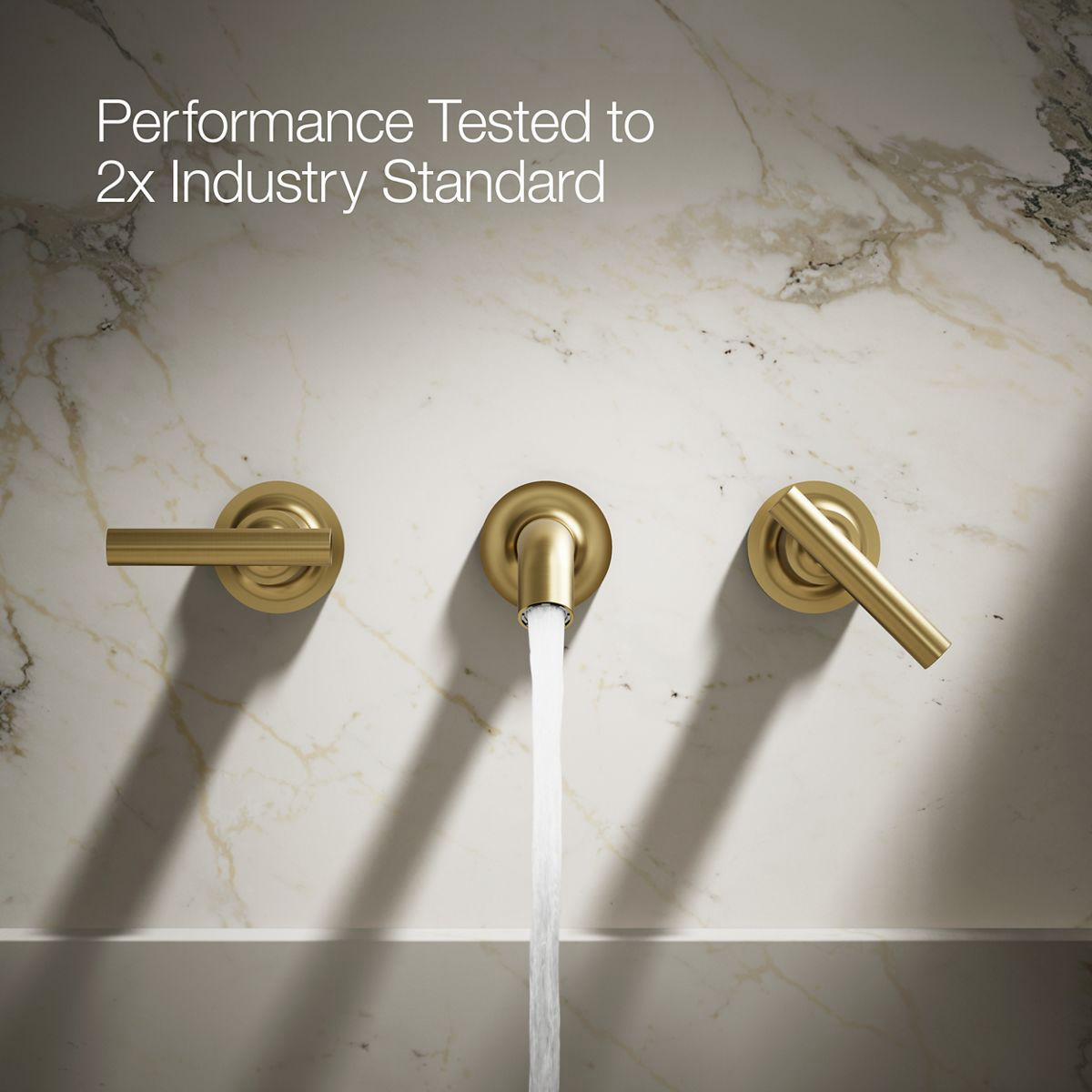 Capturing the style of minimalist design, Purist faucets deliver streamlined water control. This sink faucet trim features a 35-degree angled spout and lever handles for easy operation. The convenient wall-mount design provides a clutter-free countertop in your bath or powder room. When paired with a two-handle ceramic disc valve, this trim offers optimal performance.