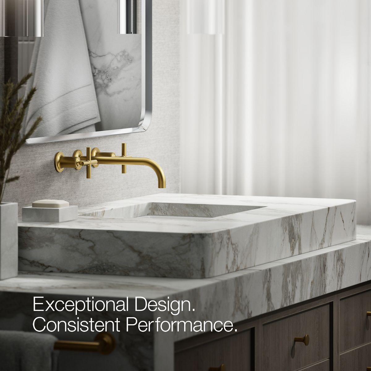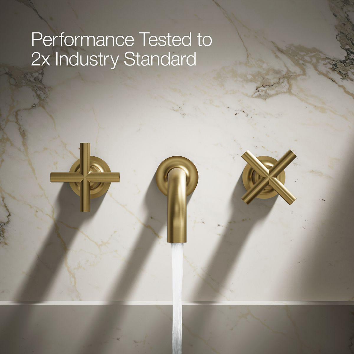 Capturing the style of minimalist design, Purist faucets deliver streamlined water control. This sink faucet trim features a 90-degree angled spout and cross handles for easy operation. The convenient wall-mount design provides a clutter-free countertop in your bath or powder room. When paired with two-handle ceramic disc valves, this trim offers optimal performance.