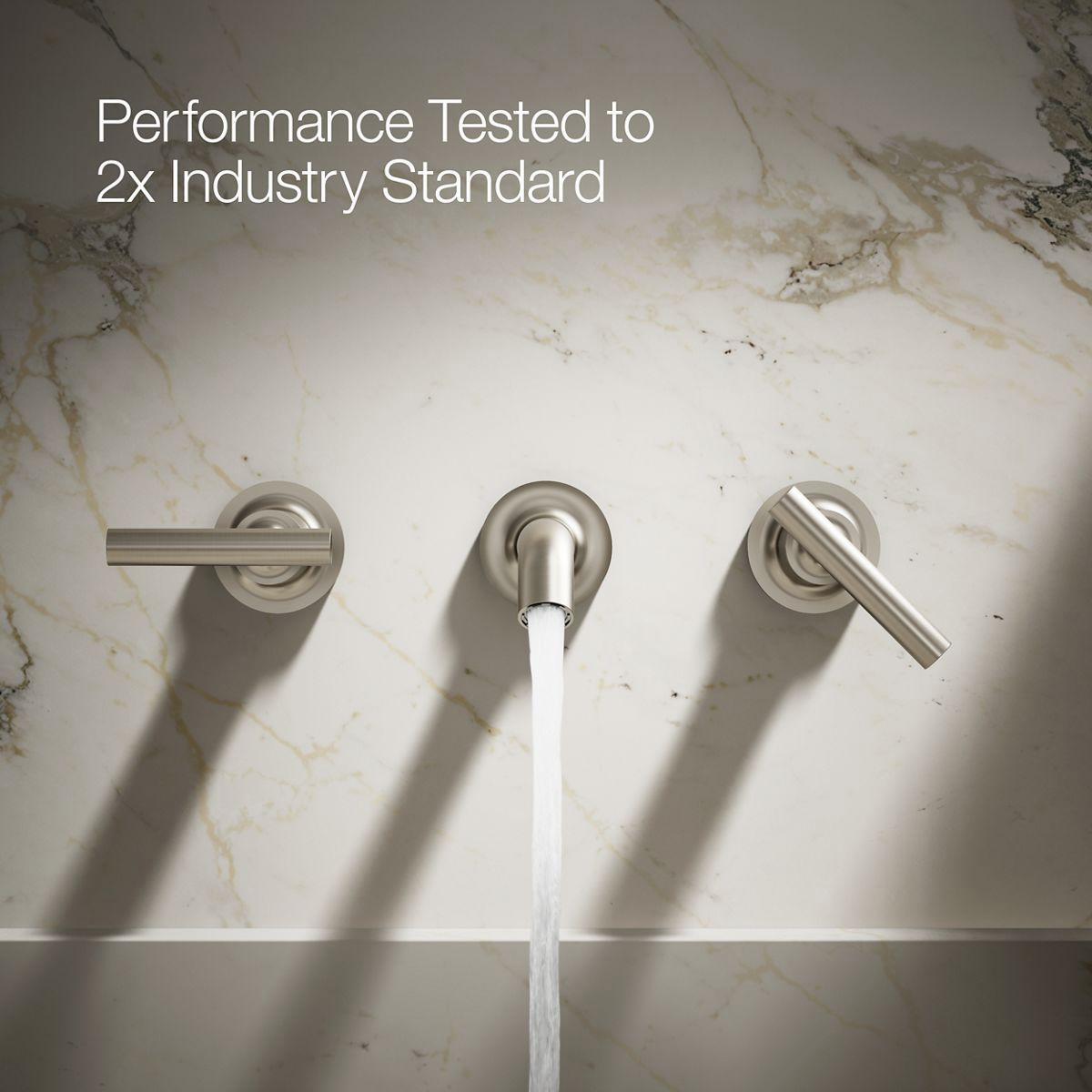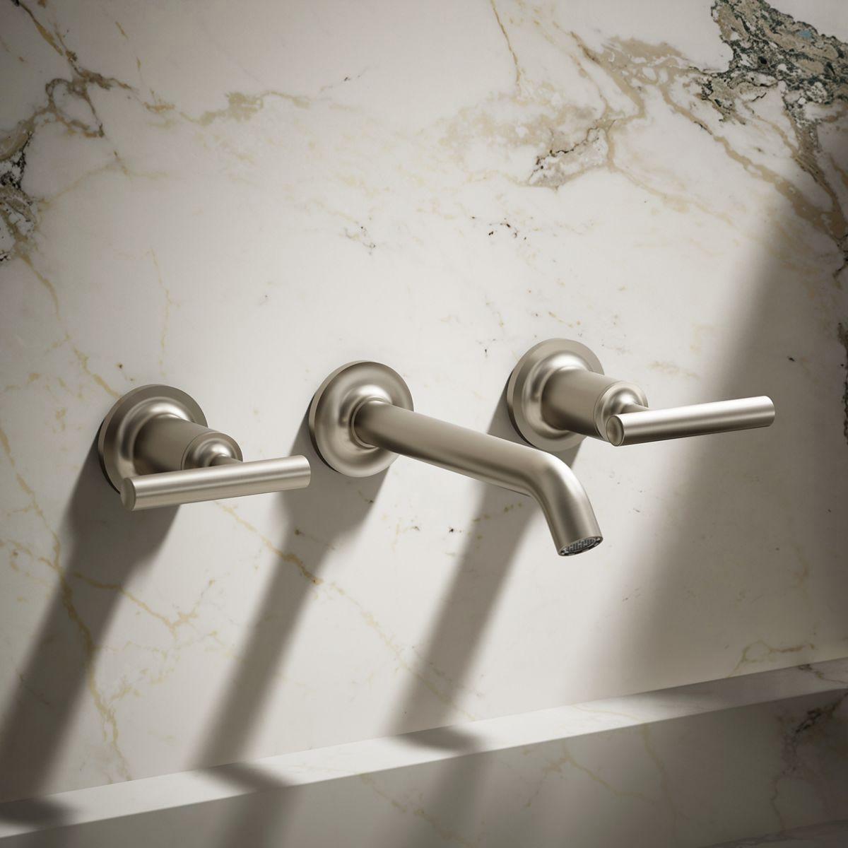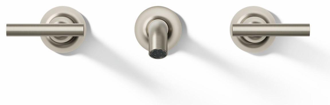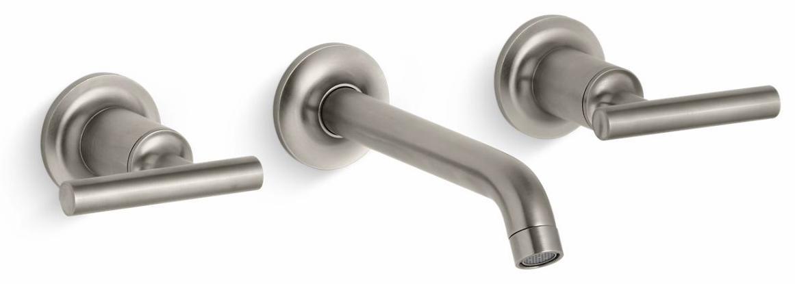 Capturing the style of minimalist design, Purist faucets deliver streamlined water control. This sink faucet trim features a 35-degree angled spout and lever handles for easy operation. The convenient wall-mount design provides a clutter-free countertop in your bath or powder room. When paired with a two-handle ceramic disc valve, this trim offers optimal performance.