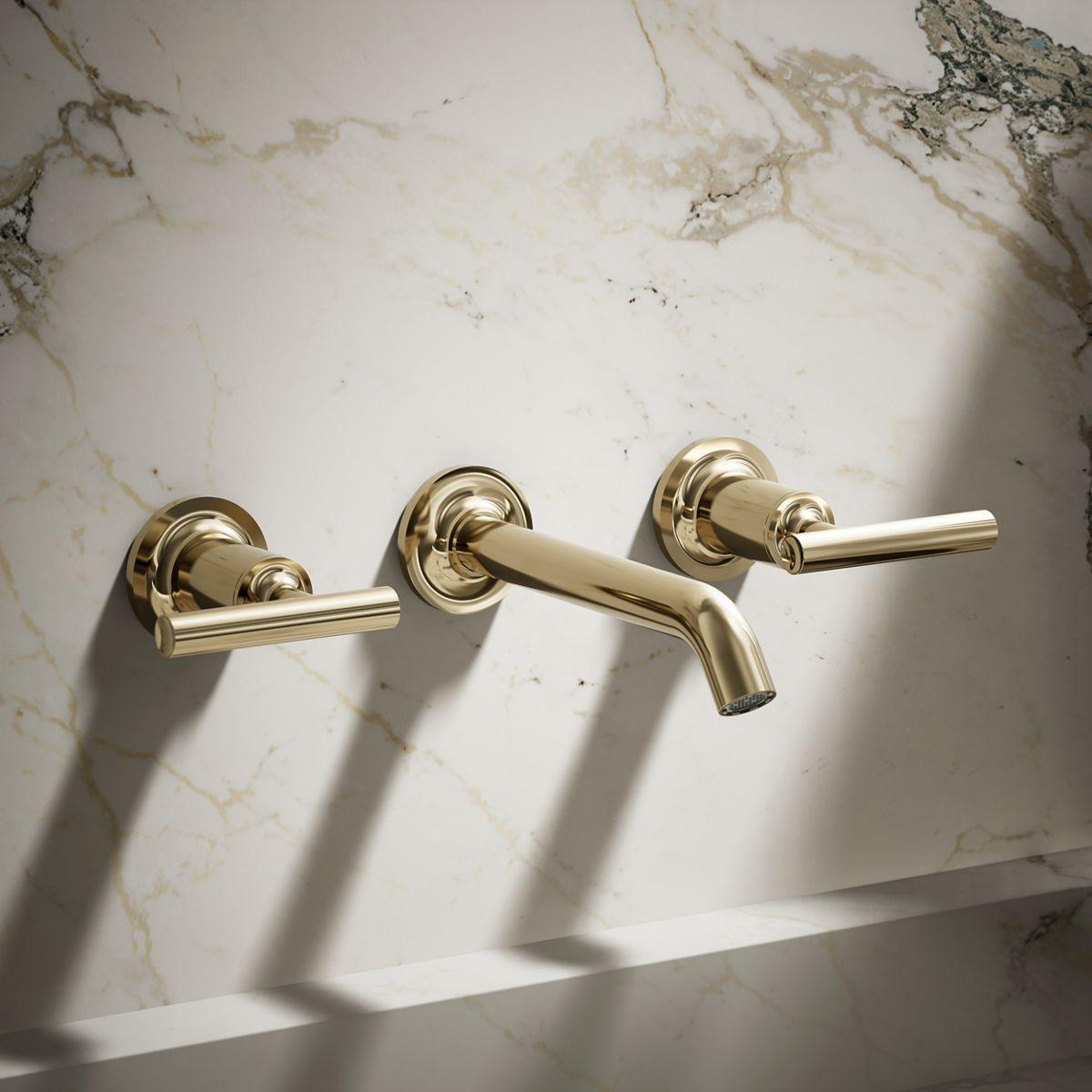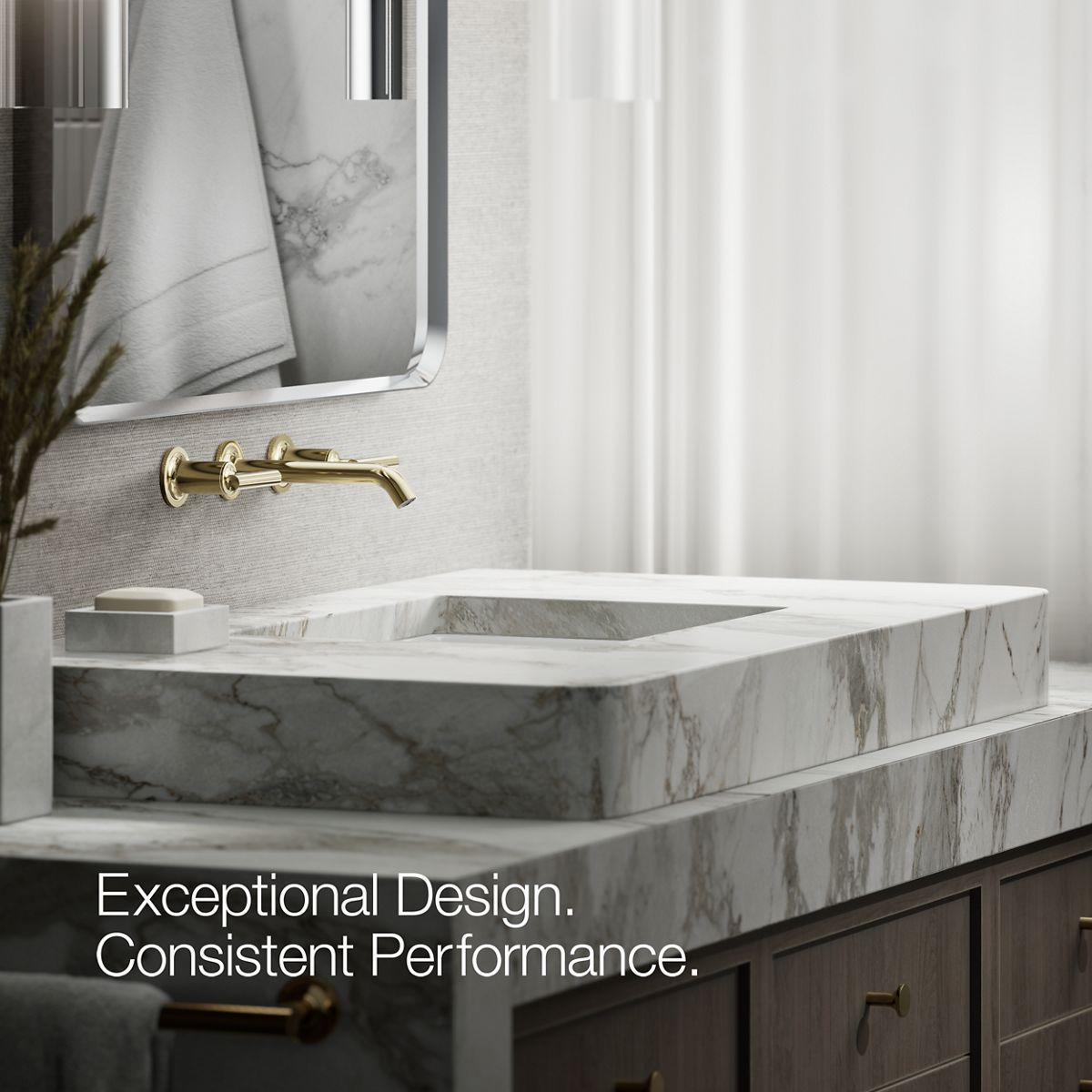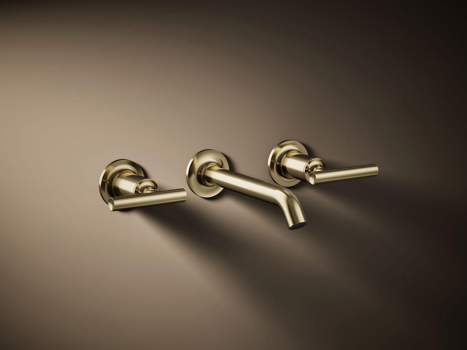 Capturing the style of minimalist design, Purist faucets deliver streamlined water control. This sink faucet trim features a 35-degree angled spout and lever handles for easy operation. The convenient wall-mount design provides a clutter-free countertop in your bath or powder room. When paired with a two-handle ceramic disc valve, this trim offers optimal performance.