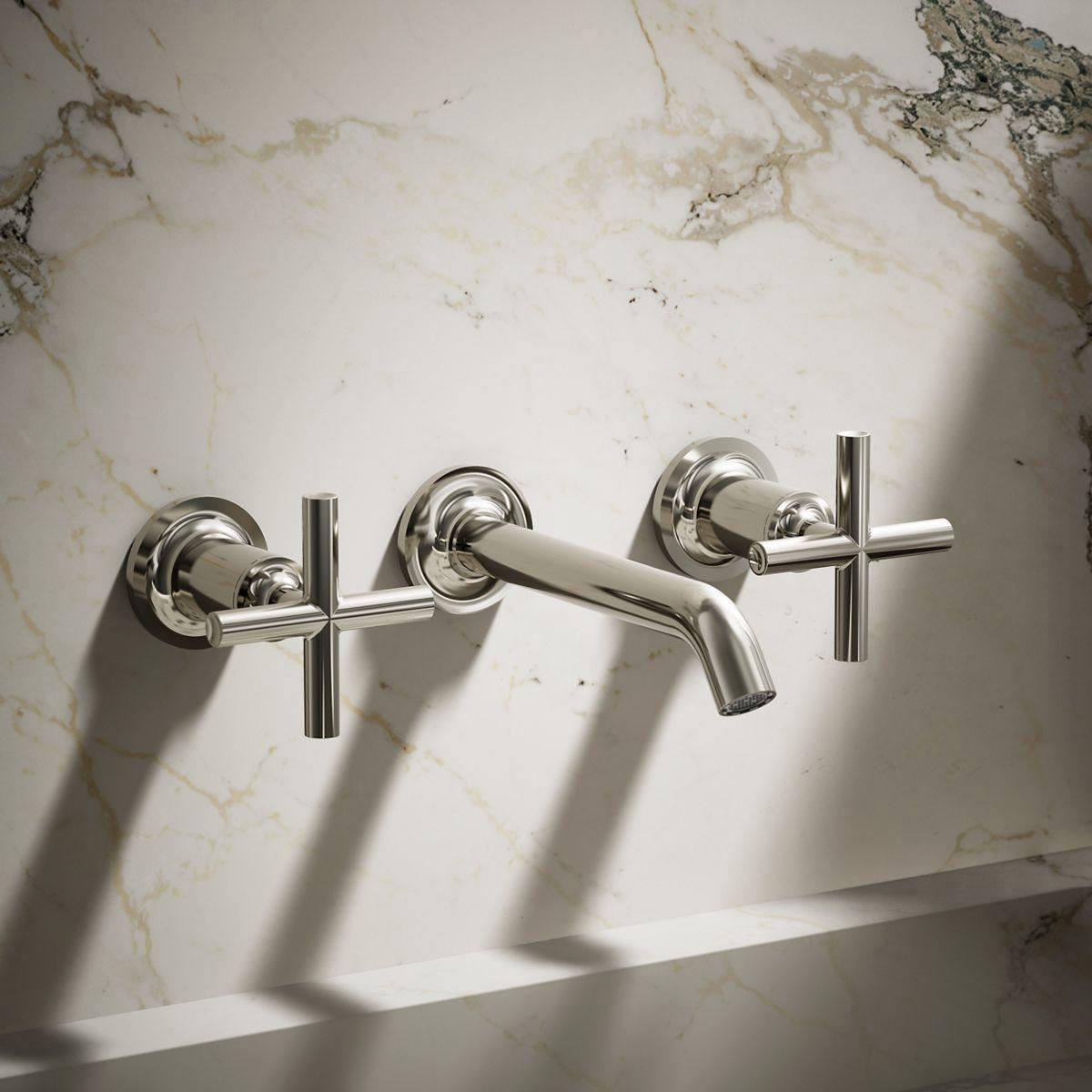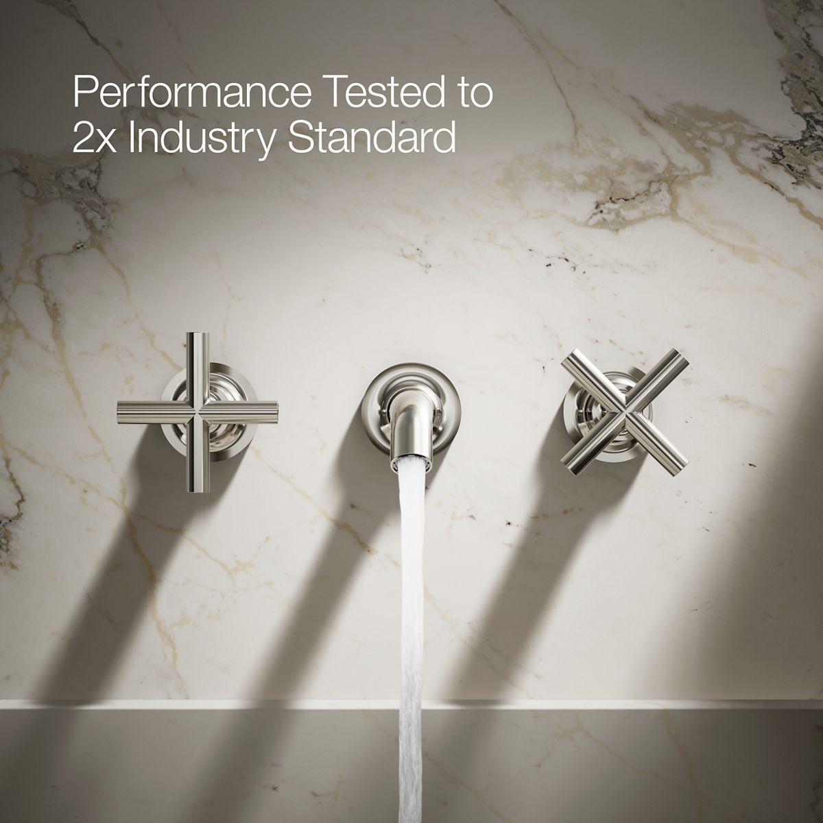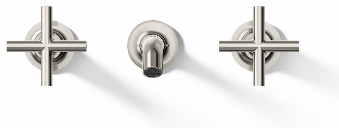 Capturing the style of minimalist design, Purist faucets deliver streamlined water control. This sink faucet trim features a 35-degree angled spout and cross handles for easy operation. The convenient wall-mount design provides a clutter-free countertop in your bath or powder room. When paired with a two-handle ceramic disc valve, this trim offers optimal performance. Combine it with bath accessories from the Purist collection for a distinctively modern and unified decor.