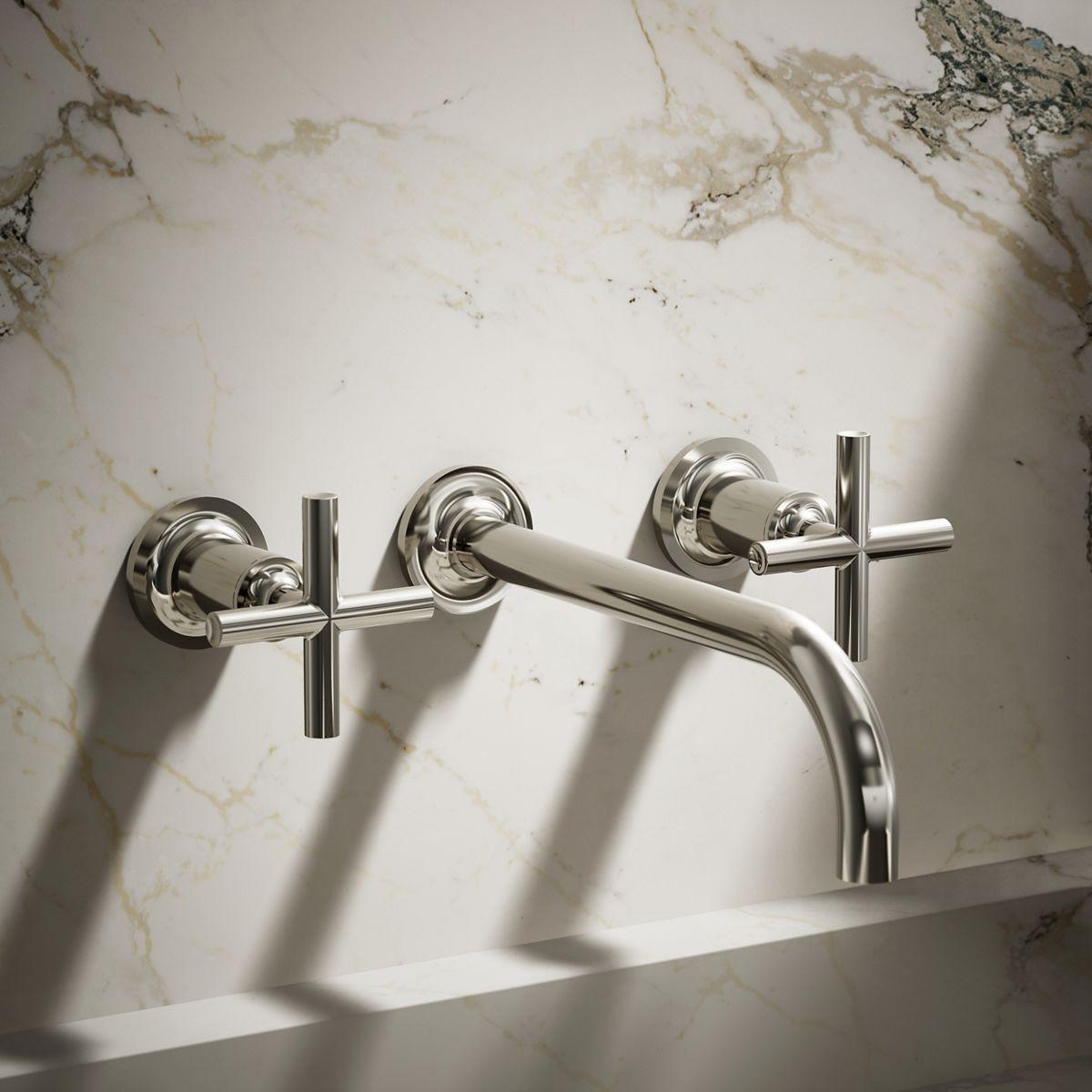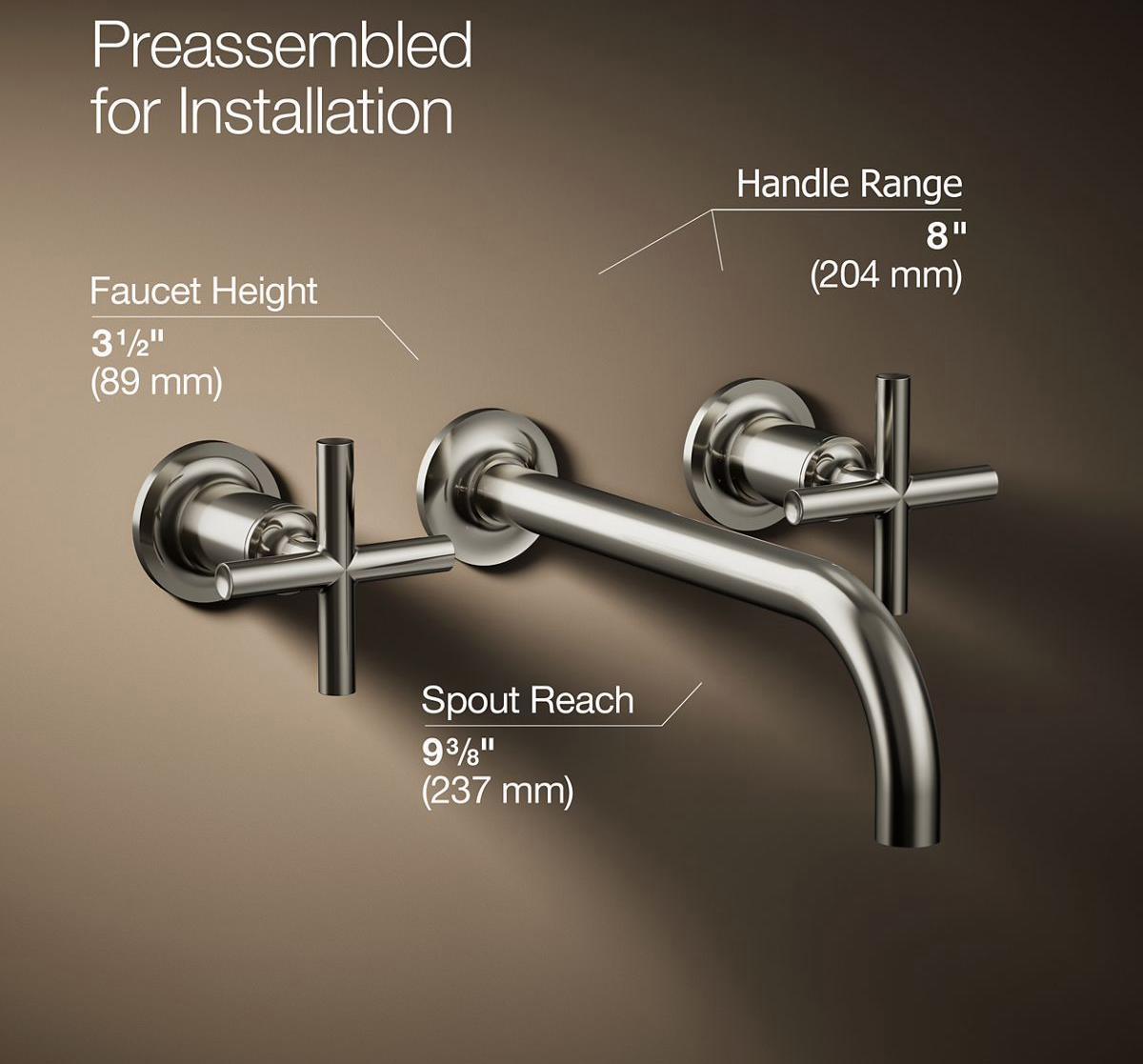 Capturing the style of minimalist design, Purist faucets deliver streamlined water control. This sink faucet trim features a 90-degree angled spout and cross handles for easy operation. The convenient wall-mount design provides a clutter-free countertop in your bath or powder room. When paired with two-handle ceramic disc valves, this trim offers optimal performance.