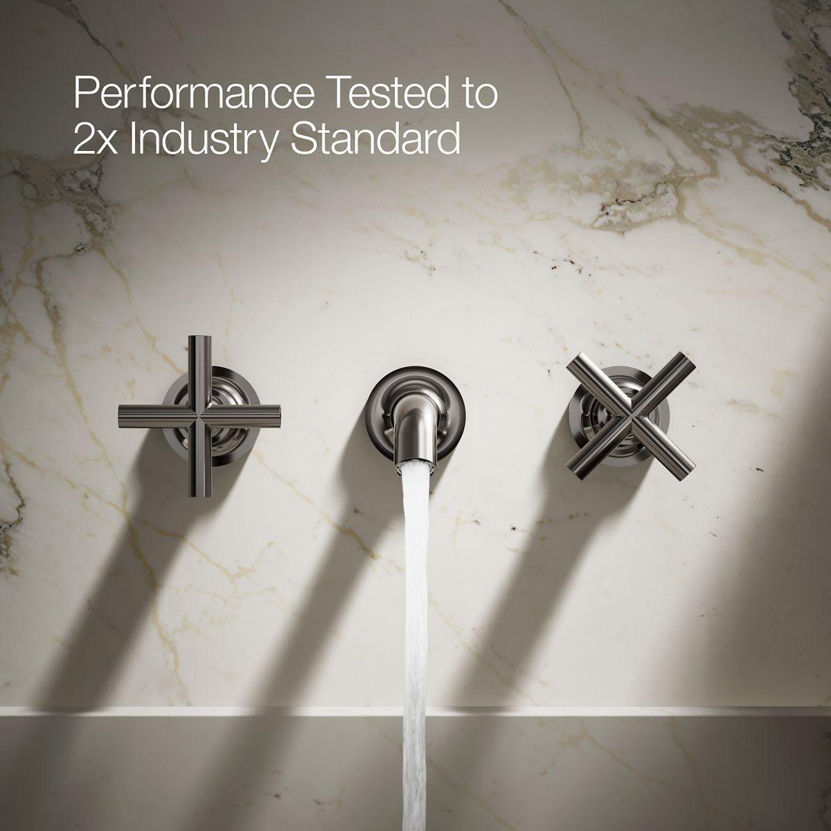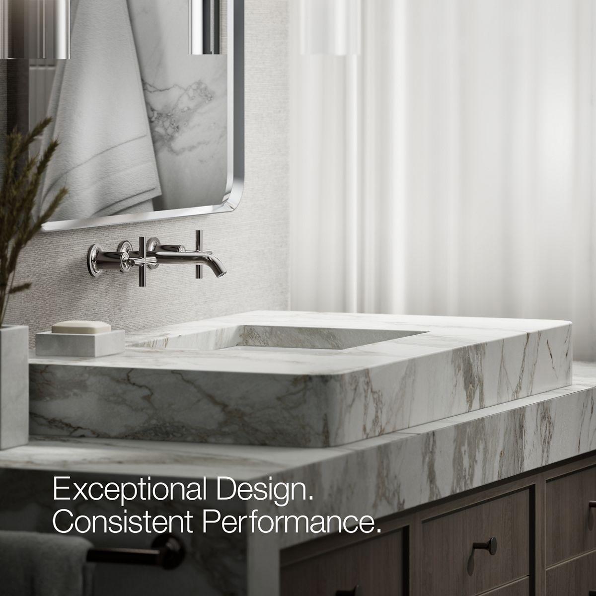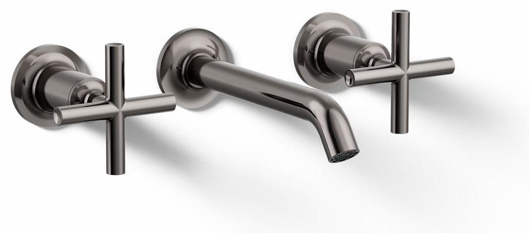 Capturing the style of minimalist design, Purist faucets deliver streamlined water control. This sink faucet trim features a 35-degree angled spout and cross handles for easy operation. The convenient wall-mount design provides a clutter-free countertop in your bath or powder room. When paired with a two-handle ceramic disc valve, this trim offers optimal performance. Combine it with bath accessories from the Purist collection for a distinctively modern and unified decor.