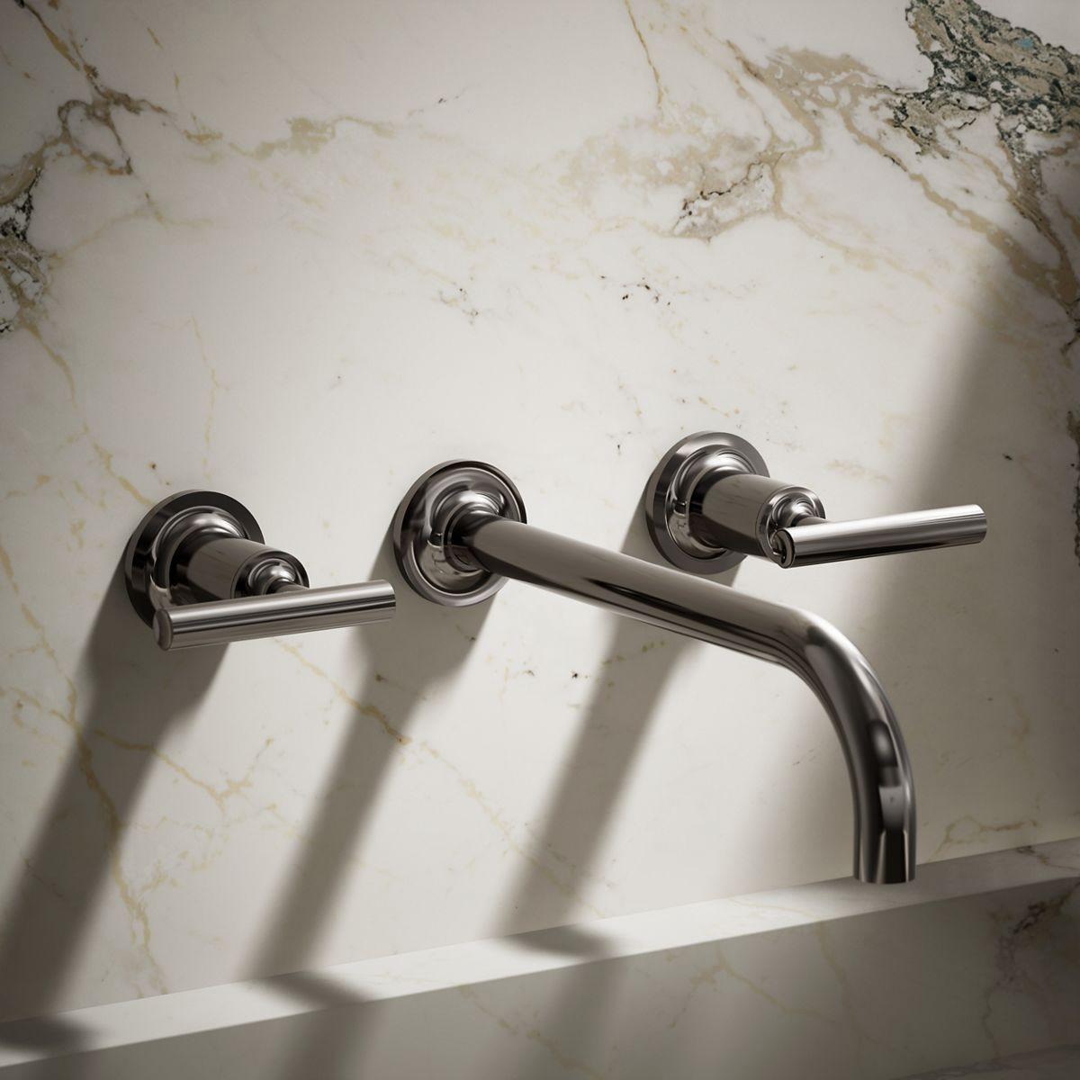 Capturing the style of minimalist design, Purist faucets deliver streamlined water control. This sink faucet trim features a 90-degree angle spout and lever handles for easy operation. The convenient wall-mount design provides a clutter-free countertop in your bath or powder room. When paired with a two-handle ceramic disc valve, this trim offers optimal performance. Combine it with bath accessories from the Purist collection for a distinctively modern and unified decor.
