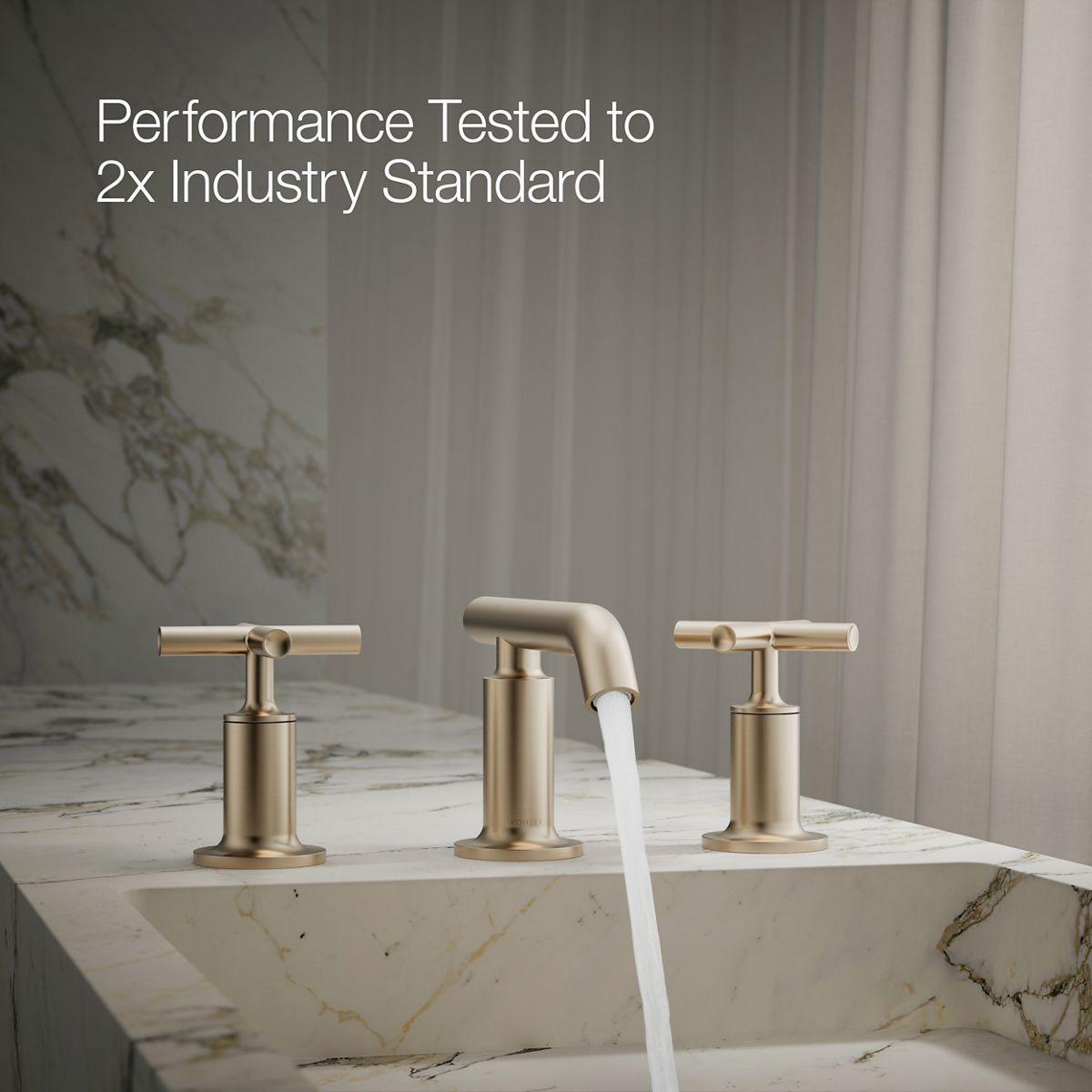 Combining architectural forms with sensual design lines, Purist faucets and accessories bring a touch of modern elegance to your bathroom. This sink faucet exemplifies the Purist collection's understated style, with its low spout and cross handles. Easy-to-install and leak-free UltraGlide(TM) valves provide reliable performance and durability. And the spout features laminar flow, which helps conserve water while preventing splashing.