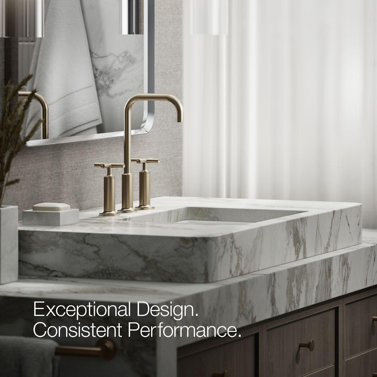 Combining architectural forms with sensual design lines, Purist faucets and accessories bring a touch of modern elegance to your bathroom. This sink faucet exemplifies the Purist collection's understated style, with its high gooseneck spout and high cross handles. Easy-to-install and leak-free UltraGlide(TM) valves provide reliable performance and durability. And the spout features laminar flow, which helps conserve water while preventing splashing.