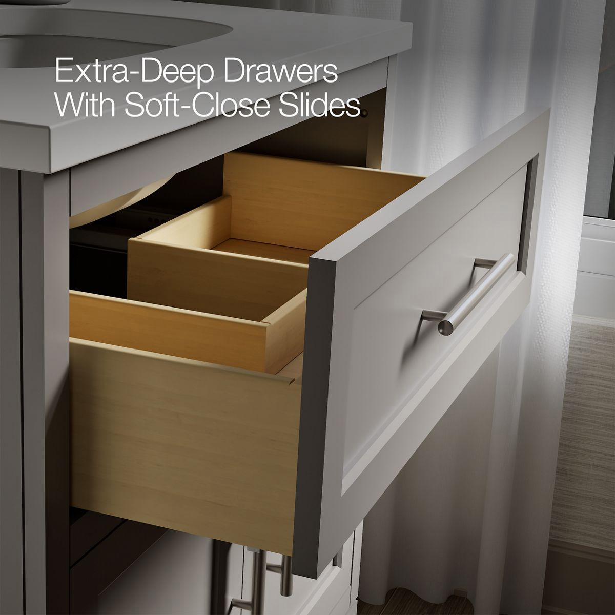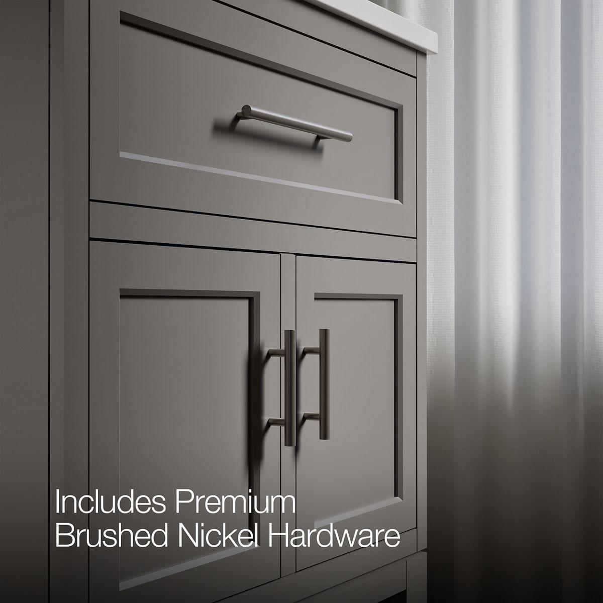 - Brushed Nickel hardware included on the White and Atmos Grey vanities