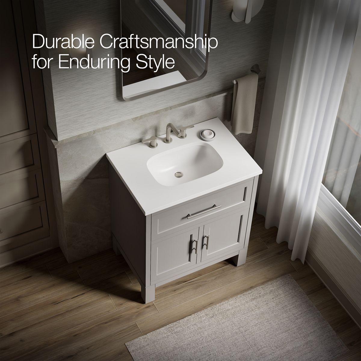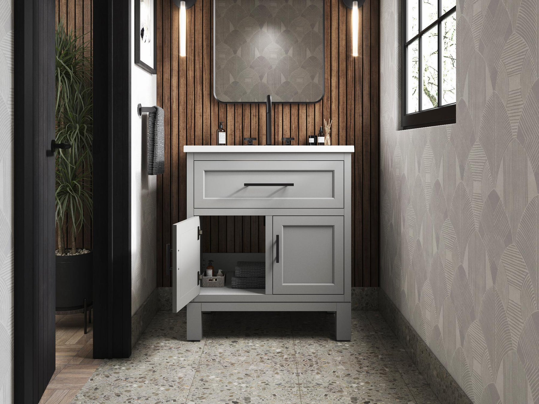 With a clean, versatile design, the Quo bathroom vanity set brings simplicity to your bathroom. Its transitional design boasts generous storage space, and a coordinating quartz vanity top, sink, and cabinet hardware are included. Quo makes it effortless to organize your bathroom and simplify your routine.