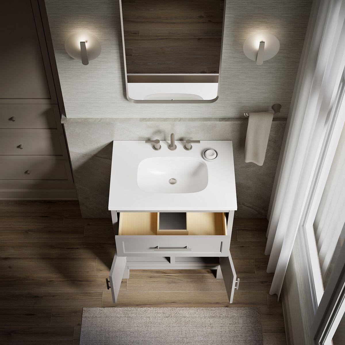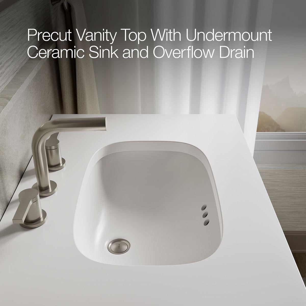 - Pure White (PWH) quartz vanity top adds beauty and long-lasting durability