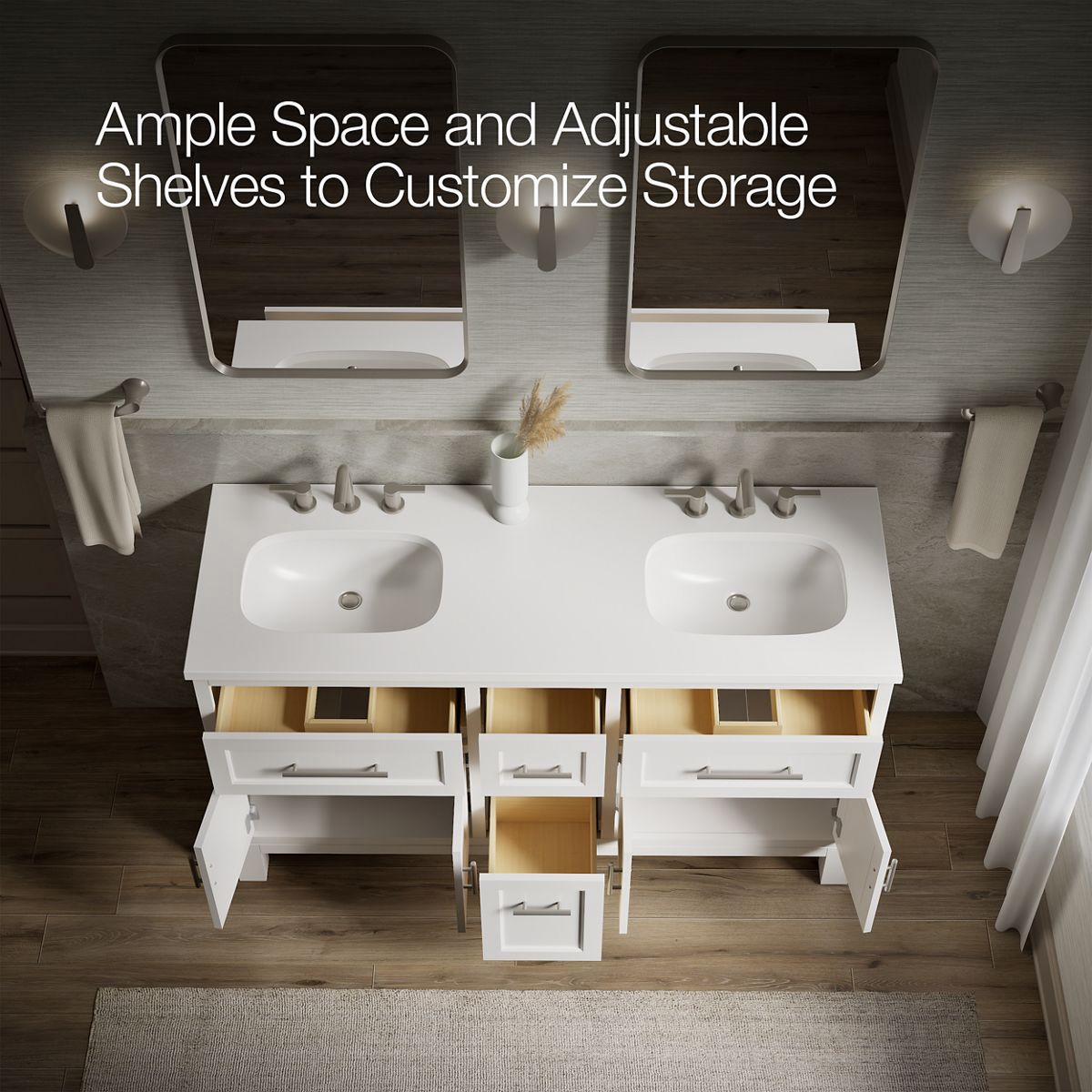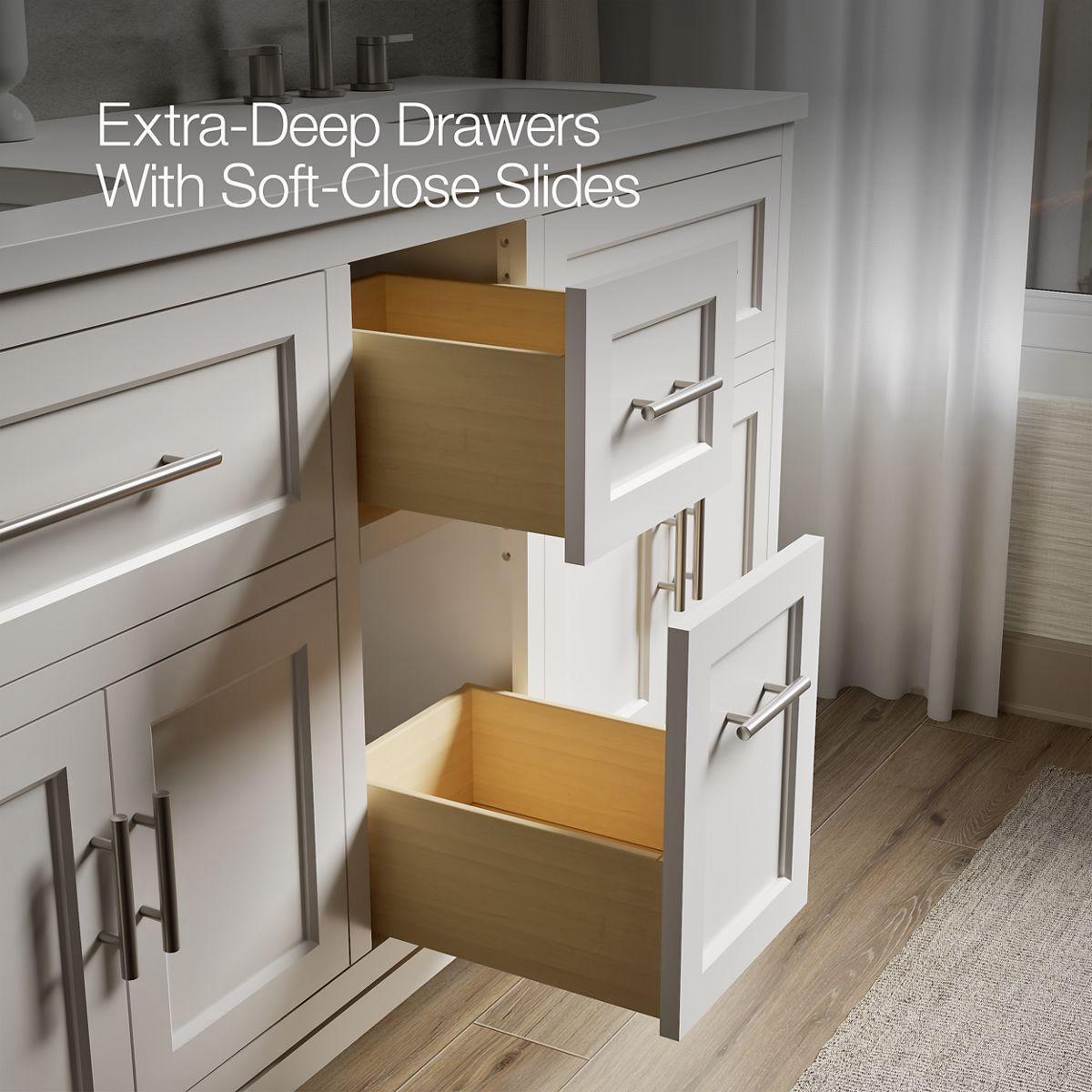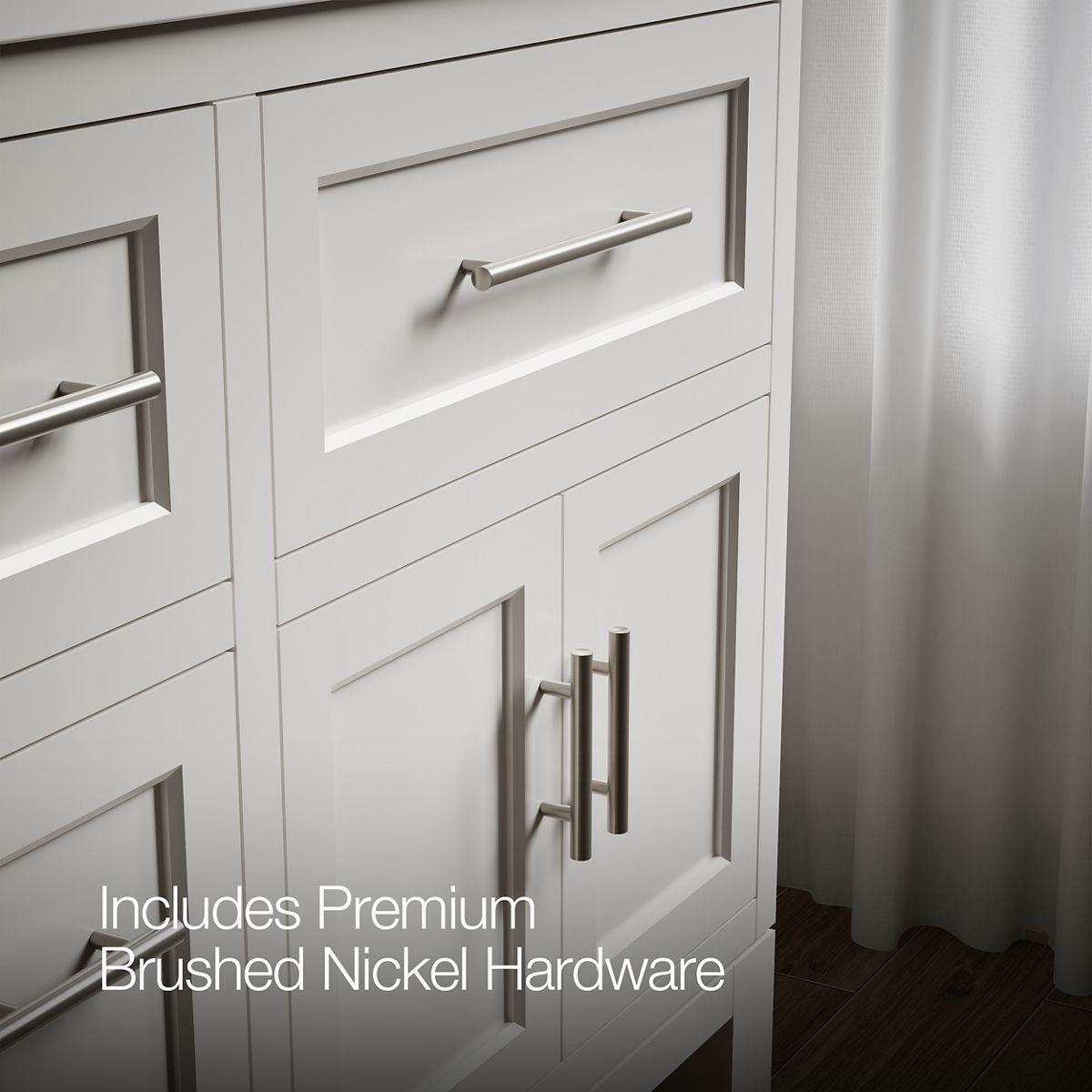 - Brushed Nickel hardware included on the White and Atmos Grey vanities