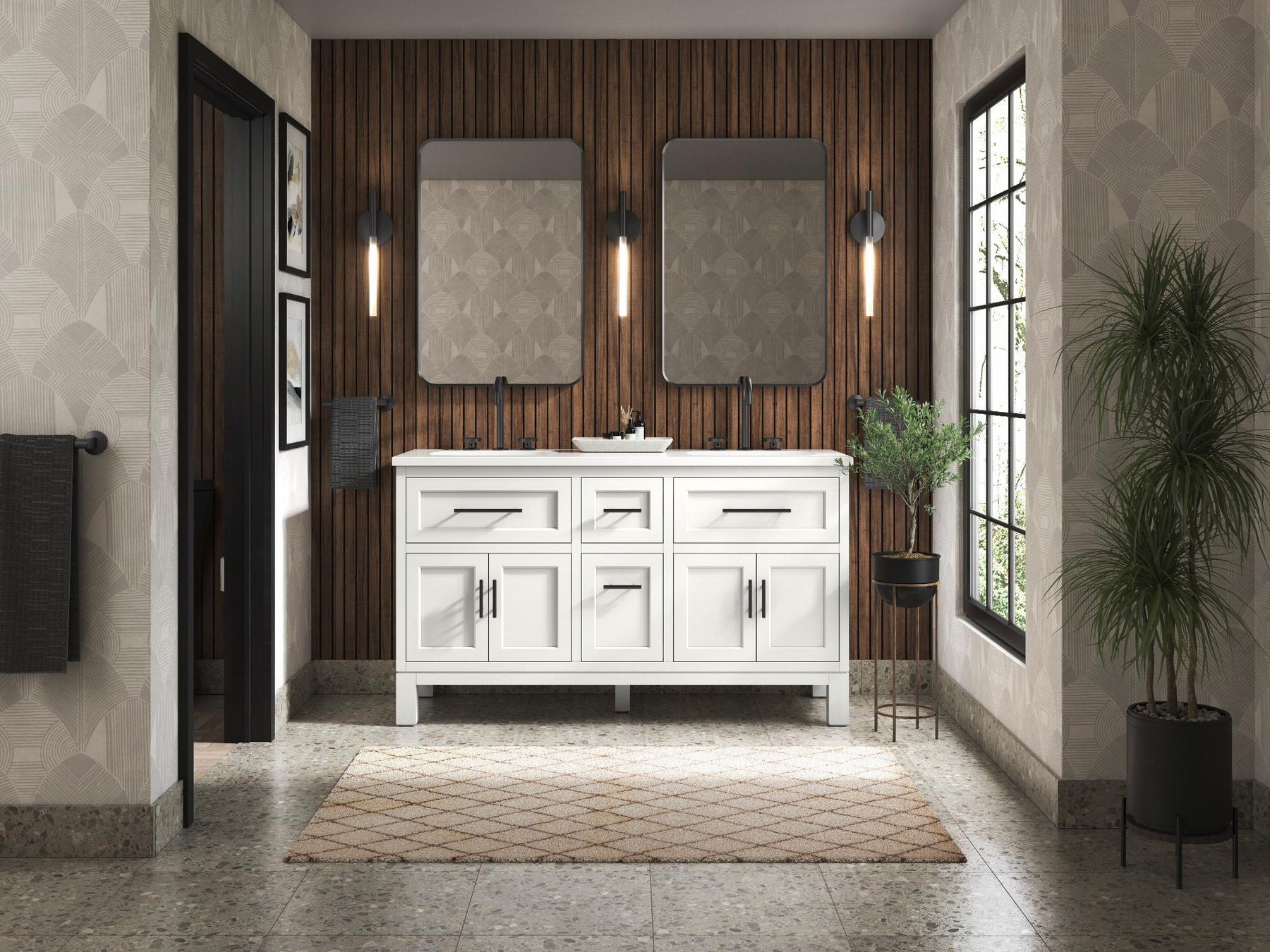 With a clean, versatile design, the Quo bathroom vanity set brings simplicity to your bathroom. Its transitional design boasts generous storage space, and a coordinating quartz vanity top, two sinks, and cabinet hardware are included. Quo makes it effortless to organize your bathroom and simplify your routine.