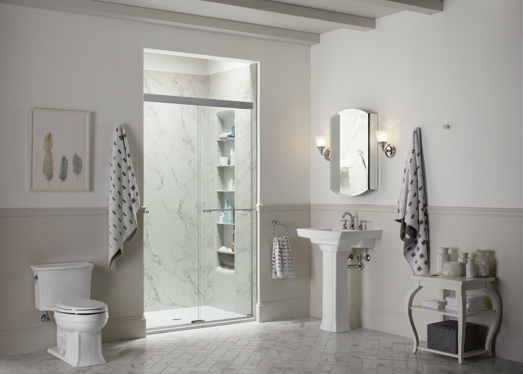 The Revel shower door creates an open, airy look with its frameless design, minimal top track, and clear wall jambs. Designed for easy personalization, the Revel series is available in a full range of KOHLER finishes and height and glass options, so you can choose the ideal door for your needs. Revel frameless bath and shower doors combine superior performance with sleek, minimalist design for the perfect complement to your bathing and showering space.