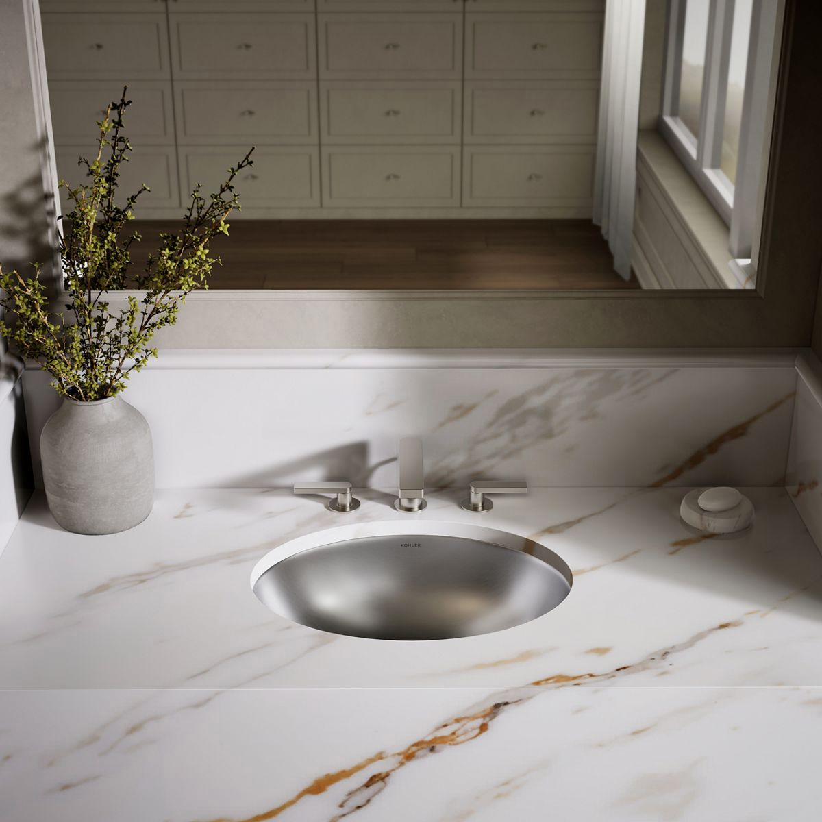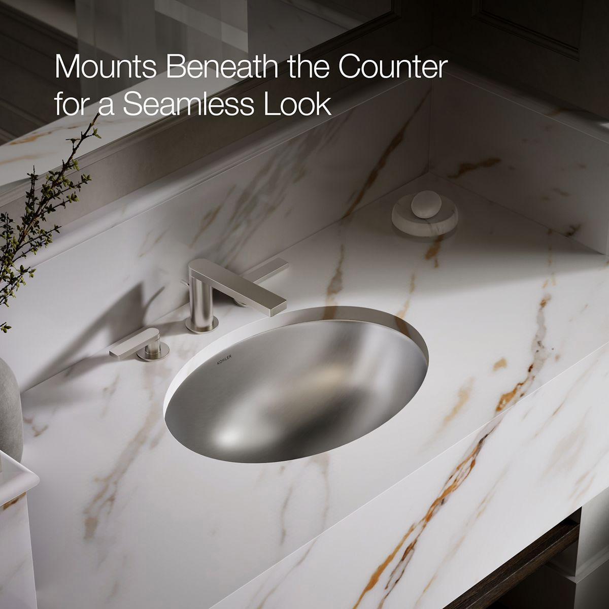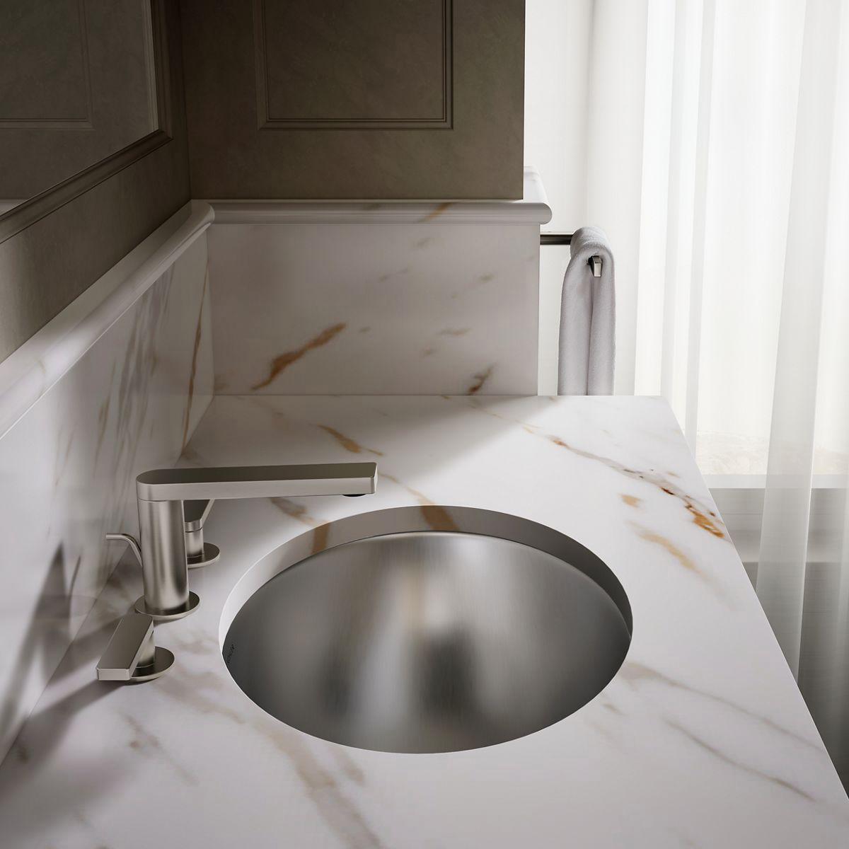 With a sleek undermount design and elliptical shape, the Rhythm sink creates a striking statement in your bath or powder room. Stainless steel construction makes this basin durable and easy to clean, while the Satin finish provides a beautiful accent to your choice of a wall- or counter-mount faucet.