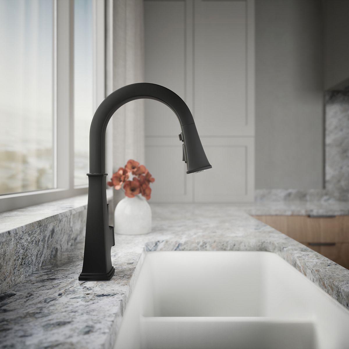 - Three-function pull-down sprayhead with touch control allows you to switch between aerated stream, Sweep® spray, and Boost technology.