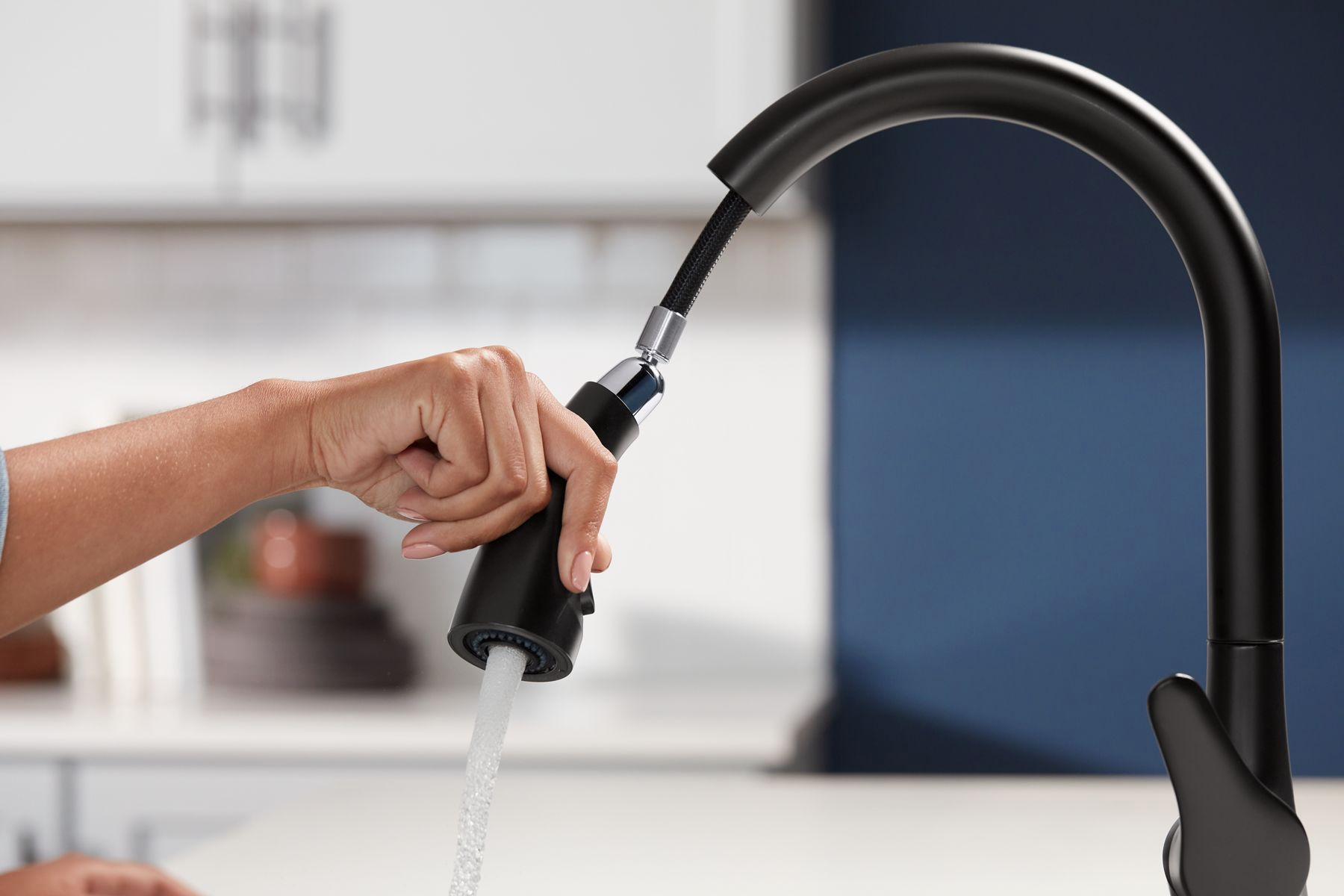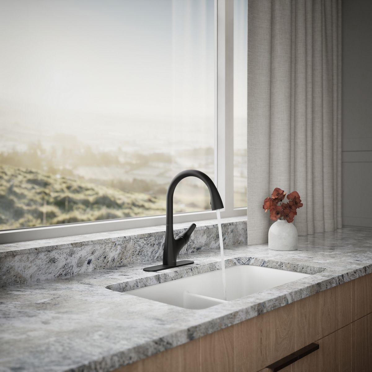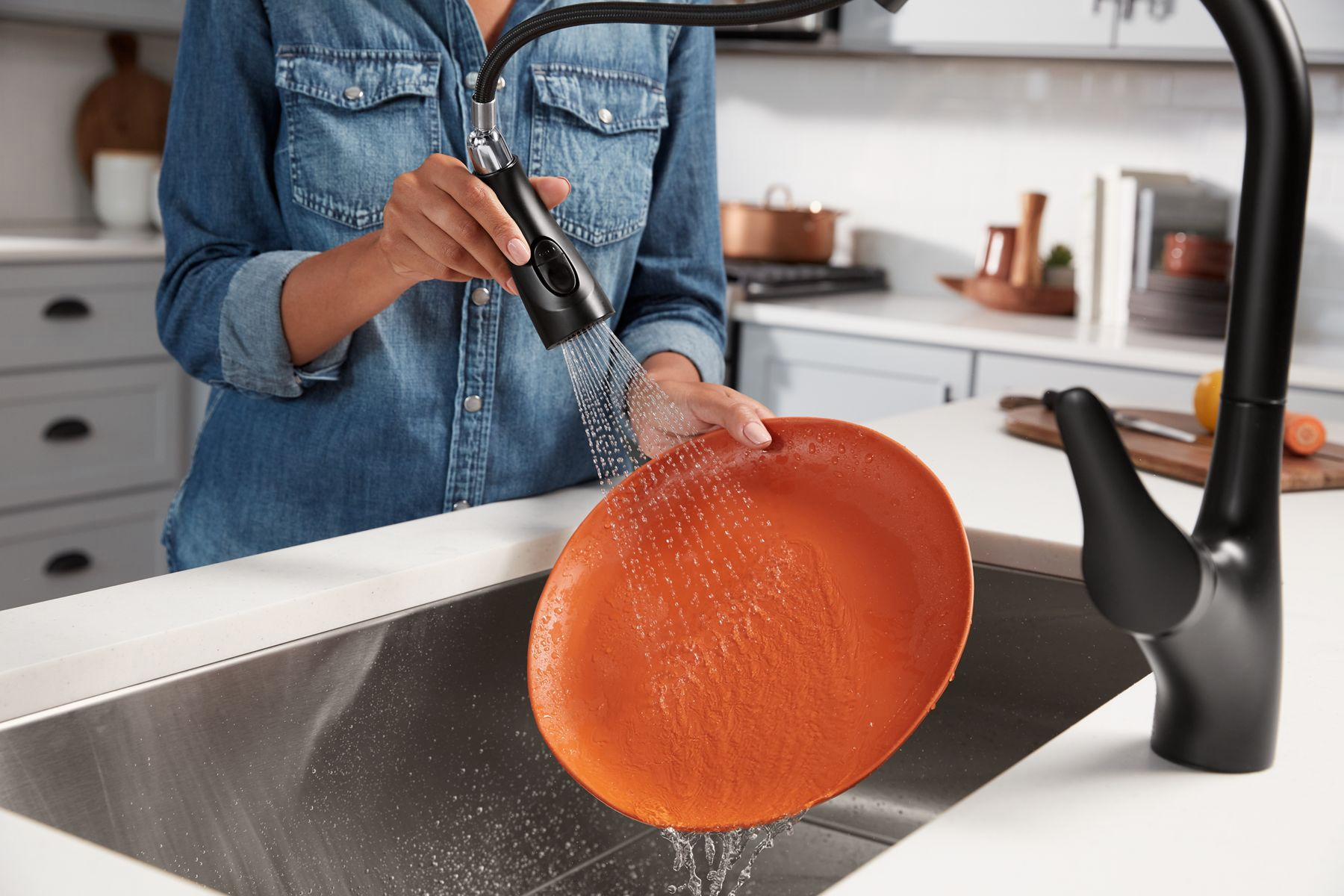 An innovative fit for a variety of kitchens and tasks, the Rival pull-down kitchen faucet combines an elegant, universal design with exceptional ergonomics and functionality. The high-arch spout rotates 360 degrees and the MasterClean sprayhead smoothly maneuvers, giving you full range of motion. Even with wet, soapy hands, the sculpted buttons allow you to switch between aerated spray and the powerful Sweep spray. When the job is done, the DockNetik docking system allows you to lock the sprayhead in place.