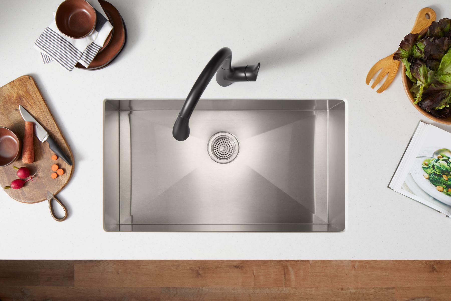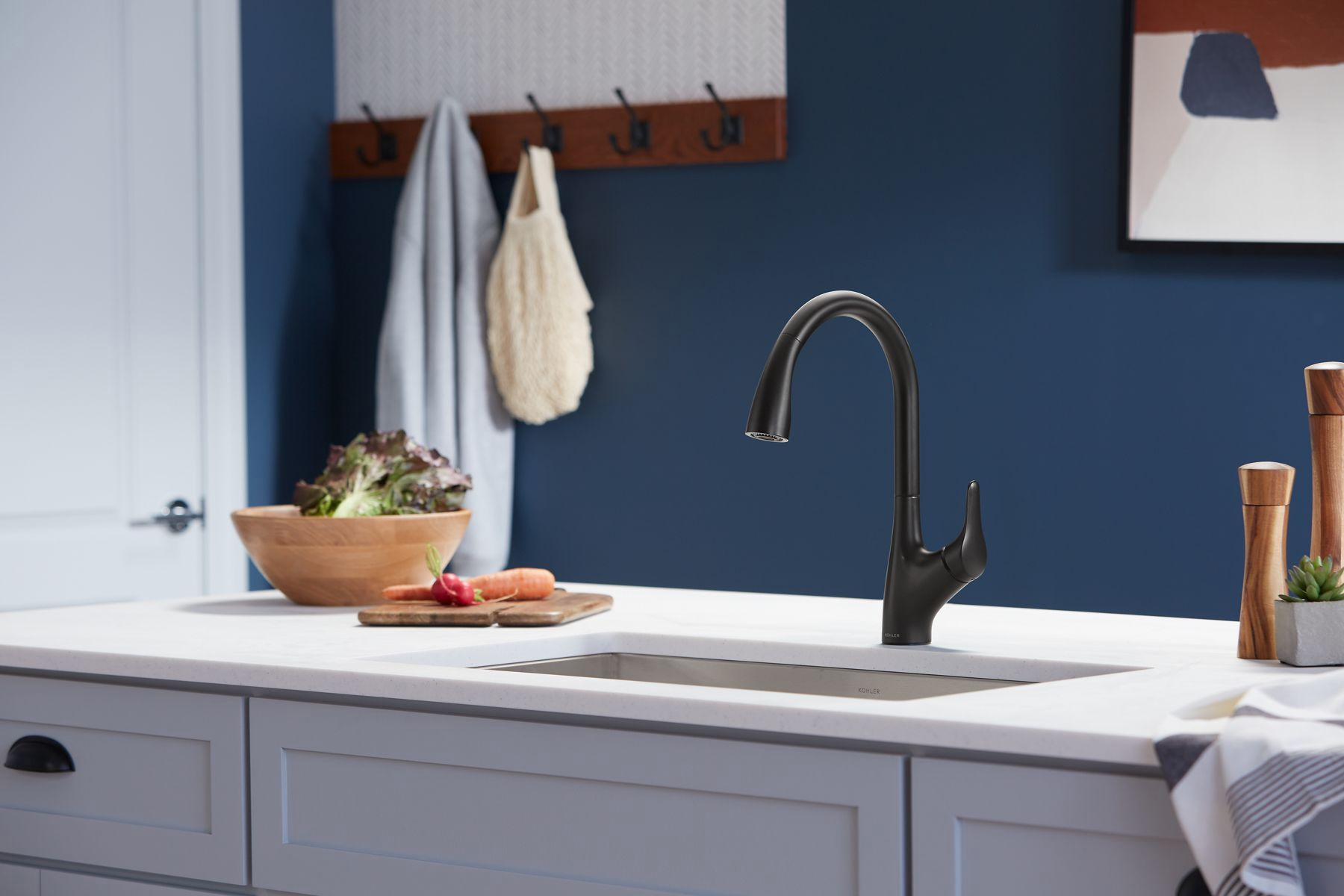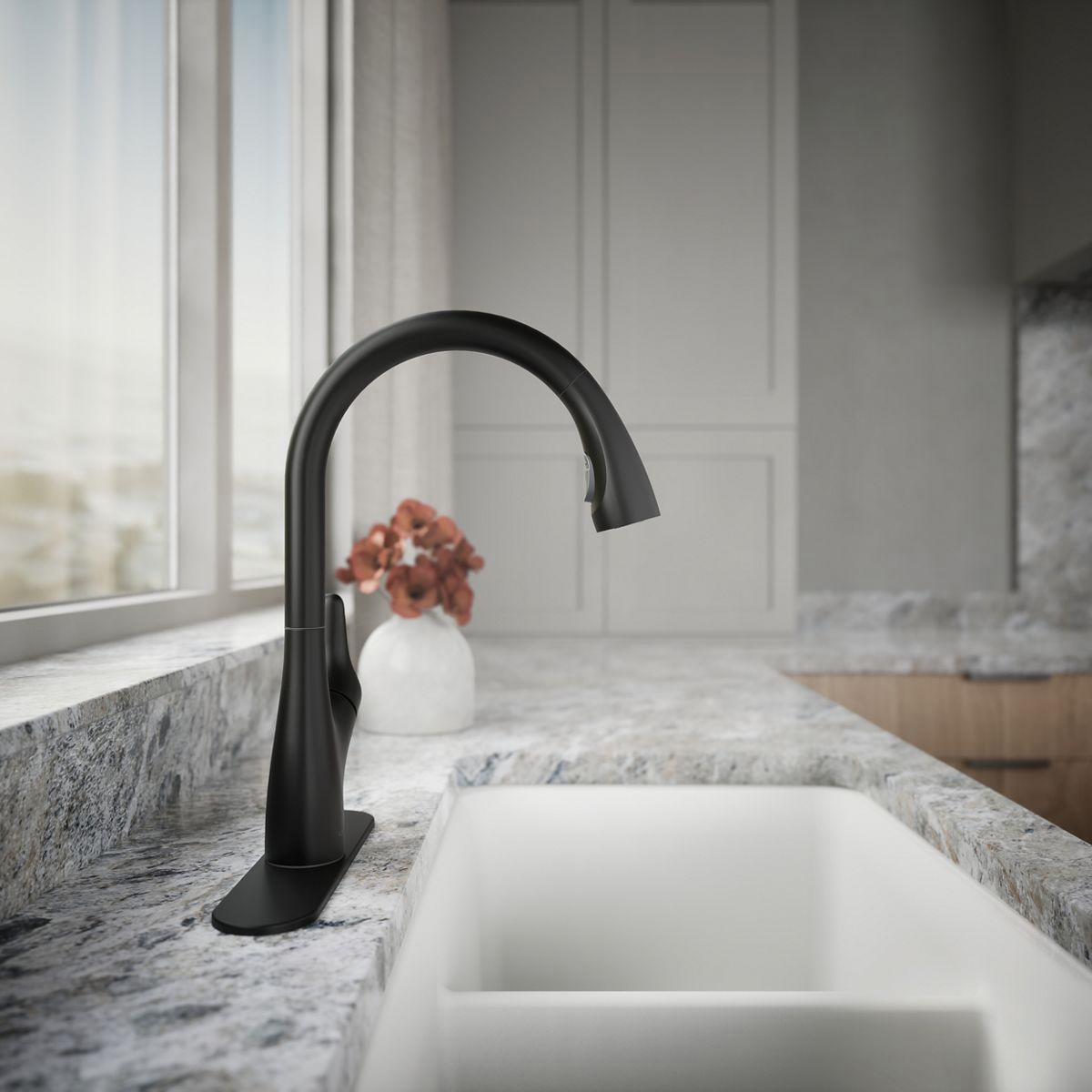 An innovative fit for a variety of kitchens and tasks, the Rival pull-down kitchen faucet combines an elegant, universal design with exceptional ergonomics and functionality. The high-arch spout rotates 360 degrees and the MasterClean sprayhead smoothly maneuvers, giving you full range of motion. Even with wet, soapy hands, the sculpted buttons allow you to switch between aerated spray and the powerful Sweep spray. When the job is done, the DockNetik docking system allows you to lock the sprayhead in place.
