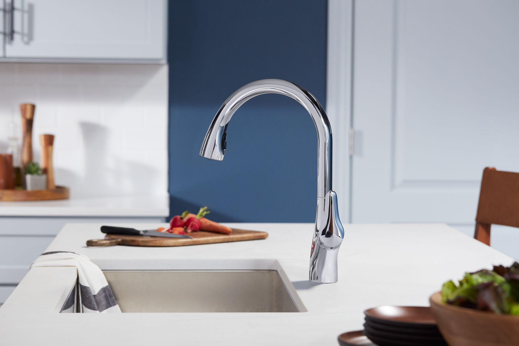 An innovative fit for a variety of kitchens and tasks, the Rival pull-down kitchen faucet combines an elegant, universal design with exceptional ergonomics and functionality. The high-arch spout rotates 360 degrees and the MasterClean sprayhead smoothly maneuvers, giving you full range of motion. Even with wet, soapy hands, the sculpted buttons allow you to switch between aerated spray and the powerful Sweep spray. When the job is done, the DockNetik docking system allows you to lock the sprayhead in place.