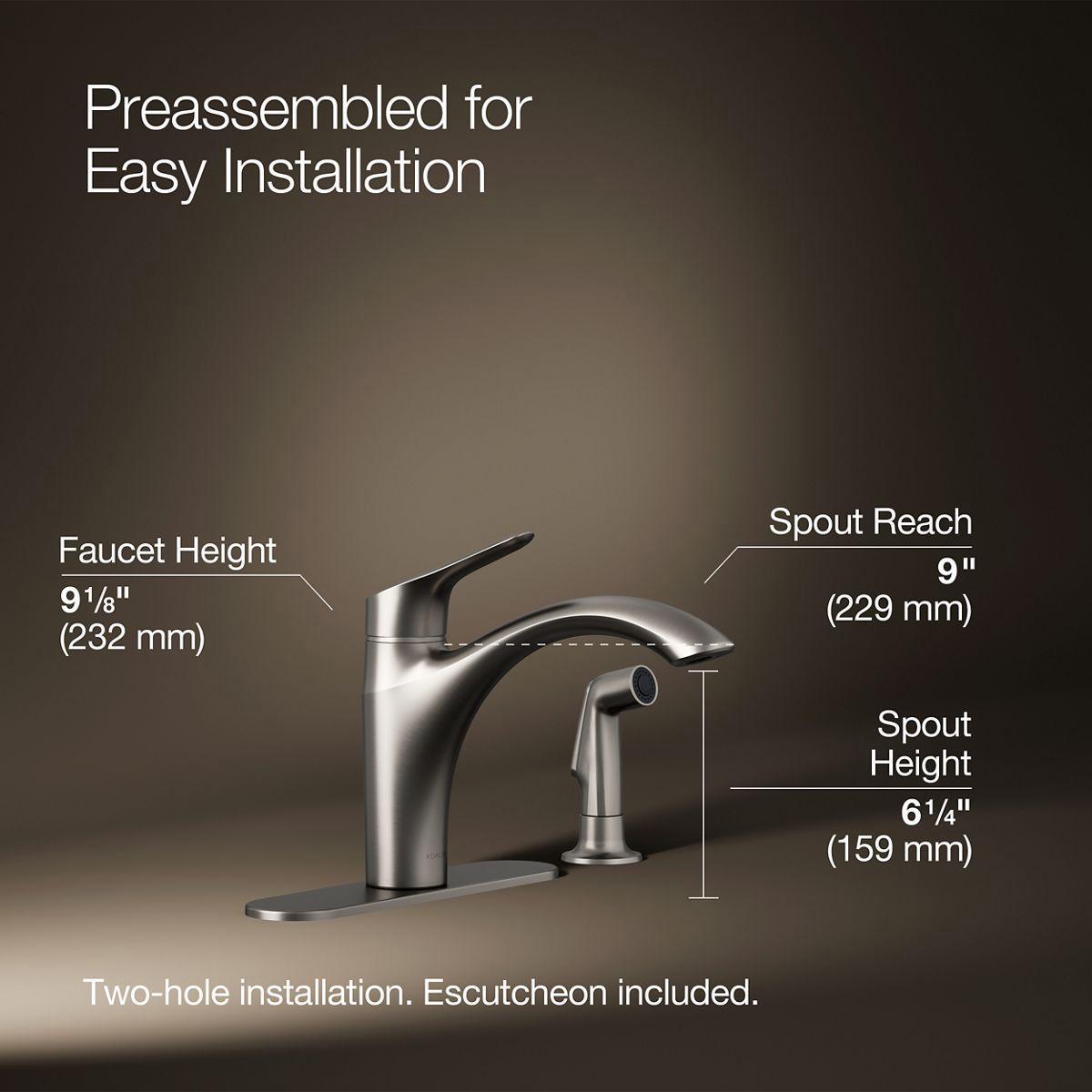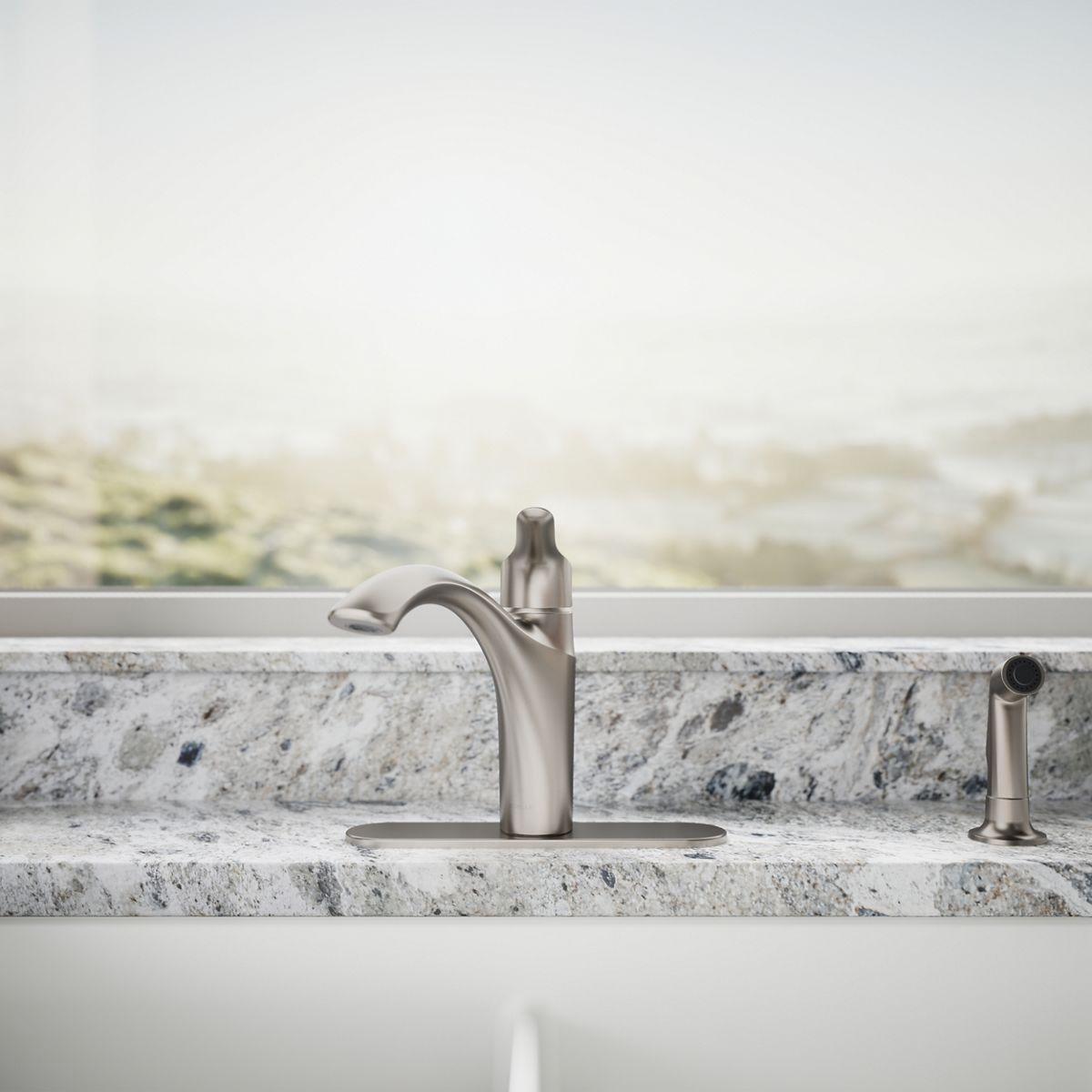 At home in classic or contemporary settings, this Rival kitchen sink faucet enhances any kitchen with style. The graceful arched spout is designed to reach over pots and pans, while the ergonomic lever handle and separate side sprayer make operation easy and thorough. The single lever handle offers ease of use, allowing you to turn the water on and set the temperature in one motion.