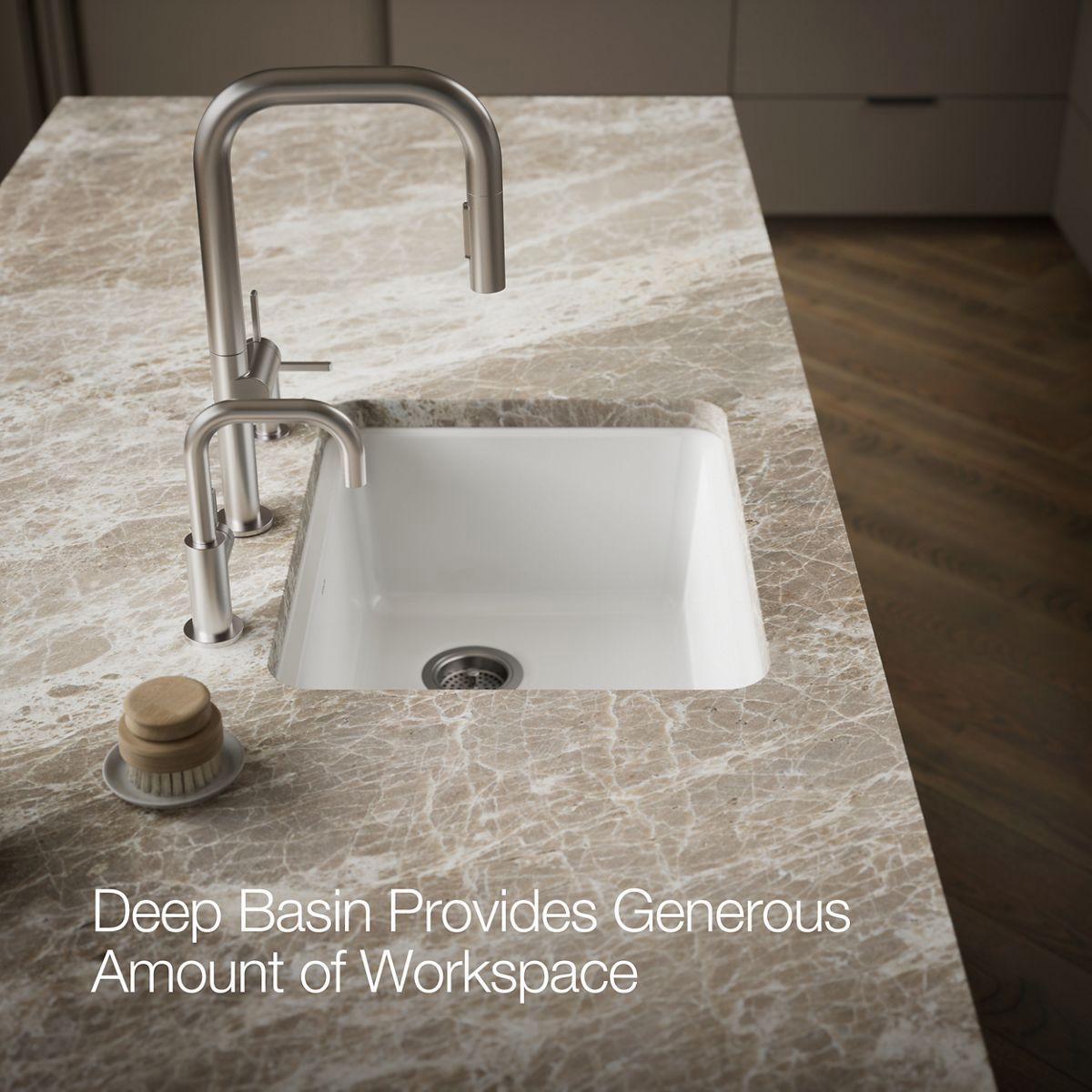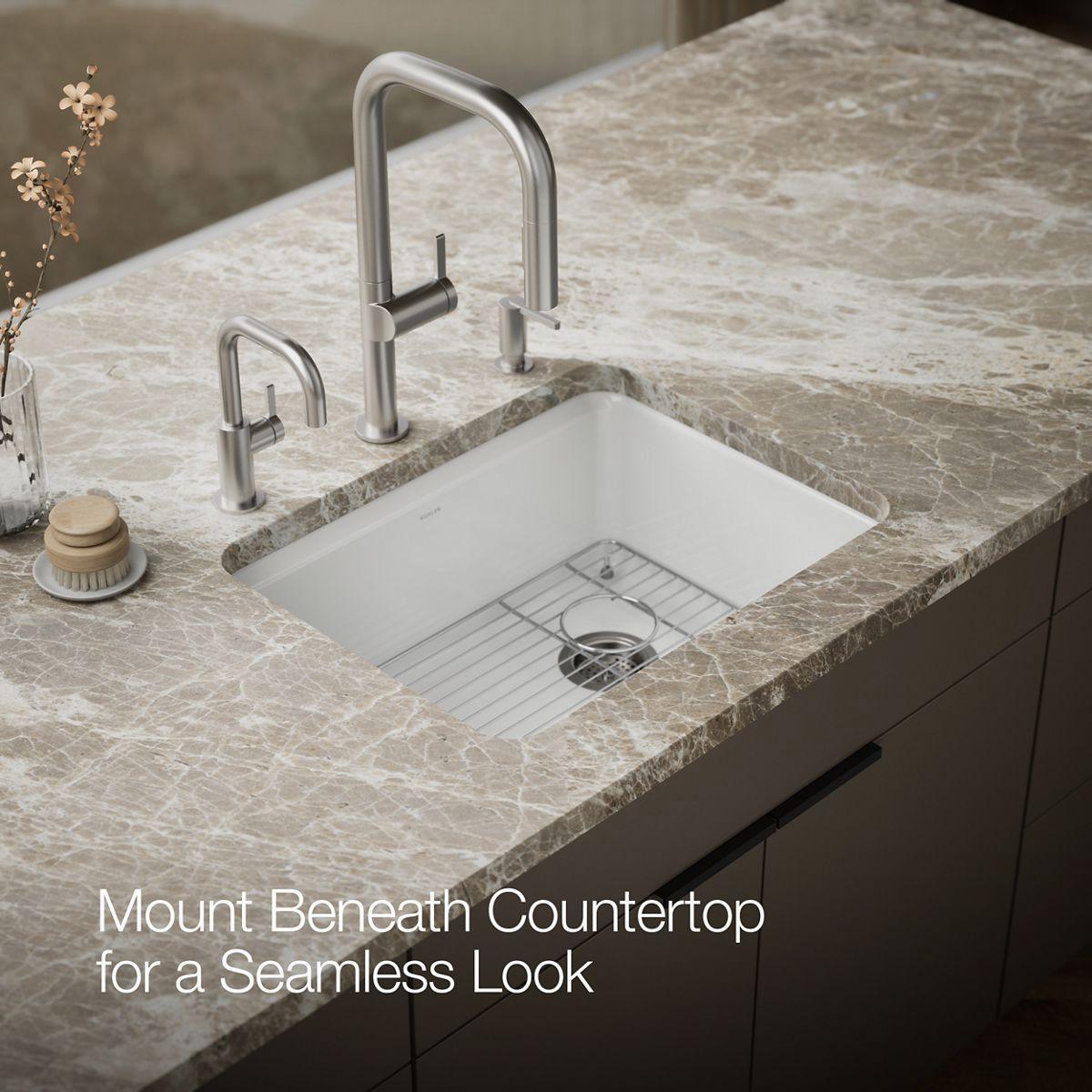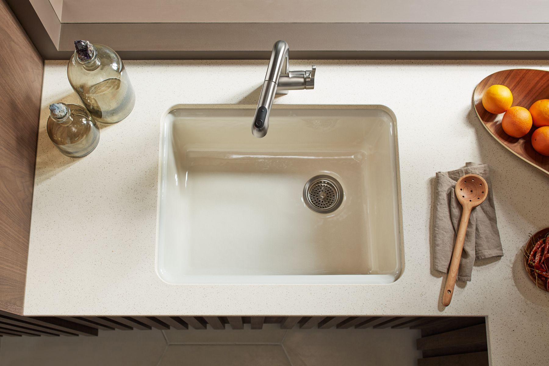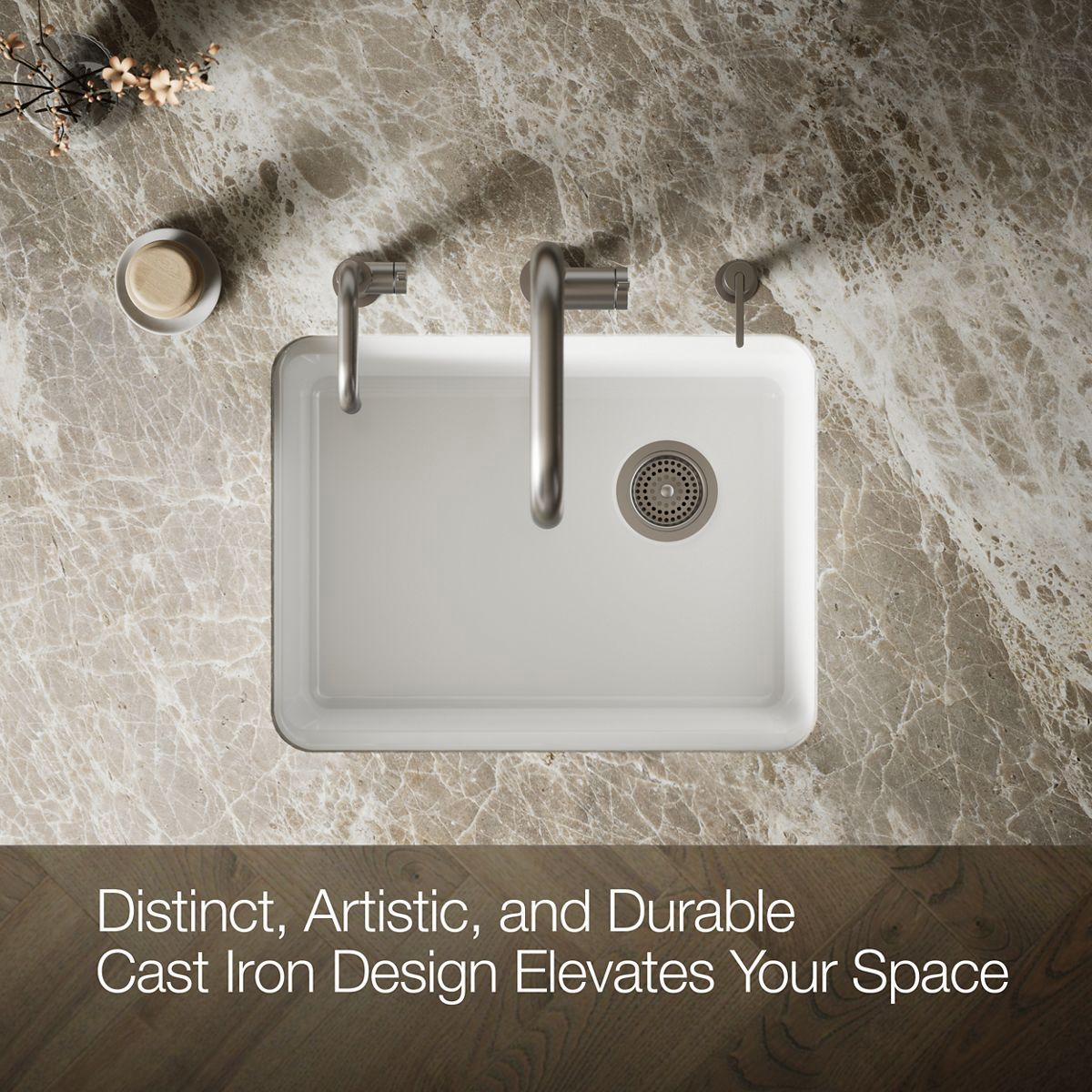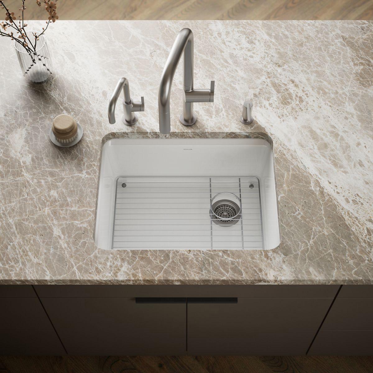 Sized to fit small spaces, the Riverby sink is an elegant and versatile addition to the kitchen as a primary, secondary, bar, or utility sink. A single-bowl provides ample space to soak and wash large items, while front and back beveled edges help keep water in the sink. A sloped base to a single offset drain minimizes water pooling. Crafted from enameled cast iron, this sink resists chipping, cracking, or burning for years of beauty and reliable performance. An included custom-fit sink rack also helps protect the sink surface from daily wear.
