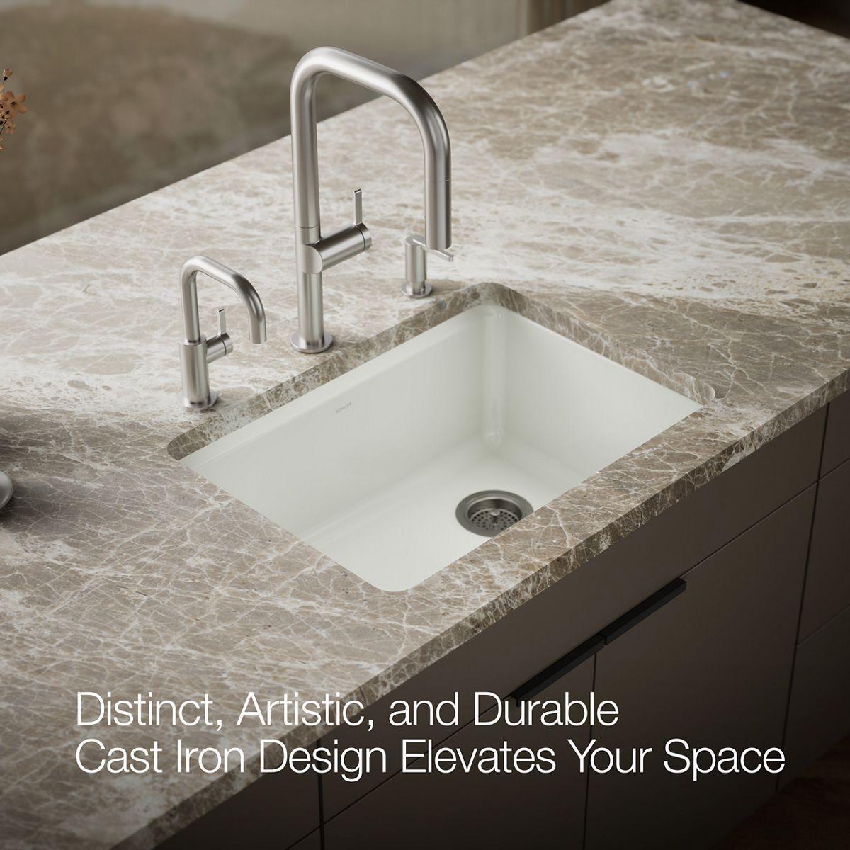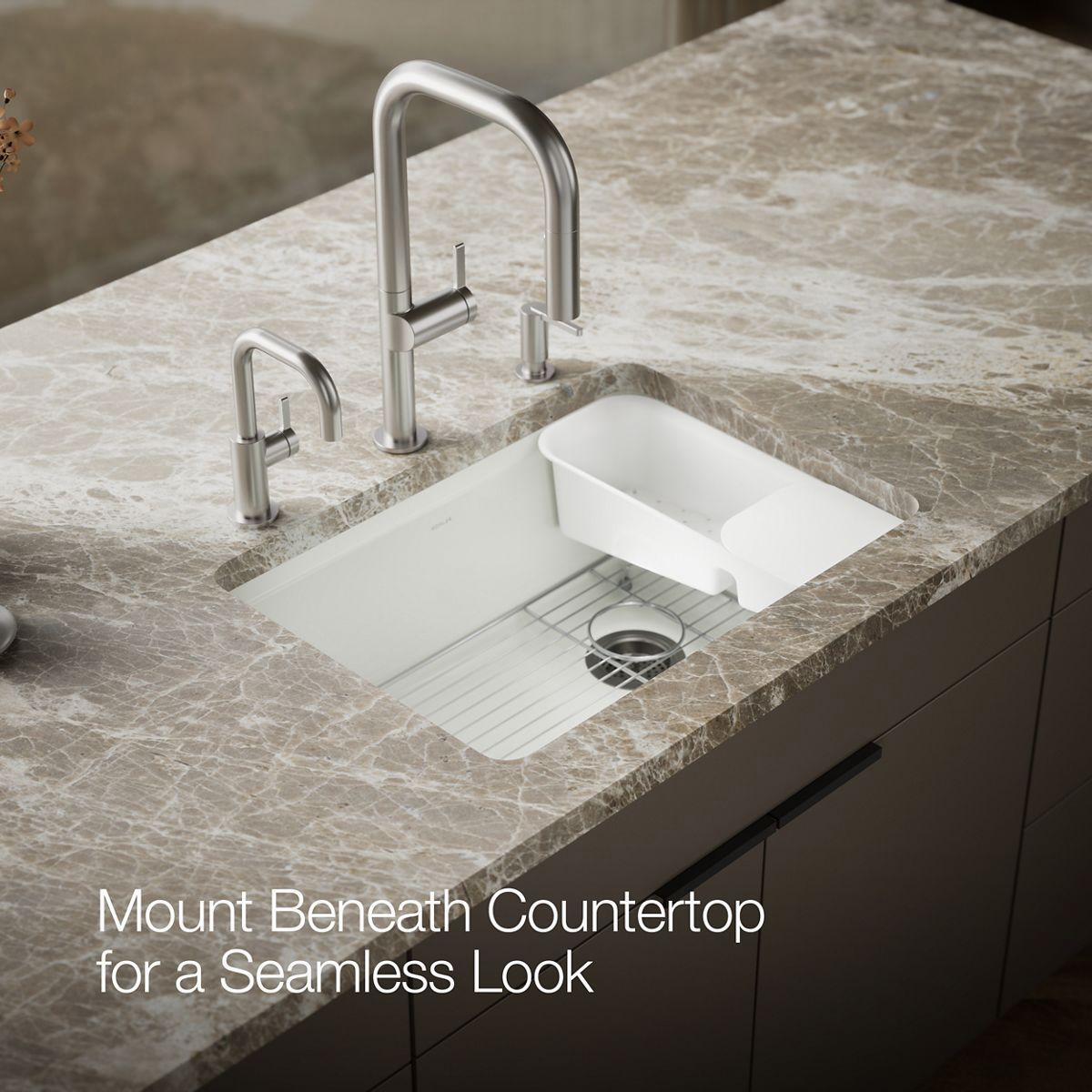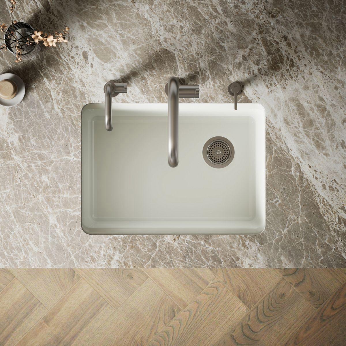 The understated beauty of this Riverby sink makes it an elegant and versatile addition to the kitchen. A single, large bowl provides ample space to soak and wash cookware, while a sloped base minimizes water pooling. Crafted from enameled cast iron, this sink resists chipping, cracking, or burning for years of beauty and reliable performance. It comes with a custom-fit colander with integral cutting board and a stainless-steel bottom sink rack.