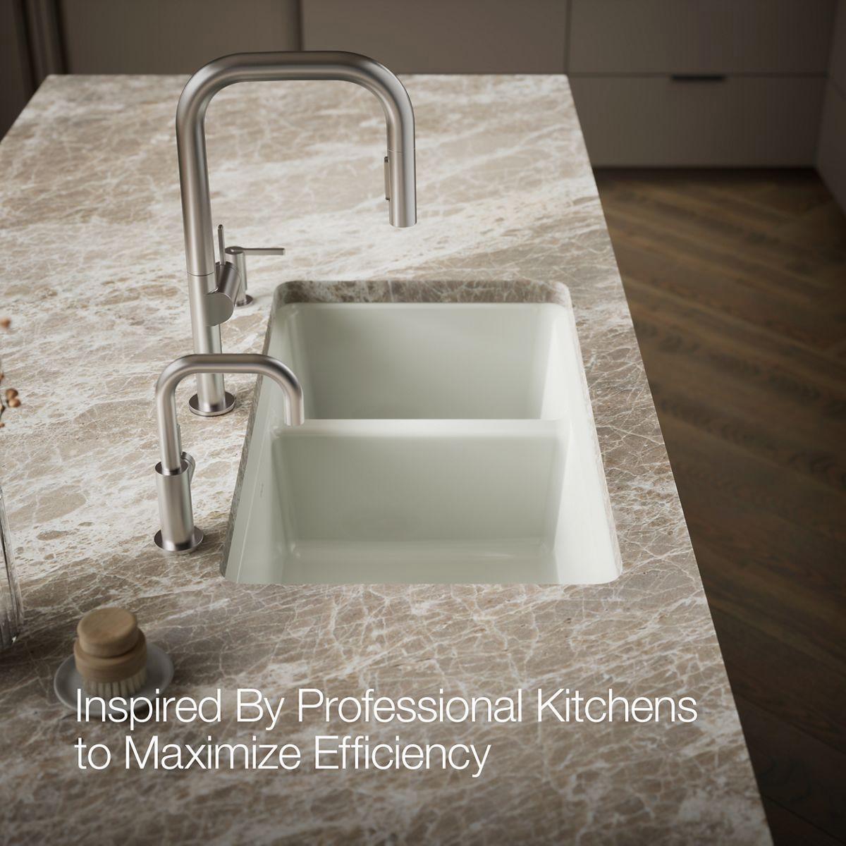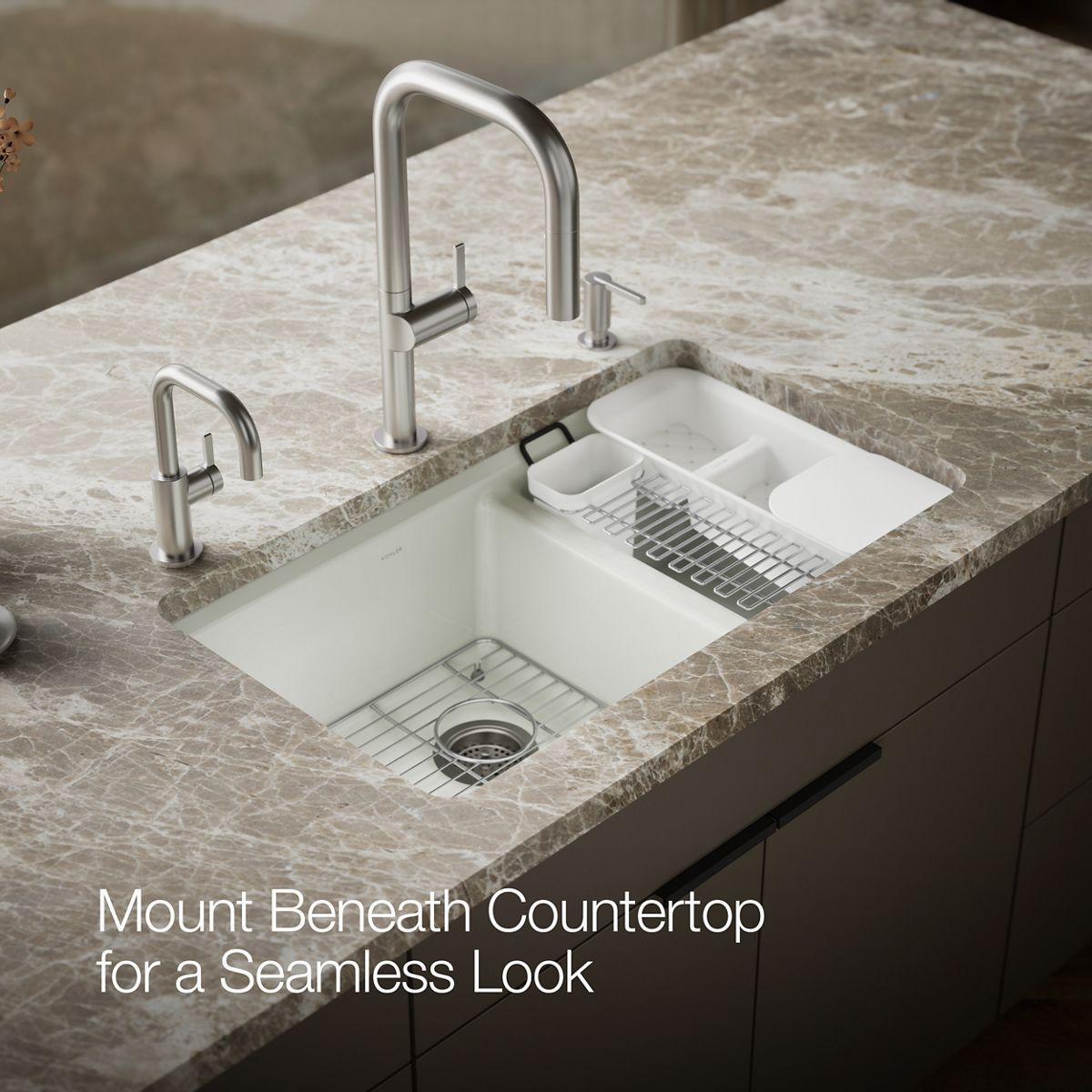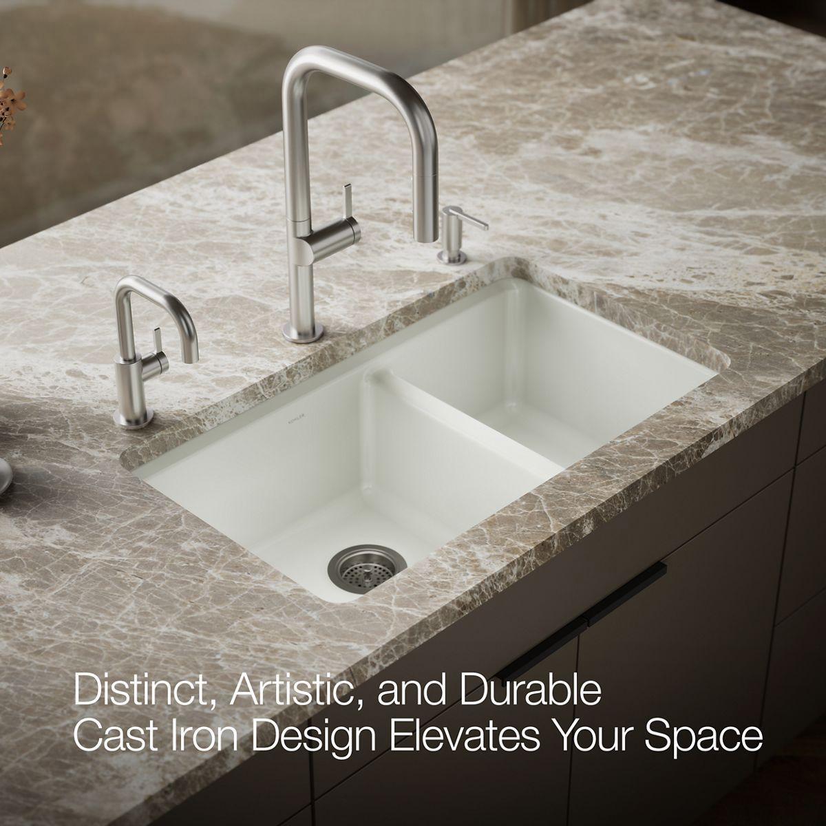 The understated beauty of this Riverby sink makes it an elegant and versatile addition to the kitchen. The large/medium bowls allow you to keep clean and dirty dishes separate, while a sloped base minimizes water pooling. Crafted from enameled cast iron, this sink resists chipping, cracking, or burning for years of beauty and reliable performance. It comes with a custom-fit colander with integral cutting board, a utility rack with soaking cup, and a stainless-steel bottom sink rack.