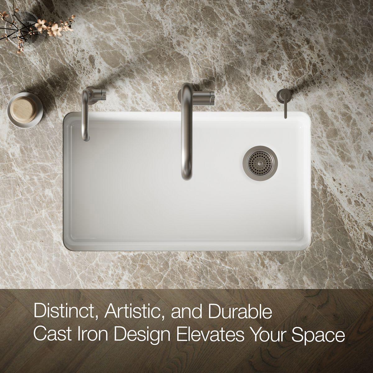 The understated beauty of this ADA-compliant Riverby sink makes it an elegant and versatile addition to the kitchen. A single, large bowl provides ample space to soak and wash cookware, while a sloped base to a single offset drain minimizes water pooling. Crafted from enameled cast iron, this sink resists chipping, cracking, or burning for years of beauty and reliable performance.