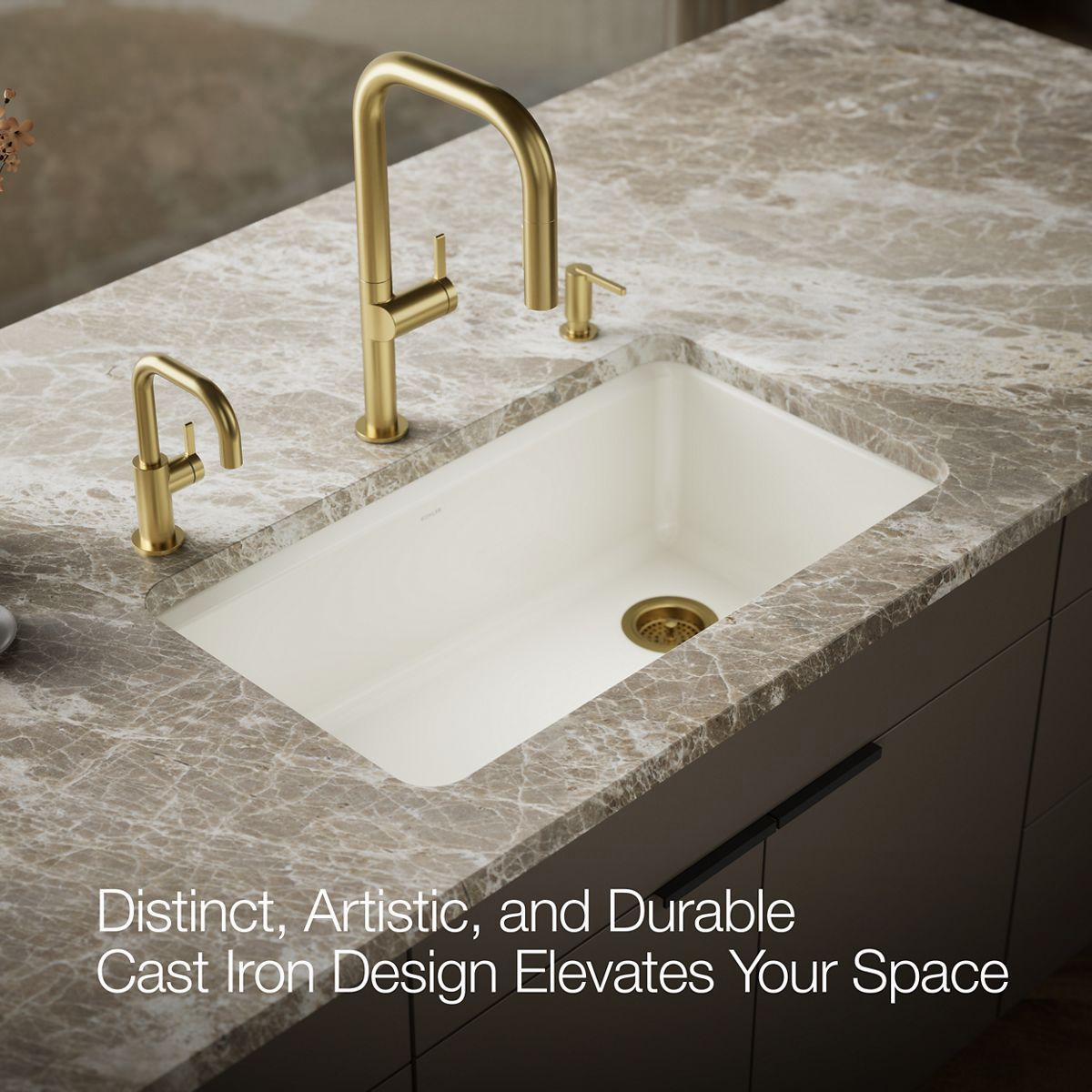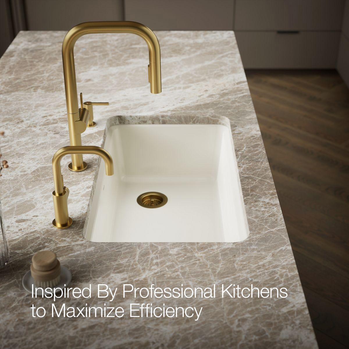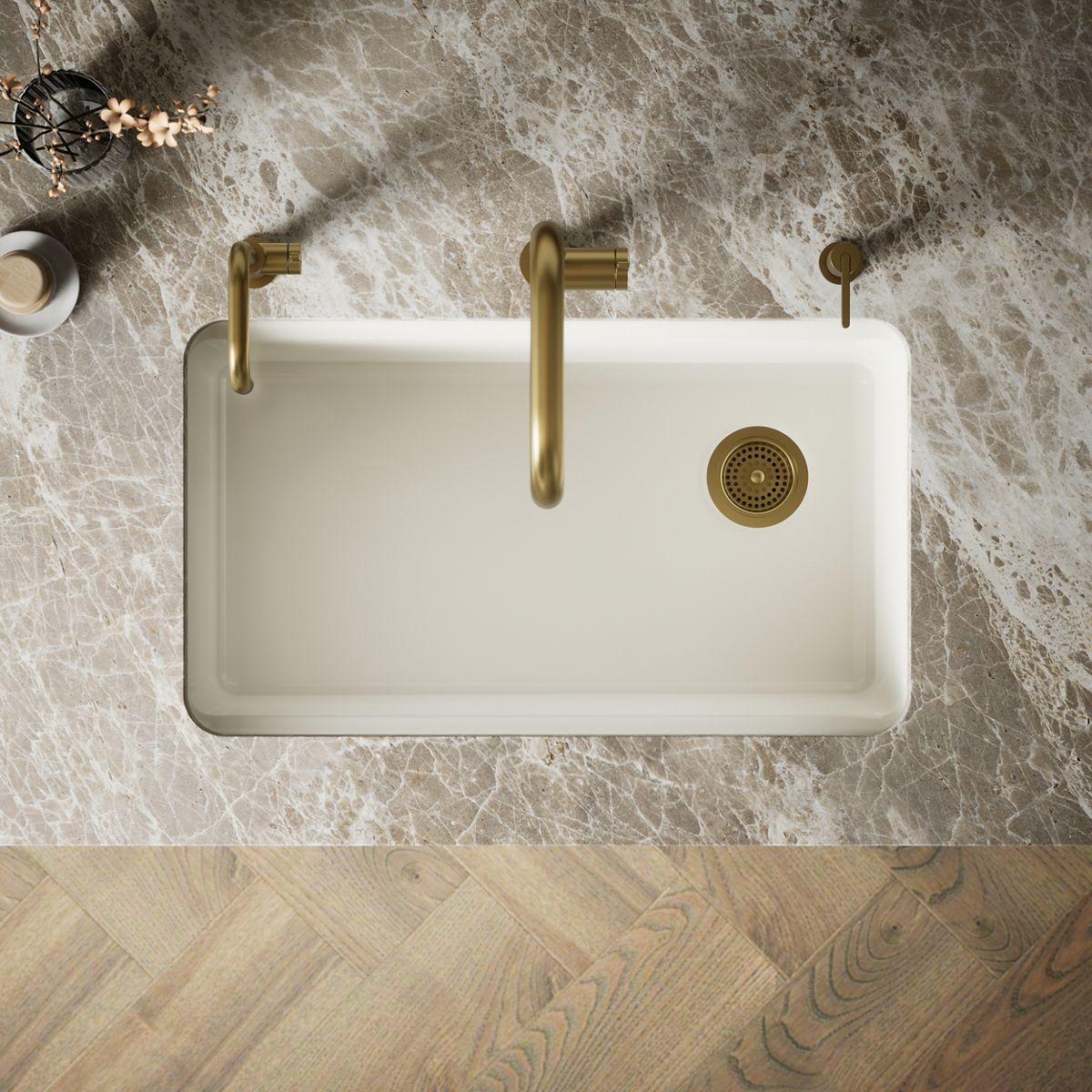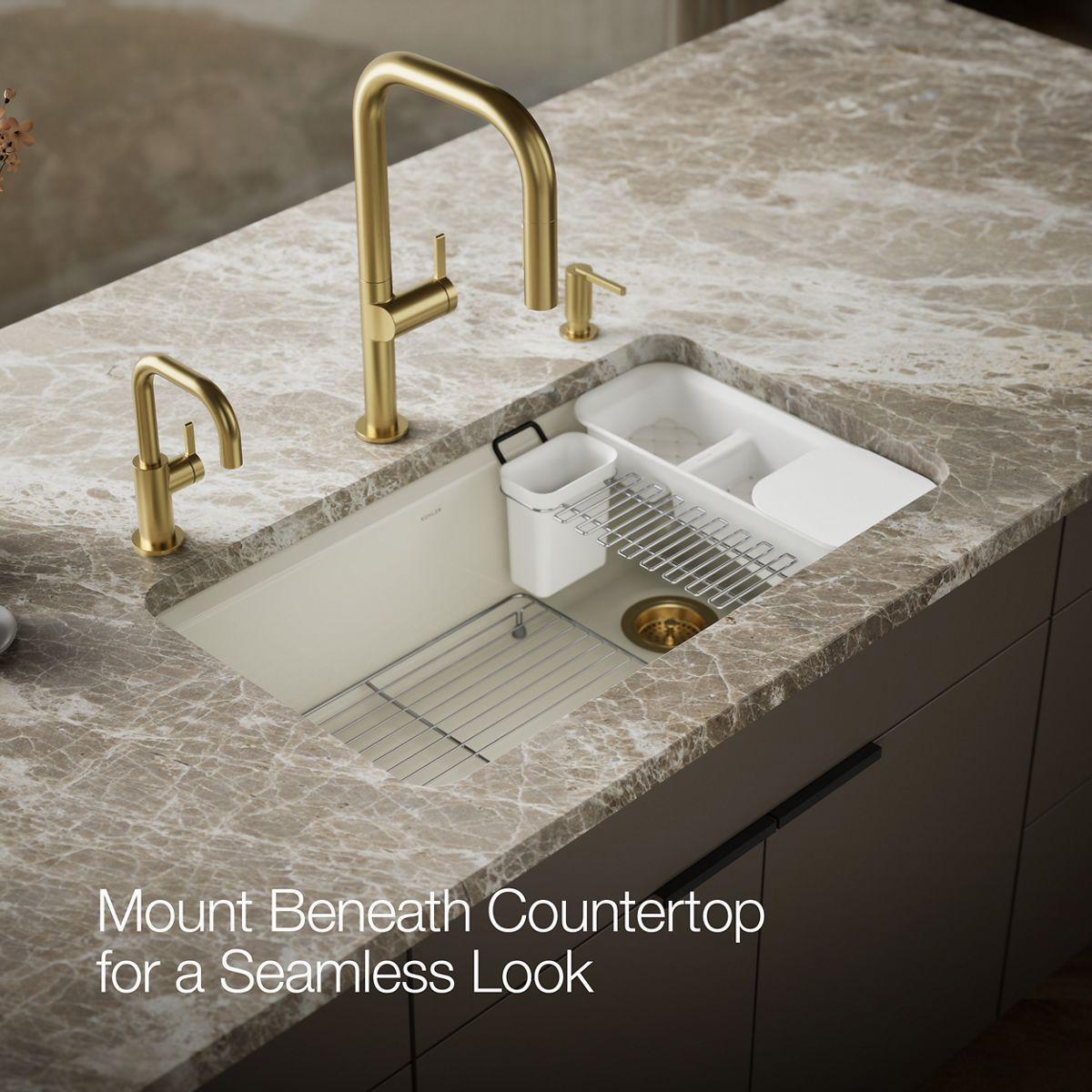 The understated beauty of this Riverby sink makes it an elegant and versatile addition to the kitchen. A single, large bowl provides ample space to soak and wash cookware, while a sloped base to a single offset drain minimizes water pooling. Crafted from enameled cast iron, this sink resists chipping, cracking, or burning for years of beauty and reliable performance. It comes with a custom-fit colander with integral cutting board, a utility rack with soaking cup, and a left-hand, stainless-steel bottom sink rack.