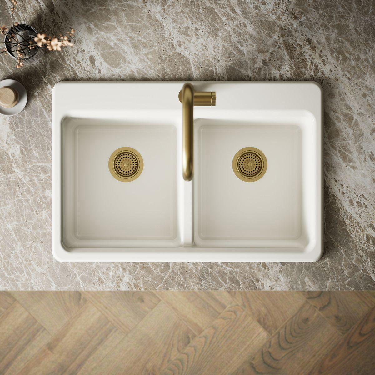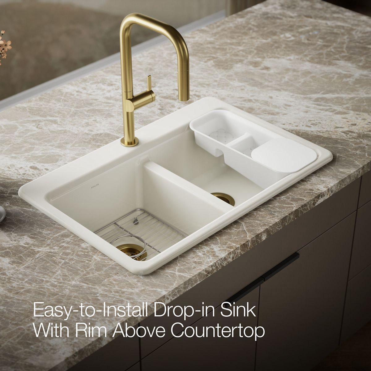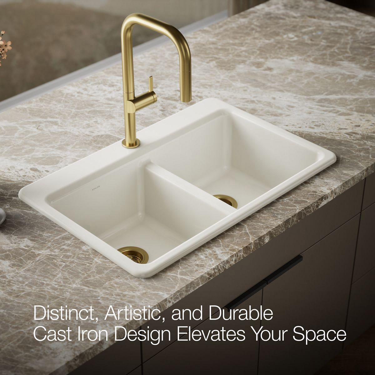 The understated beauty of this Riverby sink makes it an elegant and versatile addition to the kitchen. The two equal-sized basins feature a sloped base that minimizes water pooling. Crafted from enameled cast iron, this sink resists chipping, cracking, or burning for years of beauty and reliable performance. It comes with a custom-fit colander with integral cutting board and a stainless-steel bottom sink rack.