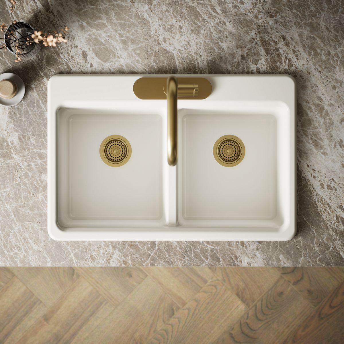 The understated beauty of this Riverby sink makes it an elegant and versatile addition to the kitchen. The two equal-sized basins feature a sloped base that minimizes water pooling. Crafted from enameled cast iron, this sink resists chipping, cracking, or burning for years of beauty and reliable performance. It comes with a custom-fit colander with integral cutting board and a stainless-steel bottom sink rack.
