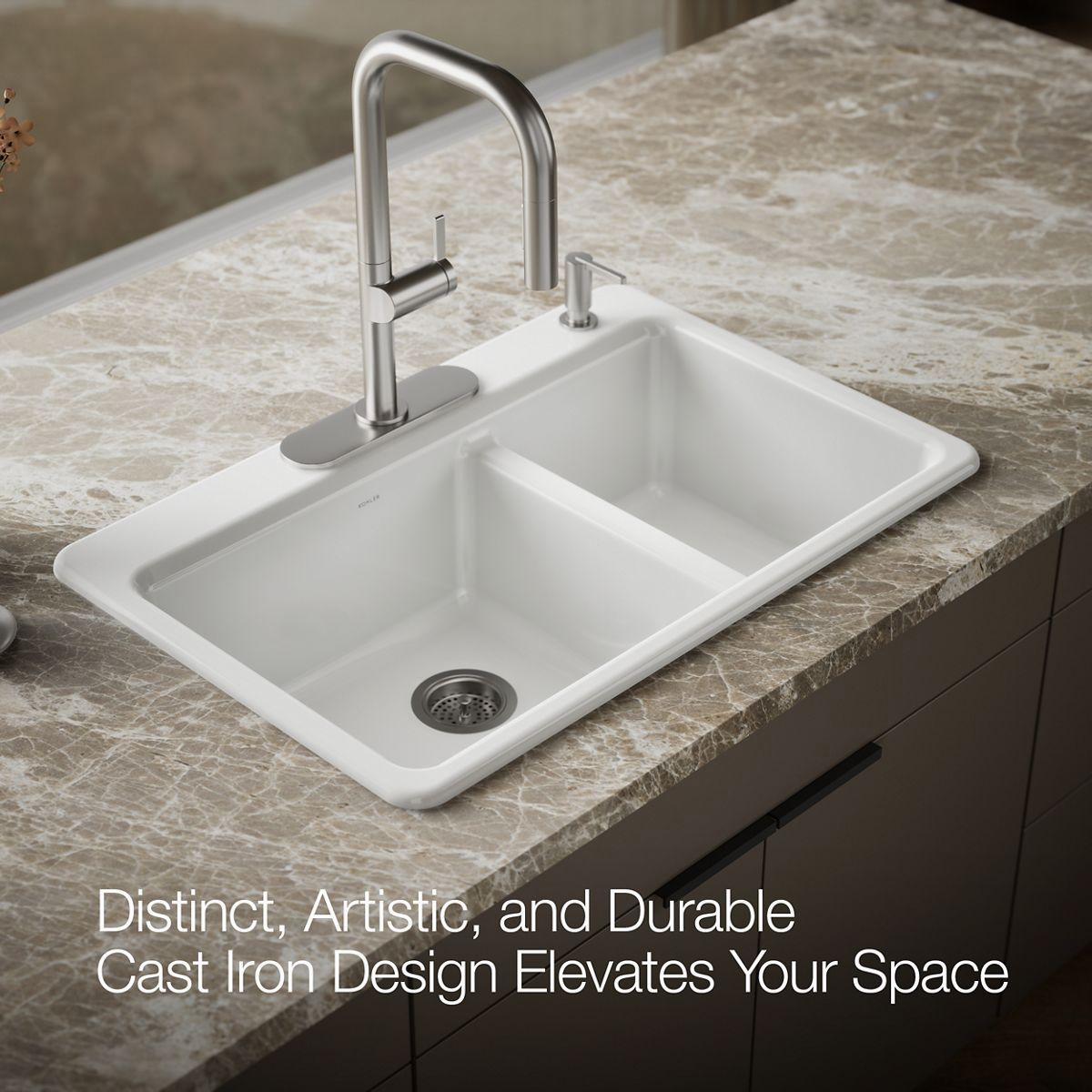 The understated beauty of this Riverby sink makes it an elegant and versatile addition to the kitchen. The large/medium bowls allow you to keep clean and dirty dishes separate, while a sloped base minimizes water pooling. Crafted from enameled cast iron, this sink resists chipping, cracking, or burning for years of beauty and reliable performance. It comes with a custom-fit colander with integral cutting board and a stainless-steel bottom sink rack.