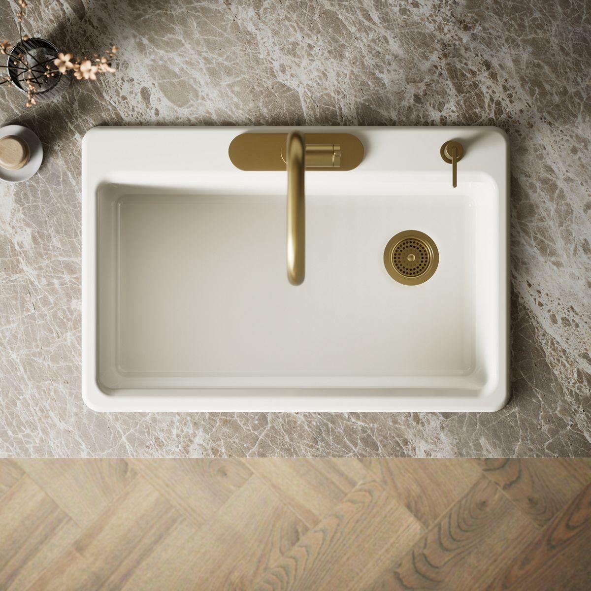 The understated beauty of this Riverby sink makes it an elegant and versatile addition to the kitchen. A single, large bowl provides ample space to soak and wash cookware, while a sloped base to a single offset drain minimizes water pooling. Crafted from enameled cast iron, this sink resists chipping, cracking, or burning for years of beauty and reliable performance. It comes with a custom-fit colander with integral cutting board and a left-hand, stainless-steel bottom sink rack.