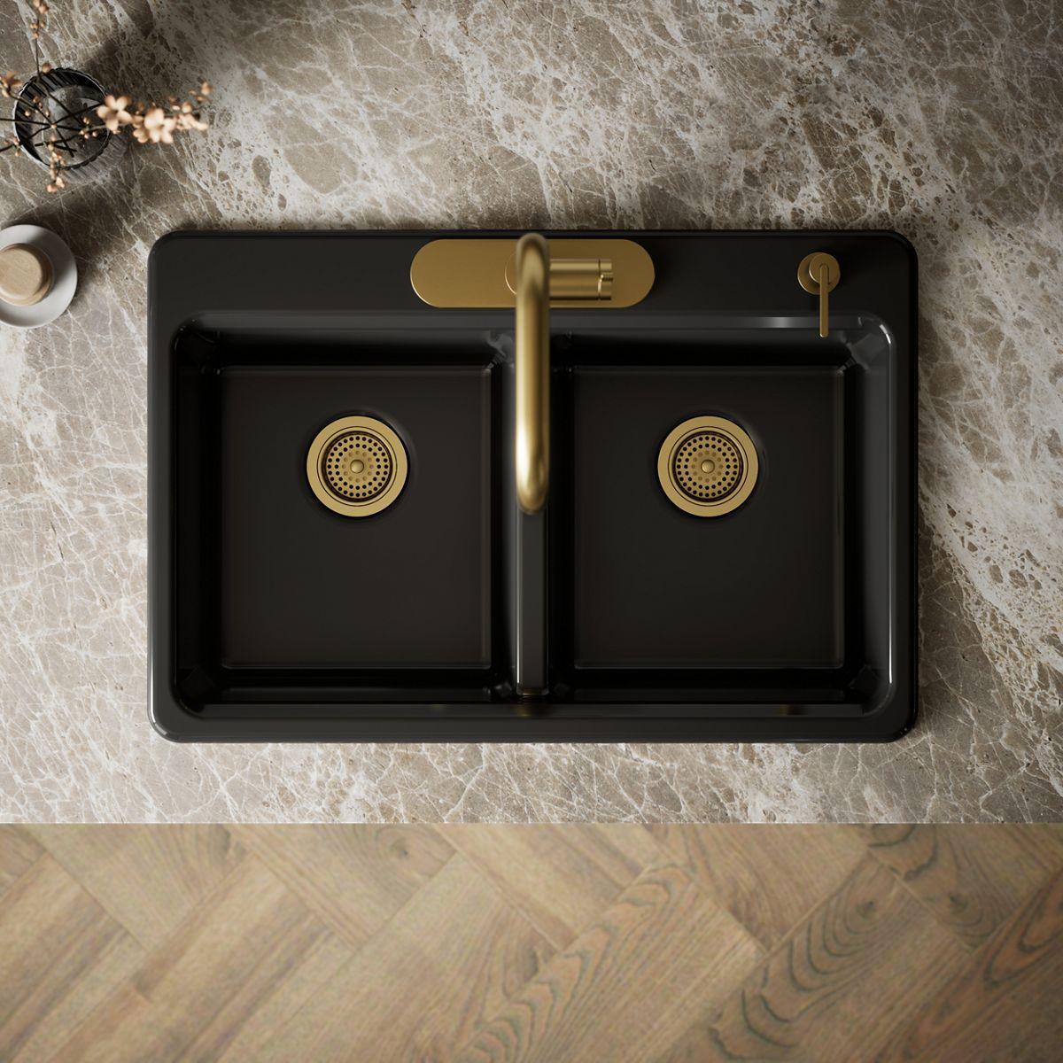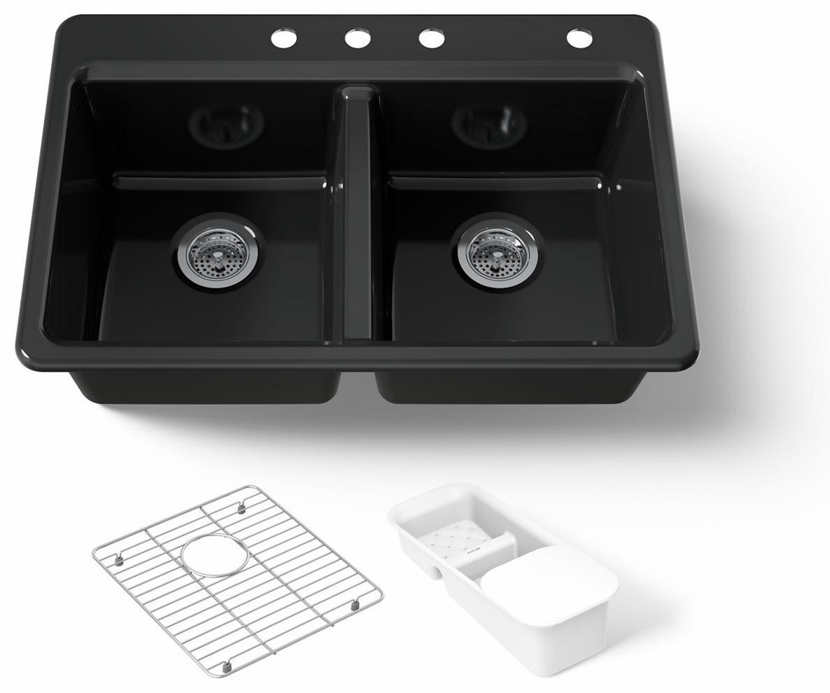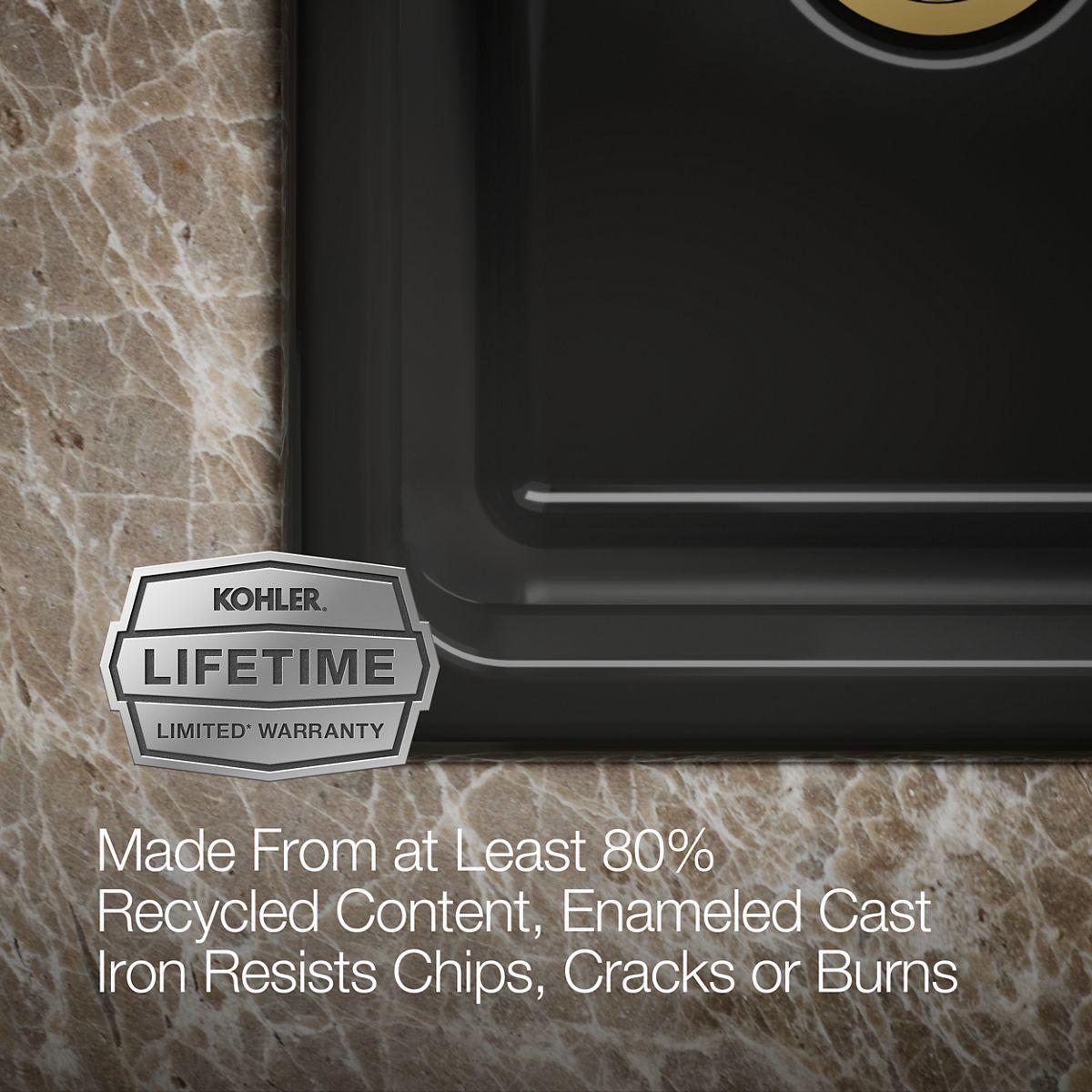 The understated beauty of this Riverby sink makes it an elegant and versatile addition to the kitchen. The two equal-sized basins feature a sloped base that minimizes water pooling. Crafted from enameled cast iron, this sink resists chipping, cracking, or burning for years of beauty and reliable performance. It comes with a custom-fit colander with integral cutting board and a stainless-steel bottom sink rack.