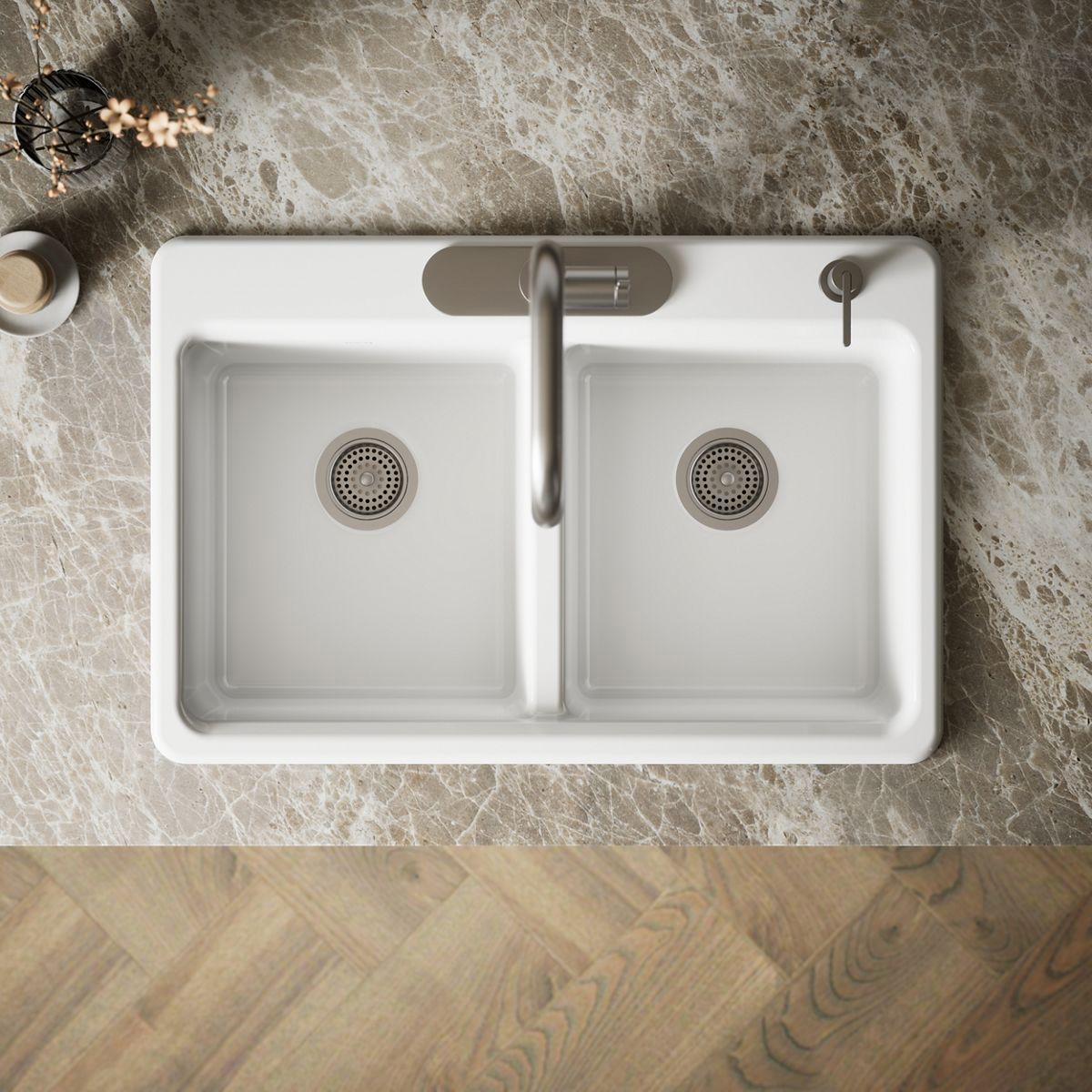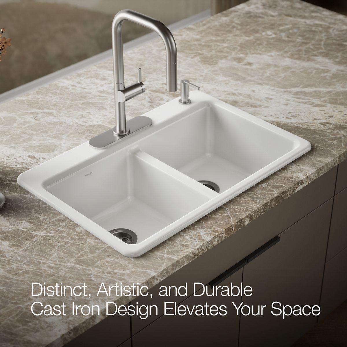 The understated beauty of this Riverby sink makes it an elegant and versatile addition to the kitchen. The two equal-sized basins feature a sloped base that minimizes water pooling. Crafted from enameled cast iron, this sink resists chipping, cracking, or burning for years of beauty and reliable performance. It comes with a custom-fit colander with integral cutting board and a stainless-steel bottom sink rack.