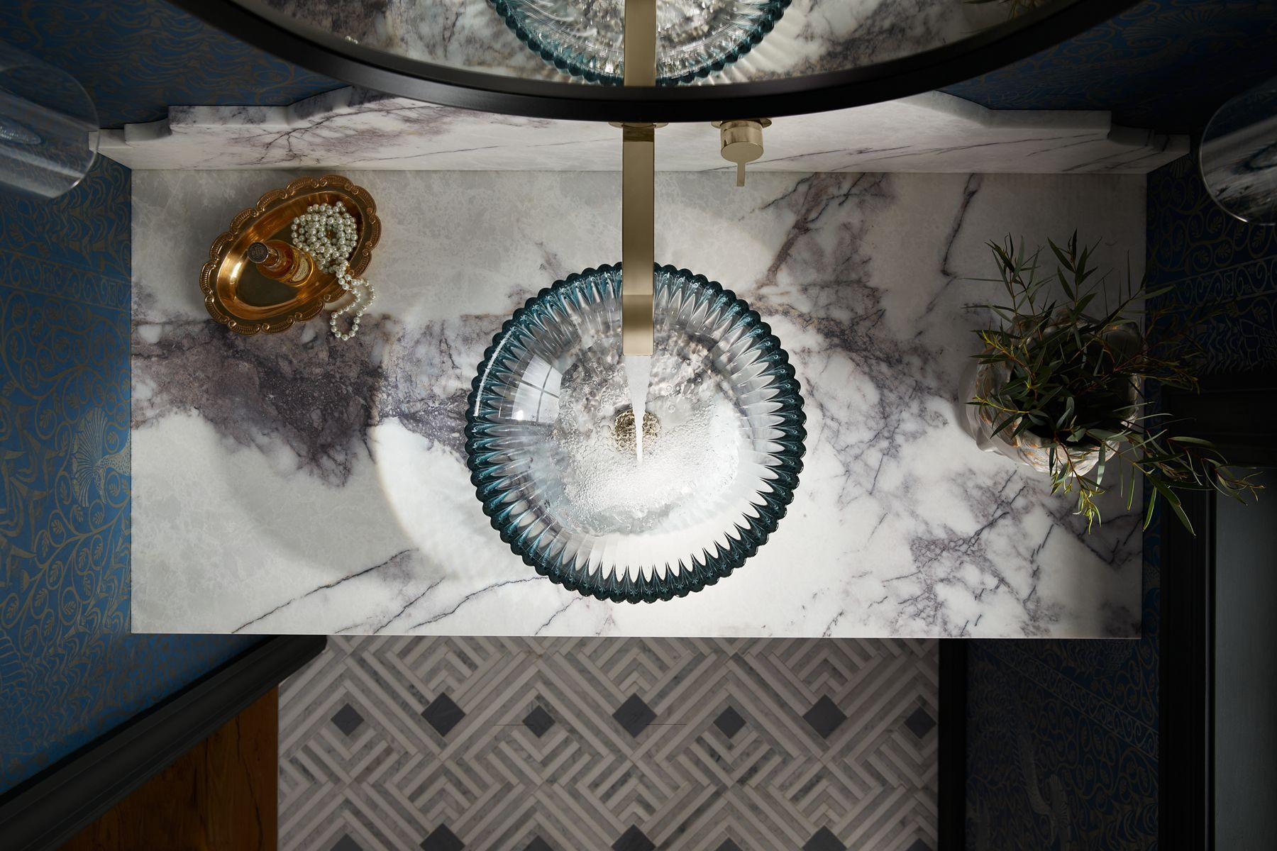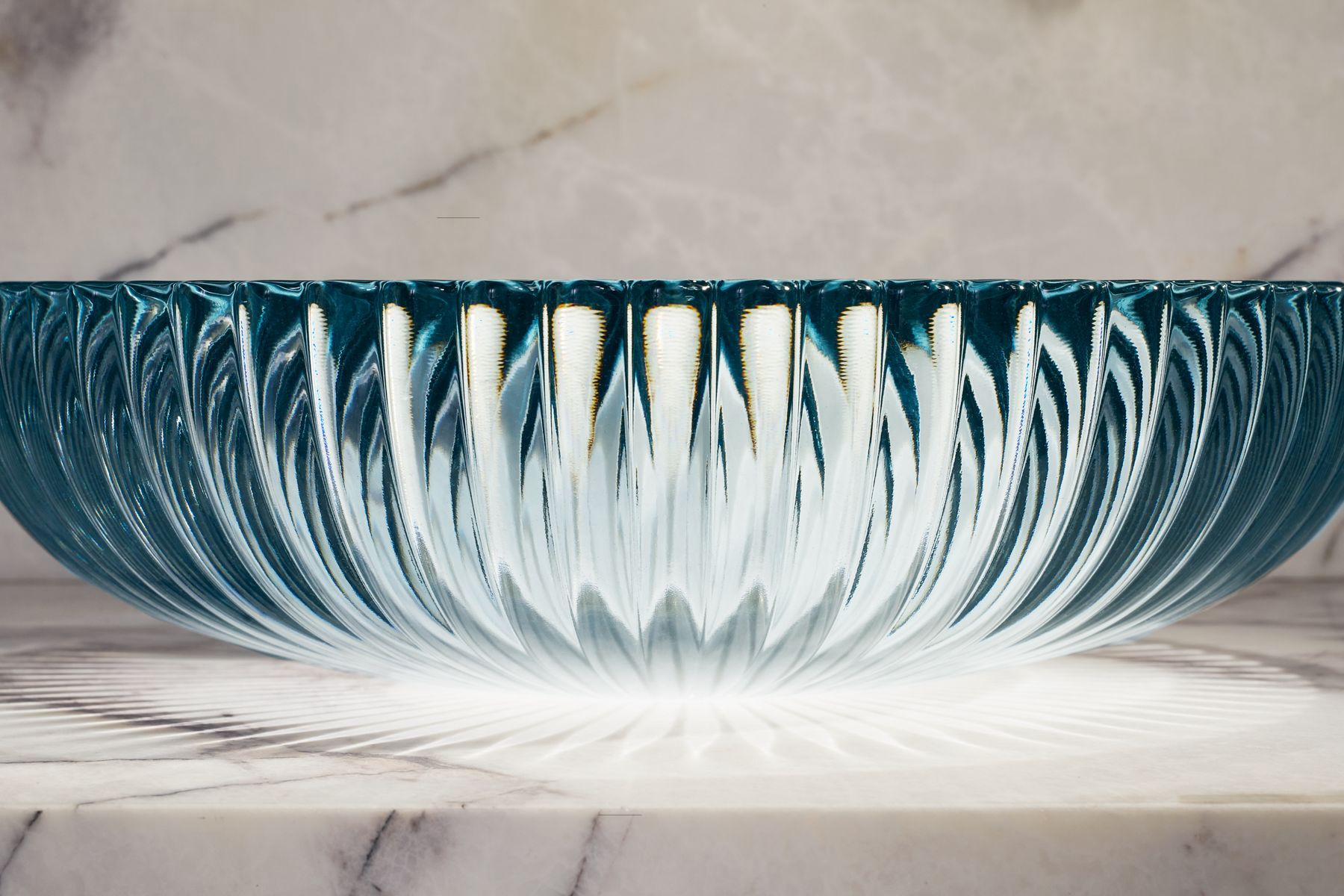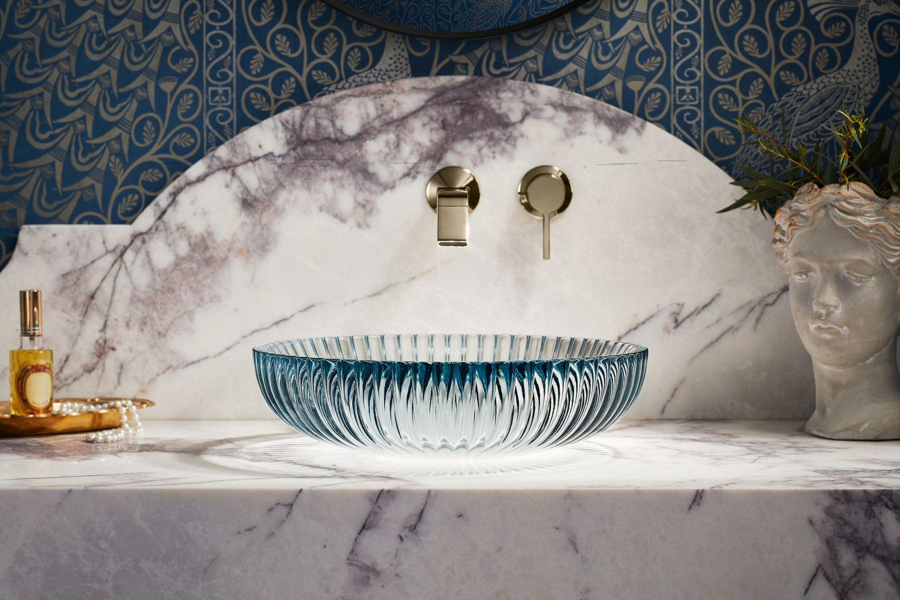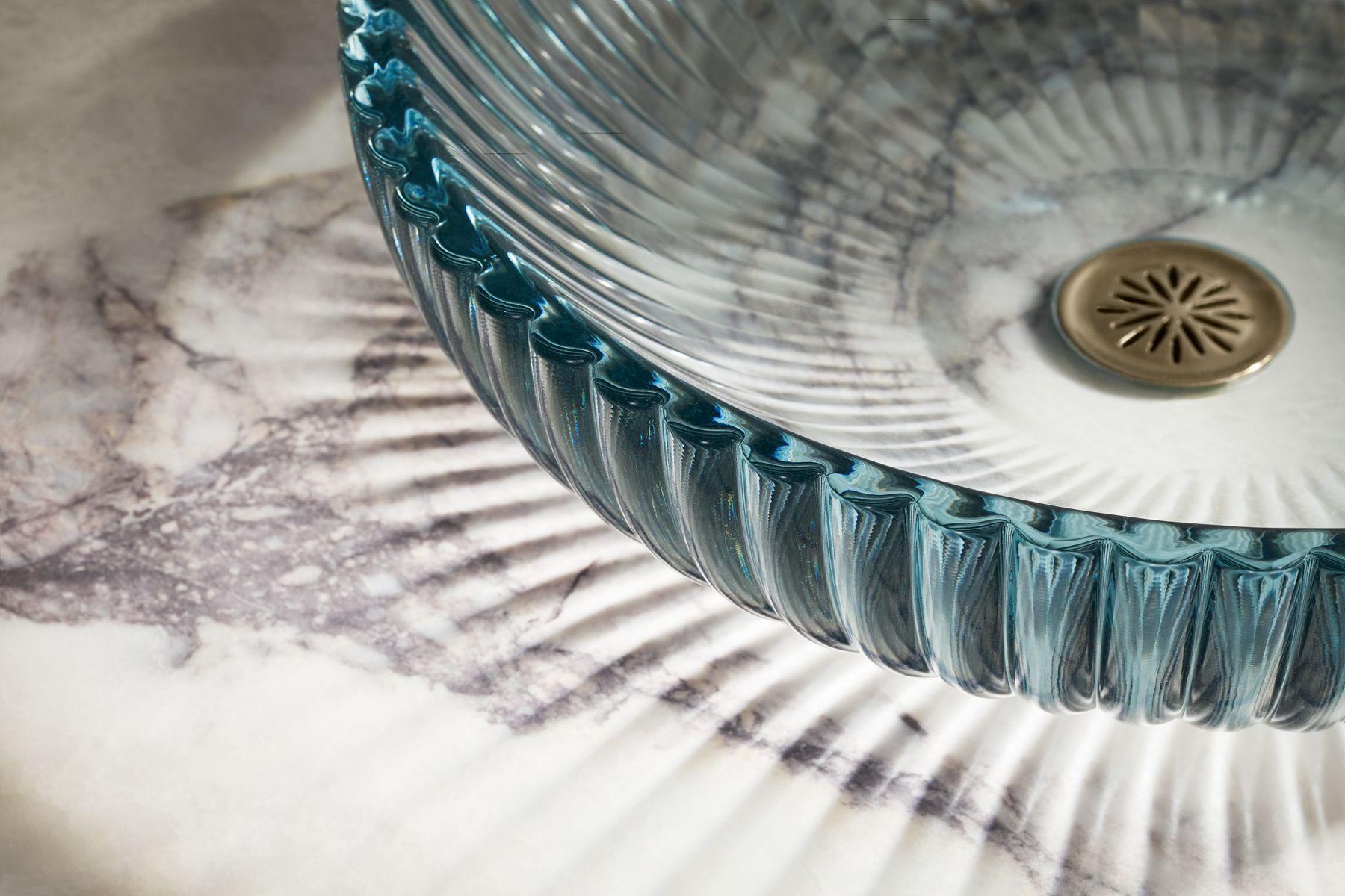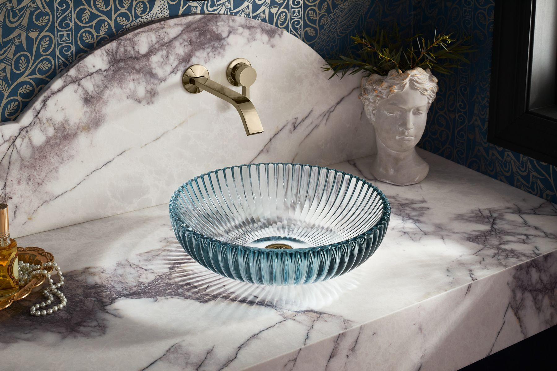 Like the coupe Champagne glass that inspired its design, the Salute vessel sink makes a statement—celebrating handcrafted artisan authenticity, elegance, and function in the bathroom space. Petite in size, this 15 vessel sink is ideal for small spaces, with an impression extending well beyond its stature. Vintage-style ribbing adorns the basin's exterior, creating unique radial reflections on the surrounding countertop, while a scalloped rim adds a glamorous finishing touch. Cheers to this unique and spectacular bathroom centerpiece.