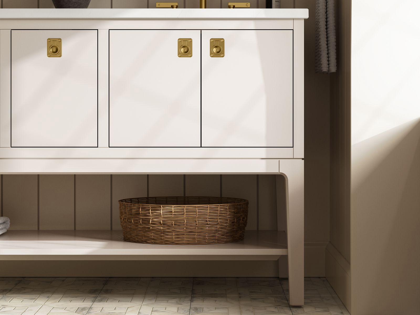 Drawing inspiration from the archives, the Seagrove vanity collection from Kohler x Studio McGee combines classic and modern influences in a timeless expression for the home. Imbued with midcentury modern style, the vanity design features tapered legs adorned with beveled edges and gracefully curved transitions—all unmistakable hallmarks of the era. The inclusion of dimensional details like drop ring pulls embellished with exposed slotted screws create a striking balance, infusing the overall aesthetic with an enduring quality.