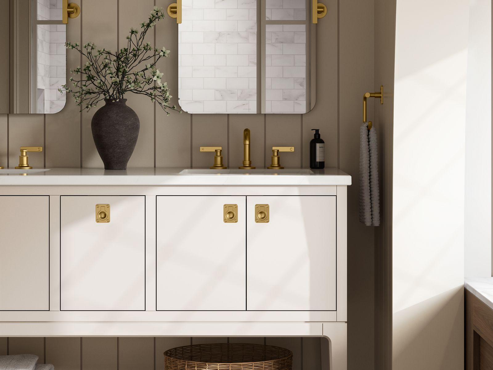 Drawing inspiration from the archives, the Seagrove vanity collection from Kohler x Studio McGee combines classic and modern influences in a timeless expression for the home. Imbued with midcentury modern style, the vanity design features tapered legs adorned with beveled edges and gracefully curved transitions—all unmistakable hallmarks of the era. The inclusion of dimensional details like drop ring pulls embellished with exposed slotted screws create a striking balance, infusing the overall aesthetic with an enduring quality.
