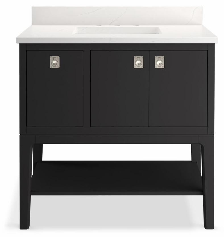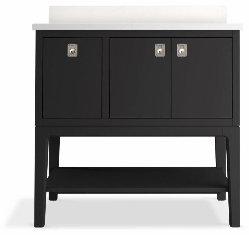- Set includes cabinet, precut quartz vanity top, backsplash, sink, tall legs and shelf, cabinet hardware