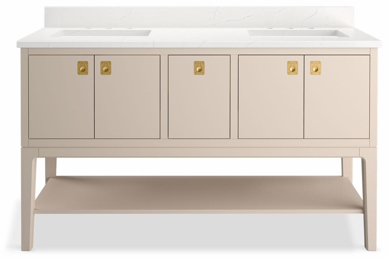 Drawing inspiration from the archives, the Seagrove vanity collection from Kohler x Studio McGee combines classic and modern influences in a timeless expression for the home. Imbued with midcentury modern style, the vanity design features tapered legs adorned with beveled edges and gracefully curved transitions—all unmistakable hallmarks of the era. The inclusion of dimensional details like drop ring pulls embellished with exposed slotted screws create a striking balance, infusing the overall aesthetic with an enduring quality.
