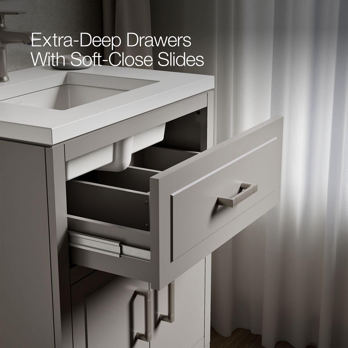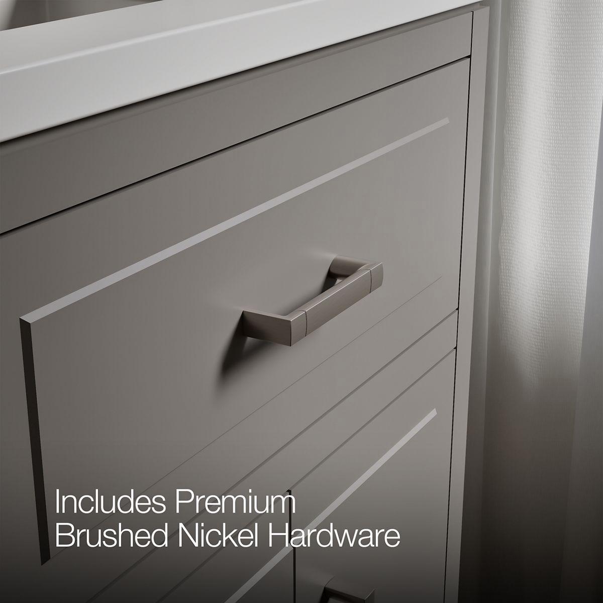 • Brushed Nickel hardware included on the White and Atmos Grey vanities