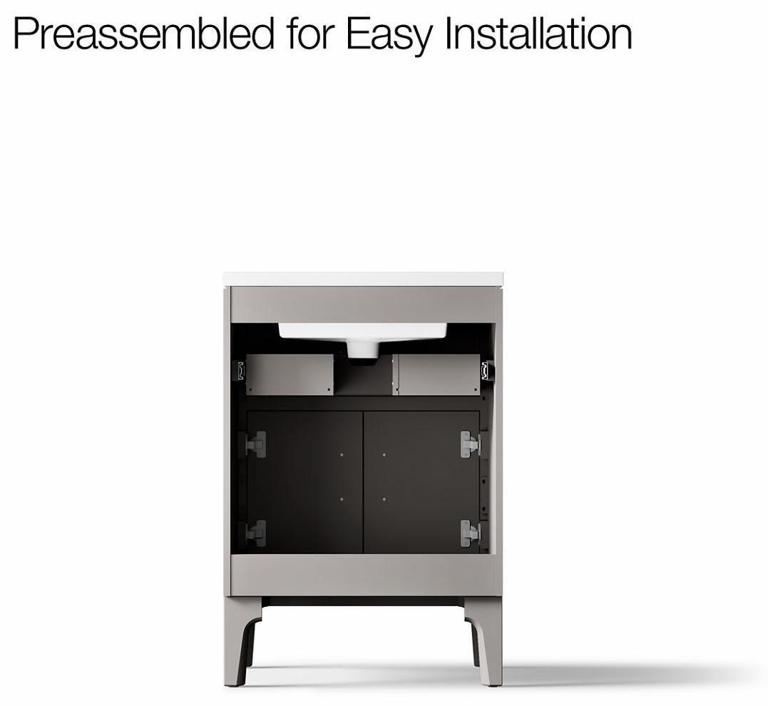 • Set includes cabinet, precut quartz vanity top, sink, legs, and cabinet hardware.