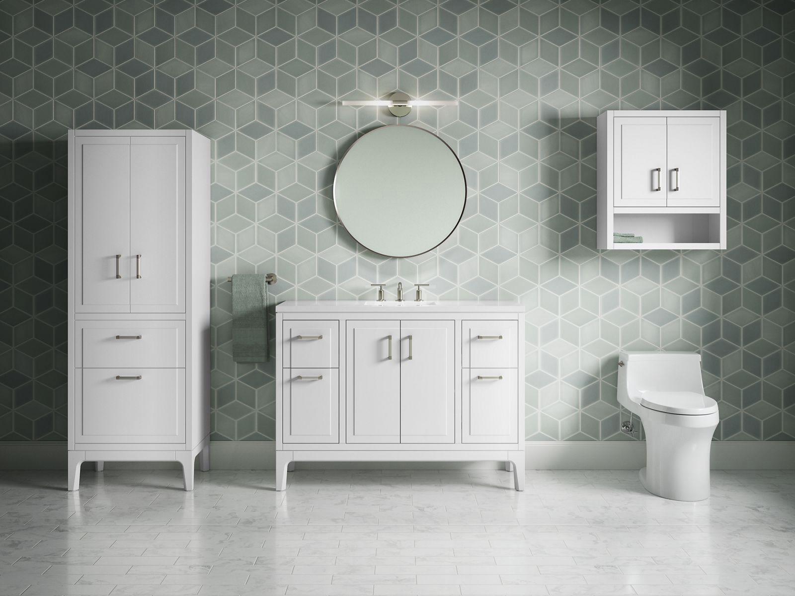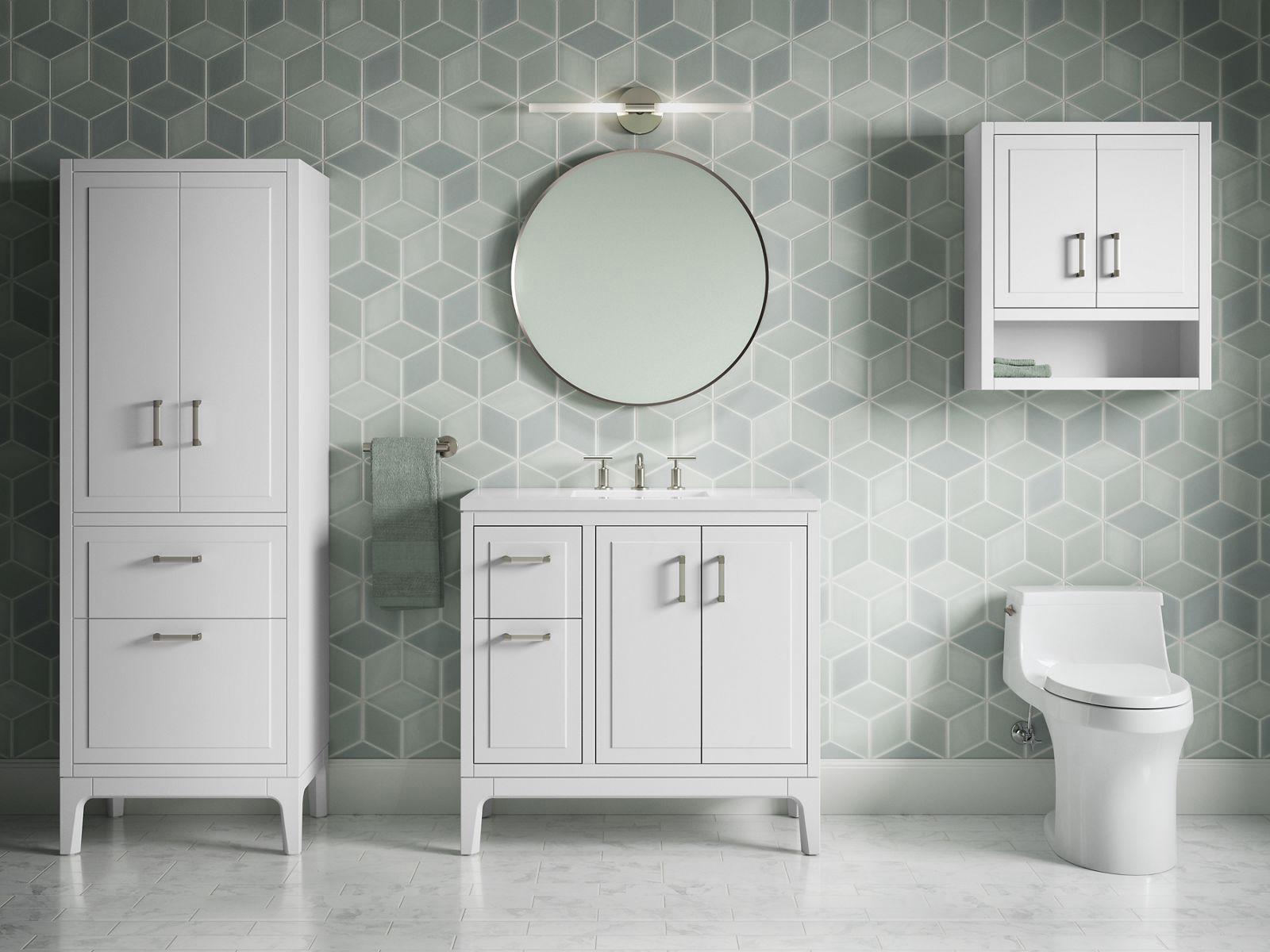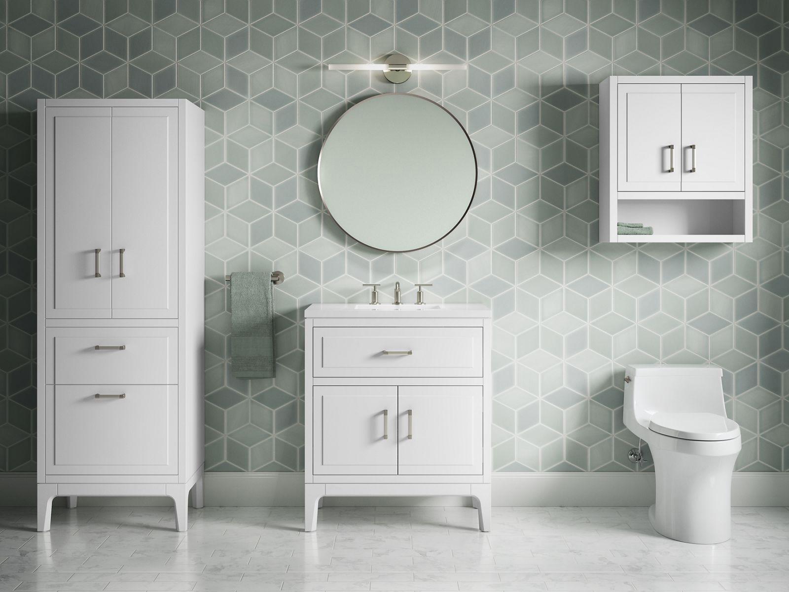 Inspired by midcentury modern design, the Seer bathroom cabinet collection is adorned with elegant lines, subtle textures, and minimalist simplicity, bridging the gap between commonplace and niche. Raised-center door and drawer panels add visual interest, along with sharply squared hardware pulls featuring subtle details. Linen tower, finish-matched legs, and Vibrant Brushed Nickel hardware are included. Contrasting stained-wood legs and additional hardware finishes are also available.