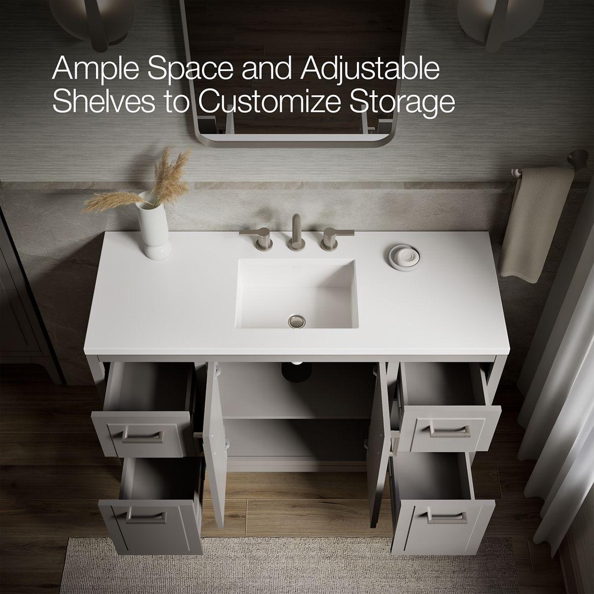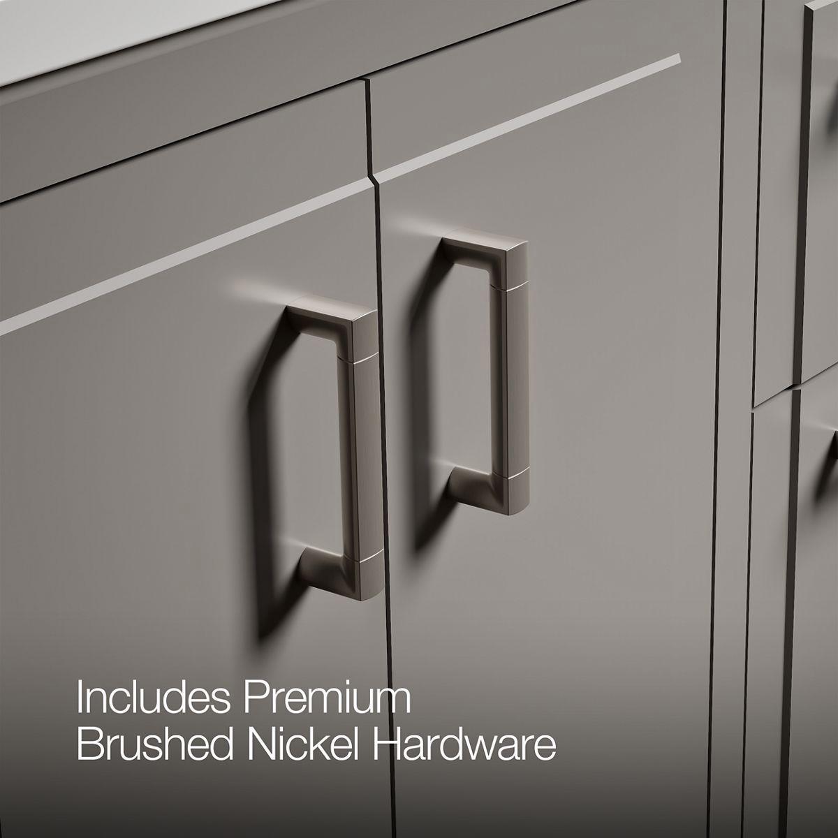 - Brushed Nickel hardware included on the White and Atmos Grey vanities