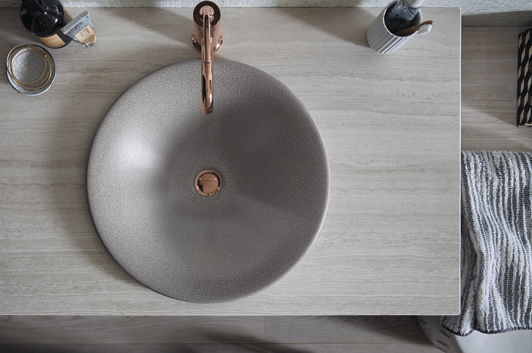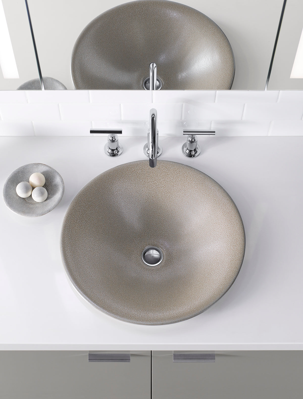 The Shagreen collection celebrates the subtle coloring and distinctive pebbled texture of natural shark and ray leather. Inspired by oil spot glazes that originated in China during the Song Dynasty, a two-step glaze process uses minerals to create an interplay of shimmery and matte effects. A striking complement to the graceful Carillon vessel sink, the rich glazed finish shows iridescent pearly tones and a gently granulated texture similar to leather. Each sink's pattern, formed through an organic process, is unique.
