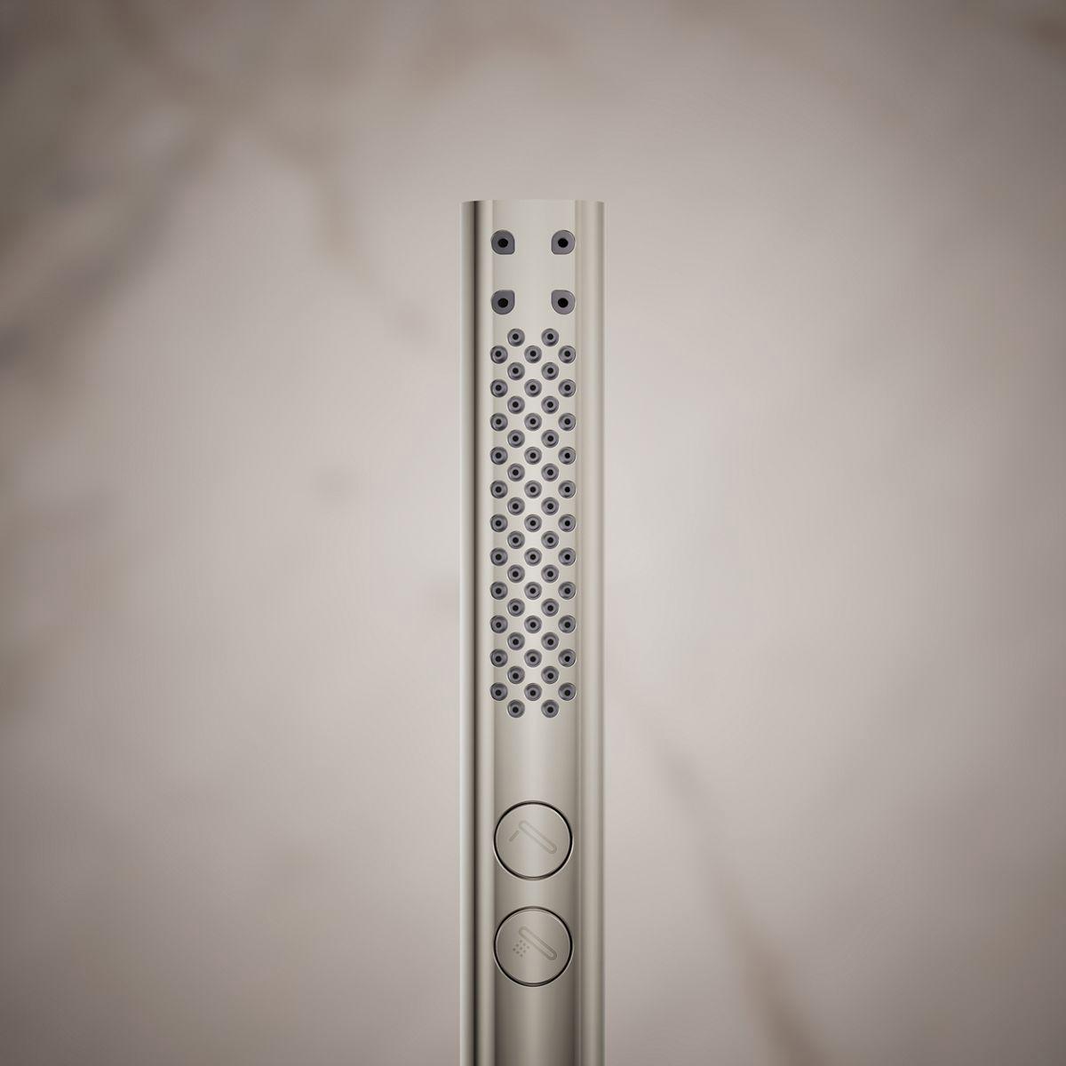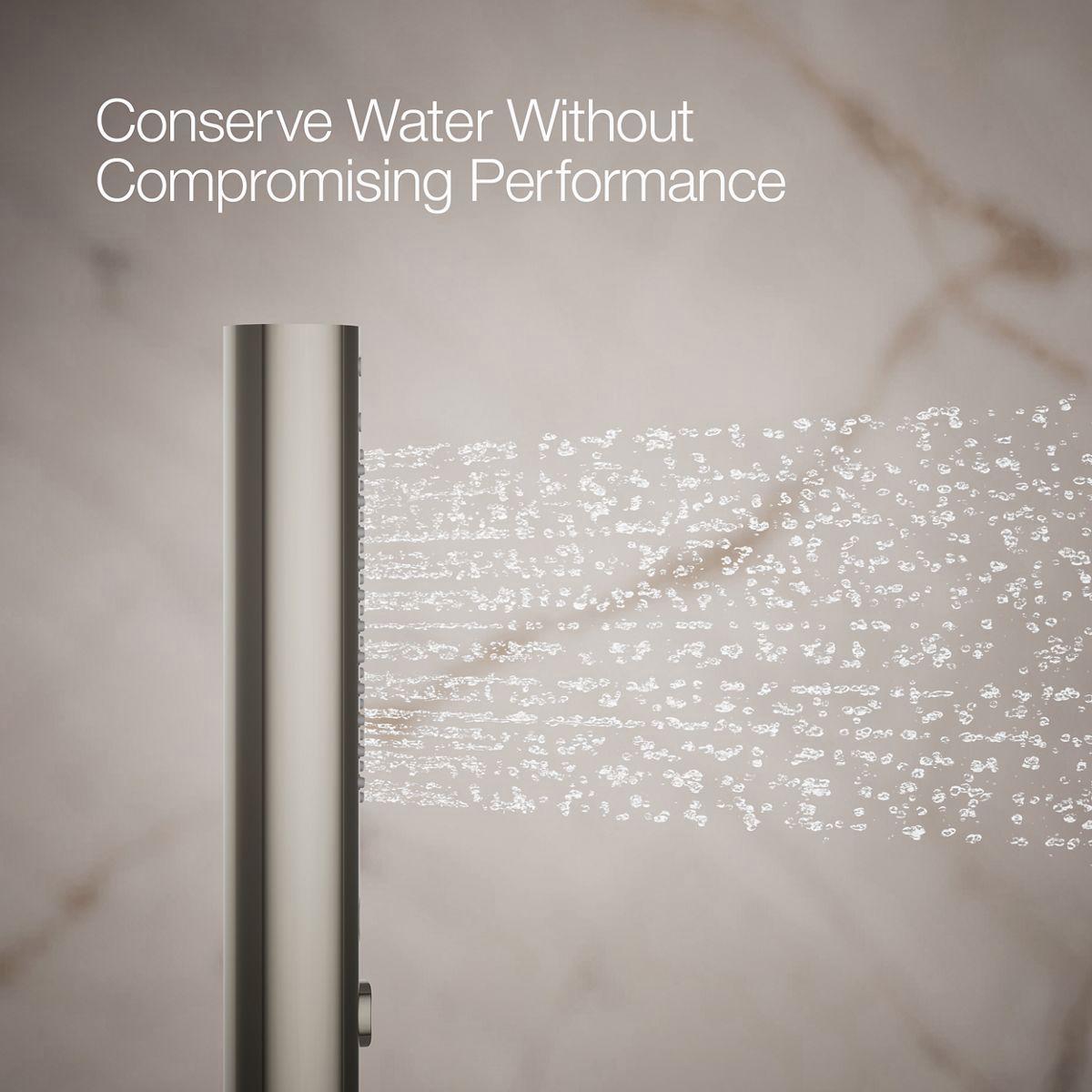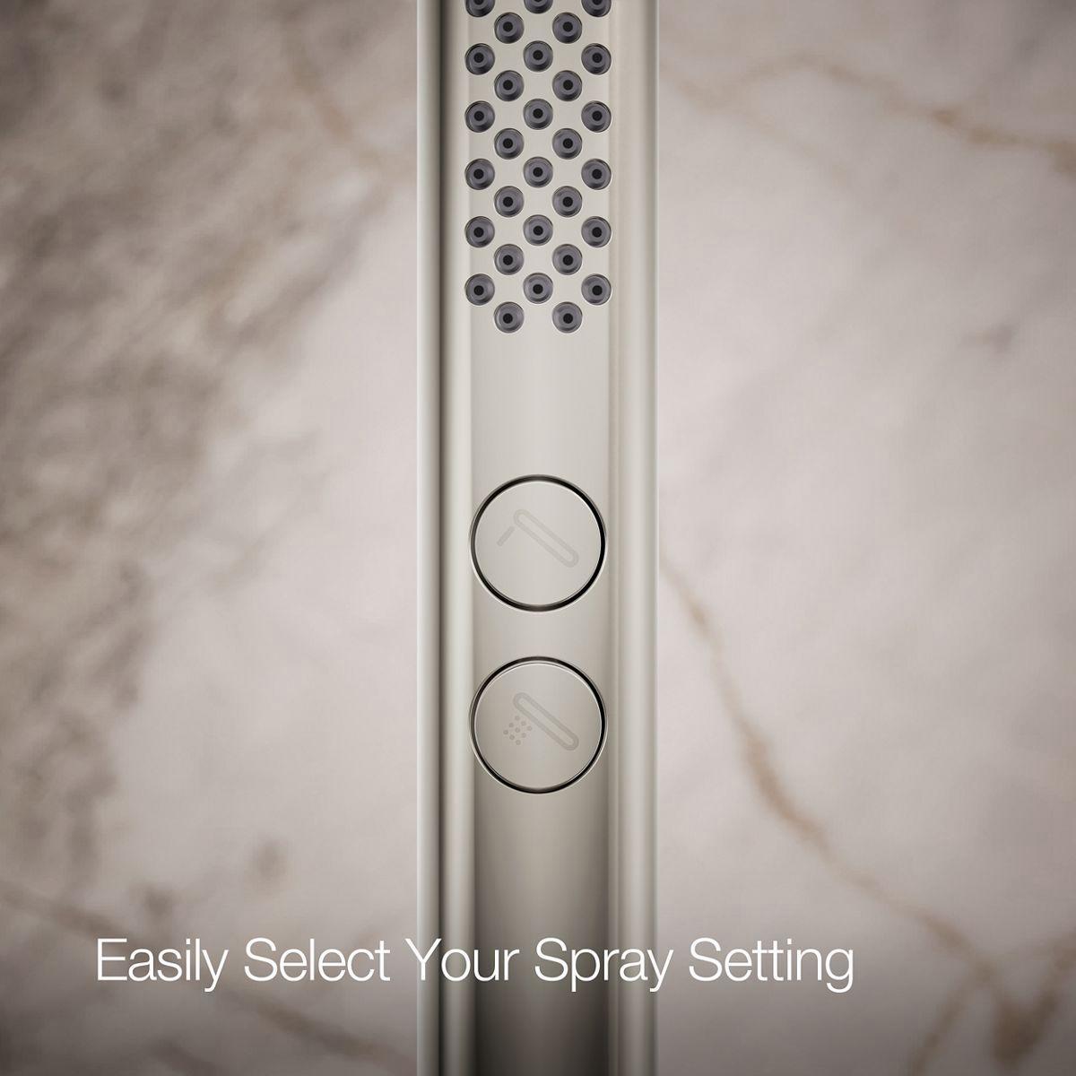 Your perfect shower spray, delivered at the touch of a button. The sleek, contemporary Shift + handshower includes a push-button for effortless transition between full-coverage and targeted massage sprays, all enhanced with Katalyst technology for a completely indulgent showering experience. By infusing two liters of air per minute, Katalyst produces a powerful, voluptuous spray that clings to the body with larger, fuller water drops.