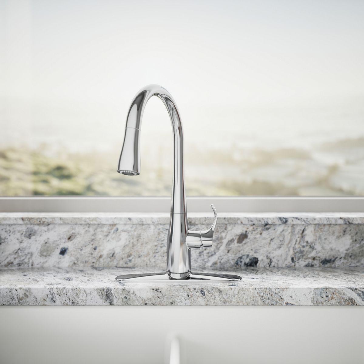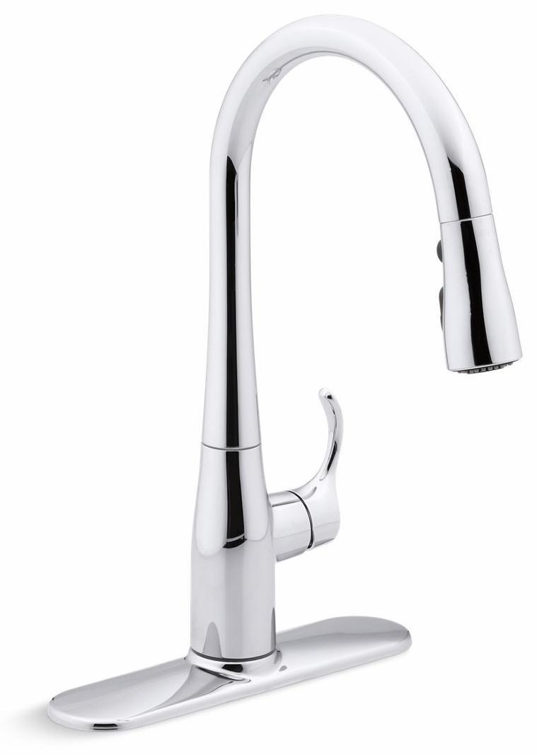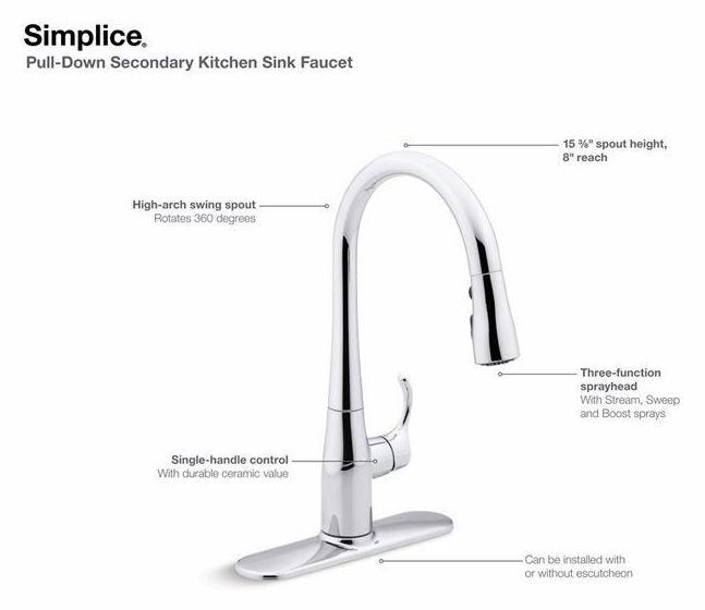 An innovative fit for a variety of kitchens and tasks, this Simplice bar or prep sink faucet combines an elegant, universal design with exceptional ergonomics and functionality. The high-arch swing spout rotates 360 degrees, while the smoothly maneuvering sprayhead pulls down into the sink for up-close tasks, or out of the sink to fill pots. Sculpted buttons on the sprayhead ensure simple operation even with wet, soapy hands. Sweep spray creates a wide, forceful blade of water for superior cleaning. Kohler's docking system, DockNetik, secures the pull-down sprayhead to the spout.