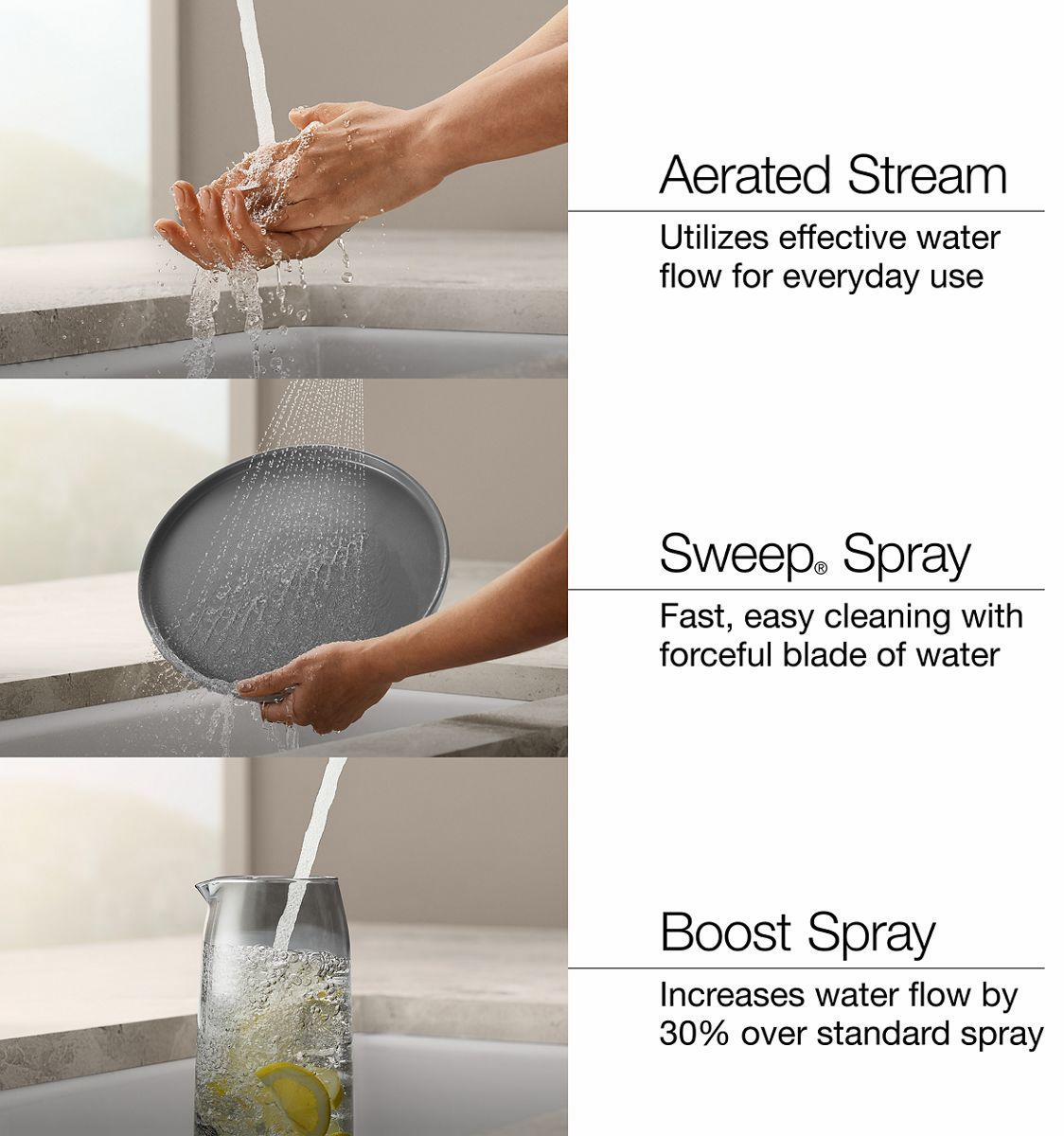 - Sweep® spray features specially angled nozzles that form a wide, powerful blade of water to sweep your dishes and sink clean