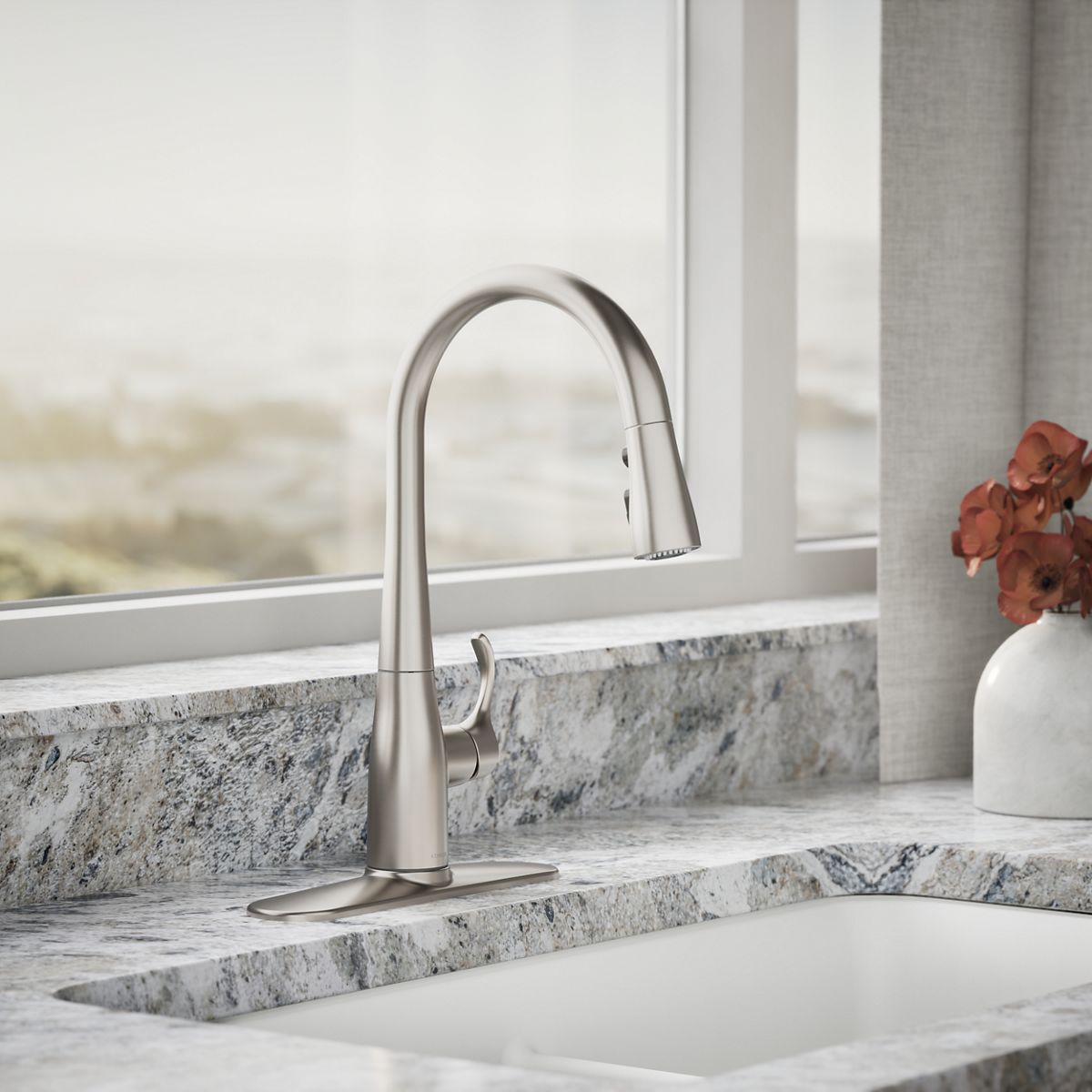 An innovative fit for a variety of kitchens and tasks, this Simplice bar or prep sink faucet combines an elegant, universal design with exceptional ergonomics and functionality. The high-arch swing spout rotates 360 degrees, while the smoothly maneuvering sprayhead pulls down into the sink for up-close tasks, or out of the sink to fill pots. Sculpted buttons on the sprayhead ensure simple operation even with wet, soapy hands. Sweep spray creates a wide, forceful blade of water for superior cleaning. Kohler's docking system, DockNetik, secures the pull-down sprayhead to the spout.
